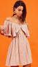 Vestido curto confeccionado em poliviscose texturizado com aspecto de linho. Possui decote ombro a ombro com elástico, tirinhas no meio para amarração no pescoço, top em lastex franzido, e babado sobreposto em todo o busto e costas. A saia possui forro e é separada do busto, fixa somente na frente, deixando uma abertura em toda a região da cintura, que possui elástico.