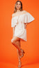 Vestido curto confeccionado em poliviscose texturizado com aspecto de linho. Possui decote ombro a ombro com elástico, tirinhas no meio para amarração no pescoço, top em lastex franzido, e babado sobreposto em todo o busto e costas. A saia possui forro e é separada do busto, fixa somente na frente, deixando uma abertura em toda a região da cintura, que possui elástico.