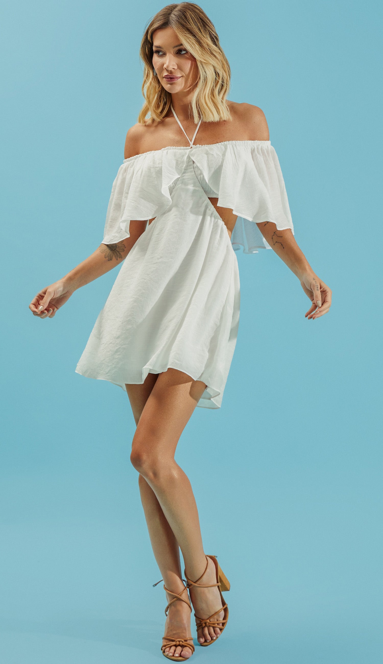 Vestido curto confeccionado em poliviscose texturizado com aspecto de linho. Possui decote ombro a ombro com elástico, tirinhas no meio para amarração no pescoço, top em lastex franzido, e babado sobreposto em todo o busto e costas. A saia possui forro e é separada do busto, fixa somente na frente, deixando uma abertura em toda a região da cintura, que possui elástico.