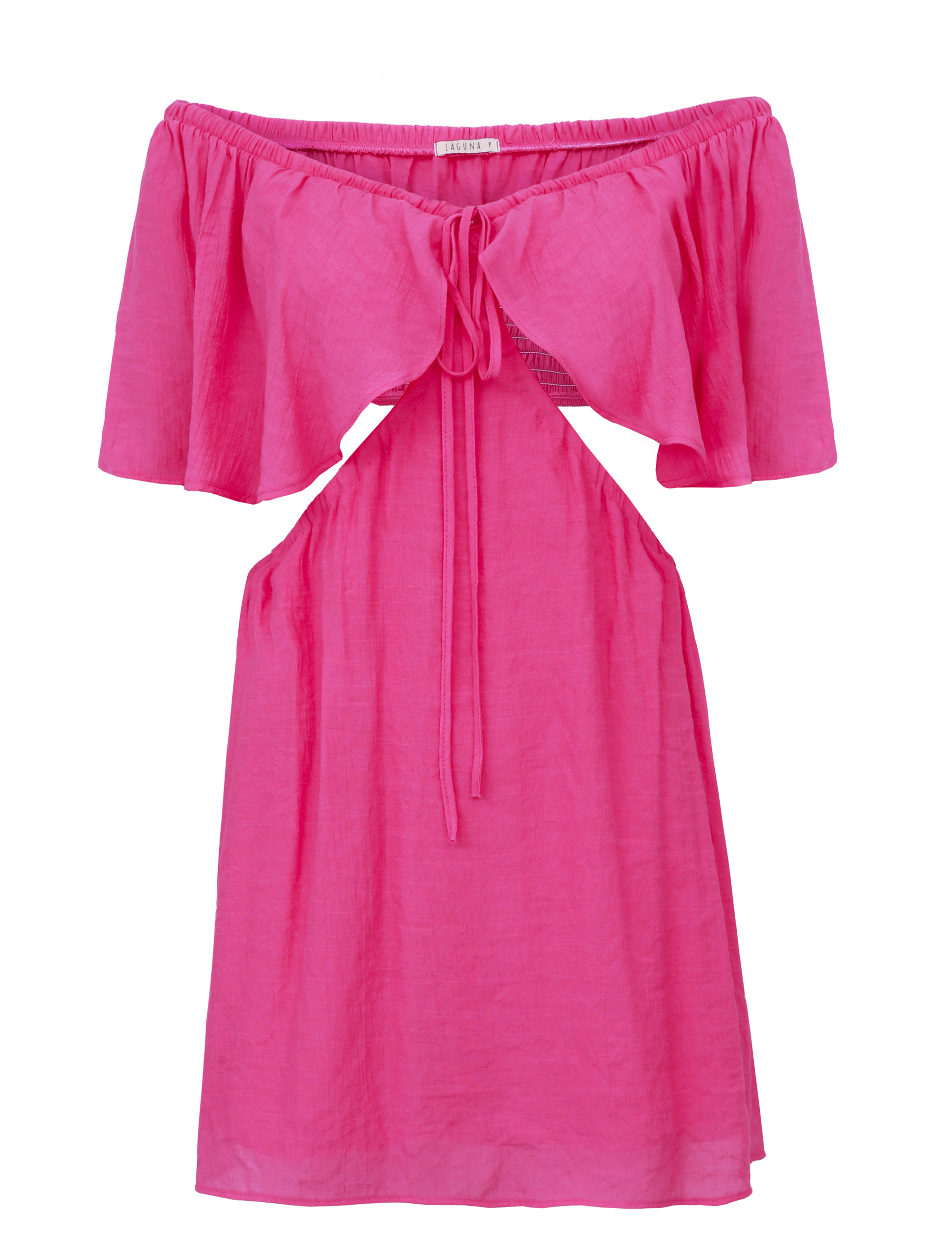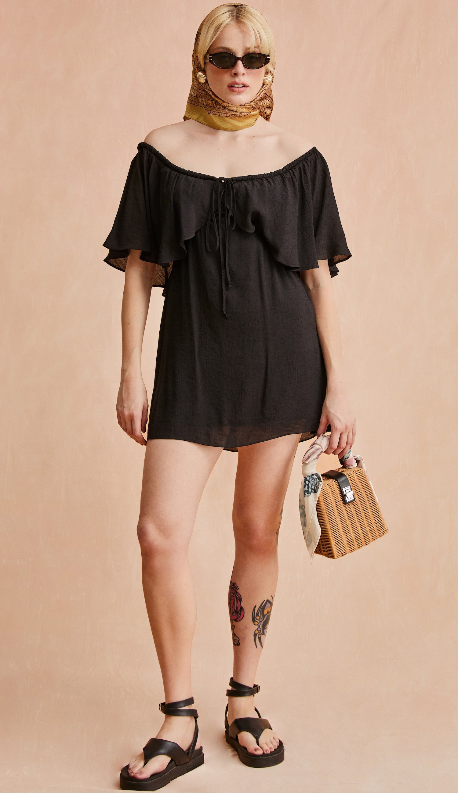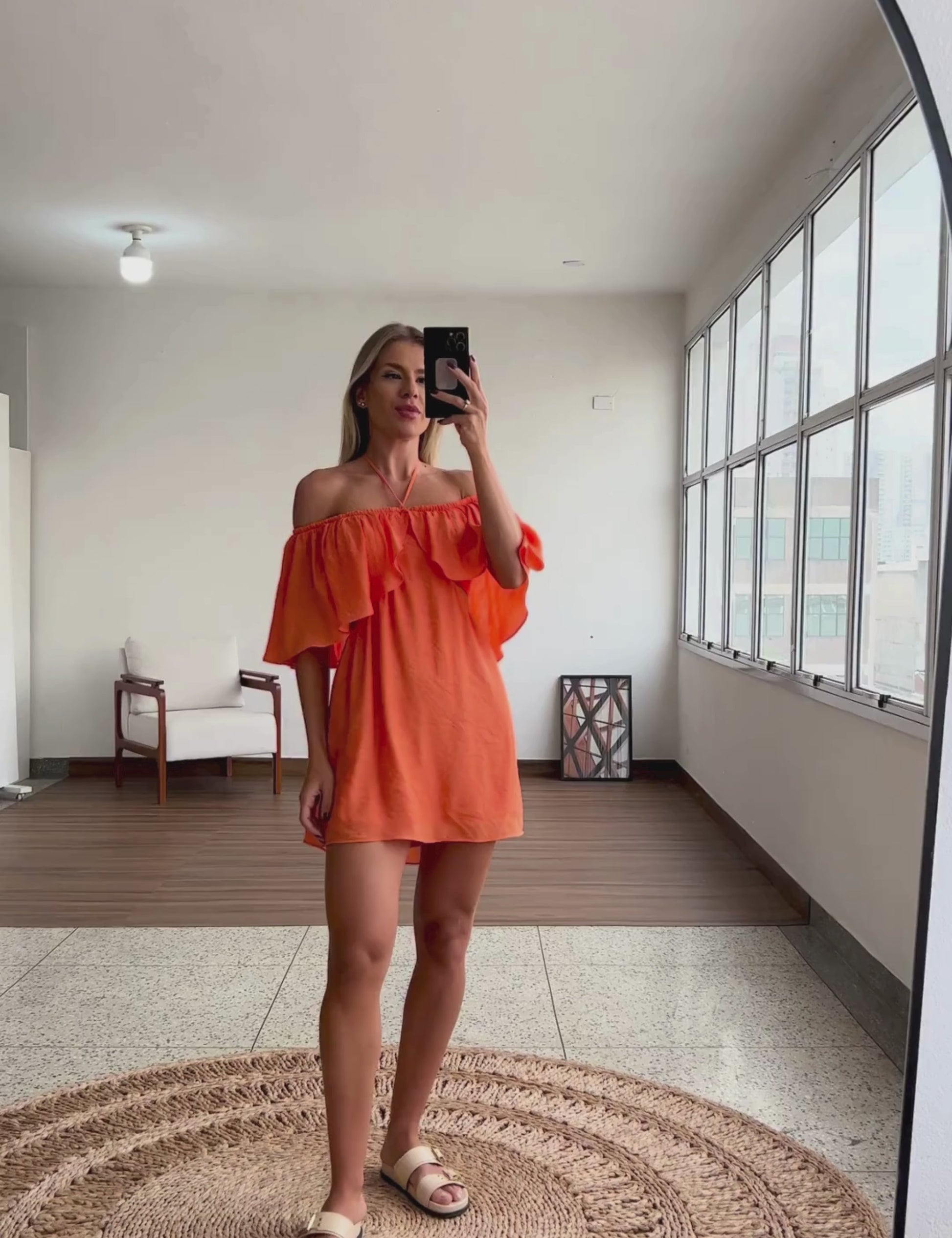 Vestido curto confeccionado em poliviscose texturizado com aspecto de linho. Possui decote ombro a ombro com elástico, tirinhas no meio para amarração no pescoço, top em lastex franzido, e babado sobreposto em todo o busto e costas. A saia possui forro e é separada do busto, fixa somente na frente, deixando uma abertura em toda a região da cintura, que possui elástico.
