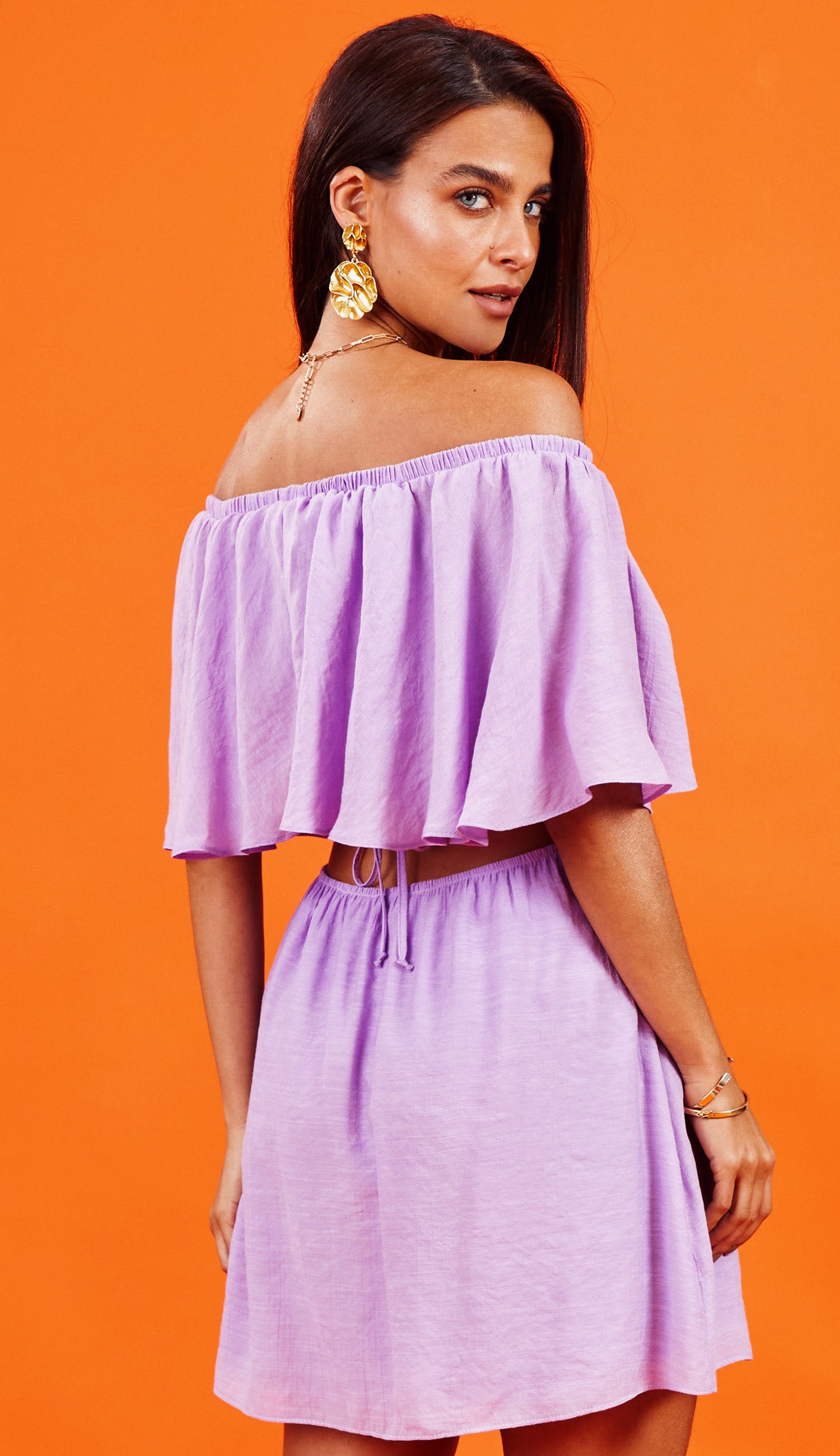 Vestido curto confeccionado em poliviscose texturizado com aspecto de linho. Possui decote ombro a ombro com elástico, tirinhas no meio para amarração no pescoço, top em lastex franzido, e babado sobreposto em todo o busto e costas. A saia possui forro e é separada do busto, fixa somente na frente, deixando uma abertura em toda a região da cintura, que possui elástico.