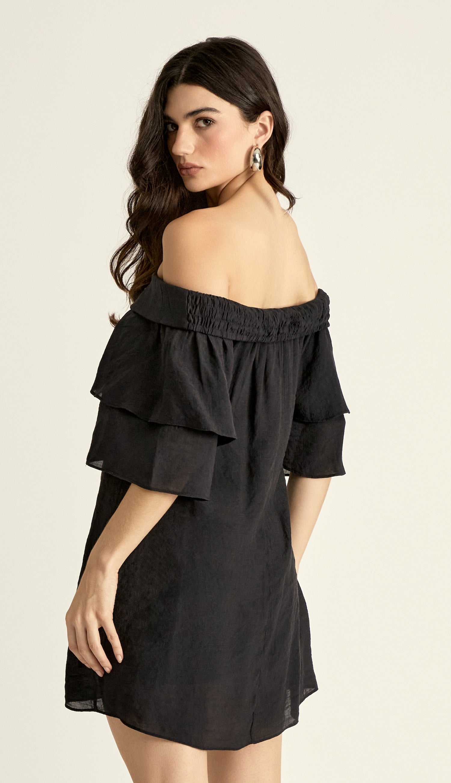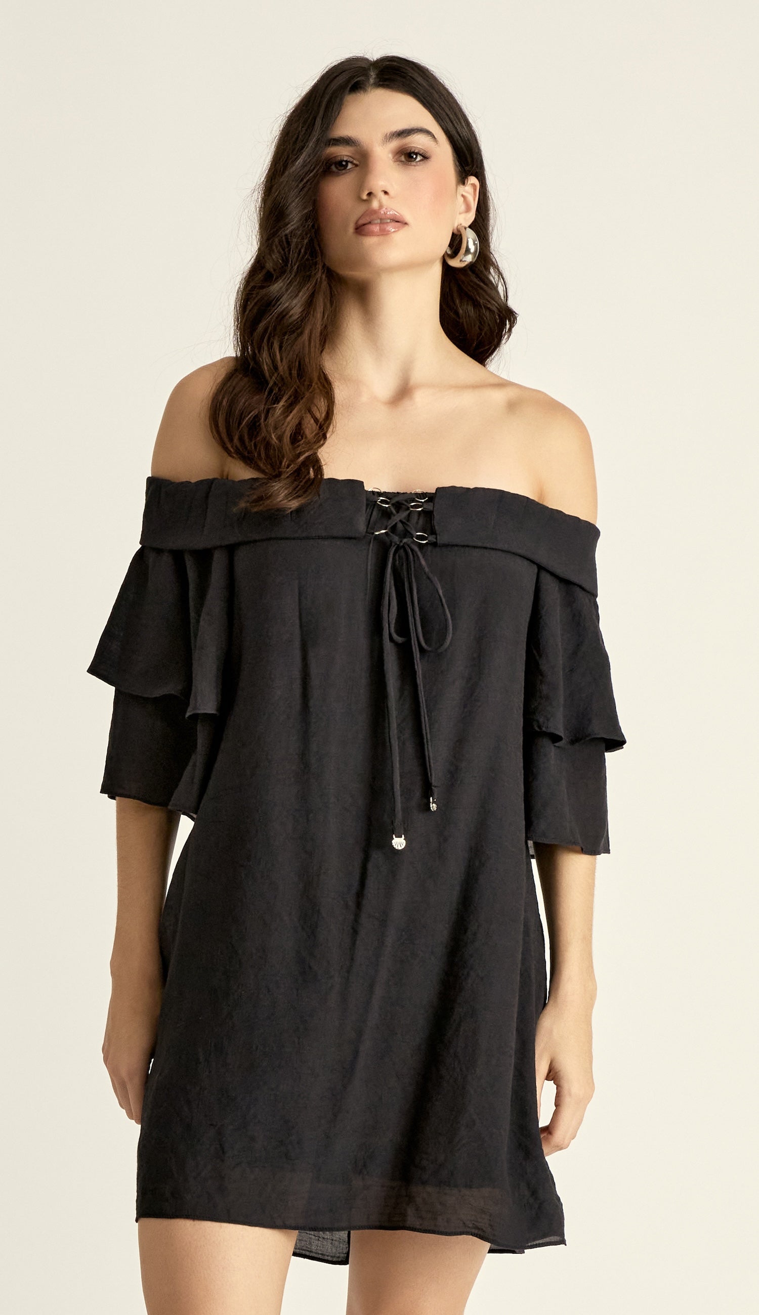 Vestido curto com forro, confeccionado em poliviscose texturizado com aspecto de linho e efeito amassadinho. Possui modelagem soltinha, decote ciganinha com elástico e pala dobrada sobreposta ao decote com lastex atrás e detalhe de argolinhas de metal com tirinha para transpasse e amarração na frente que tem ponteiras de metal em formato de conchinha; e conta ainda com mangas 3/4 sino com duas camadas de babados.
