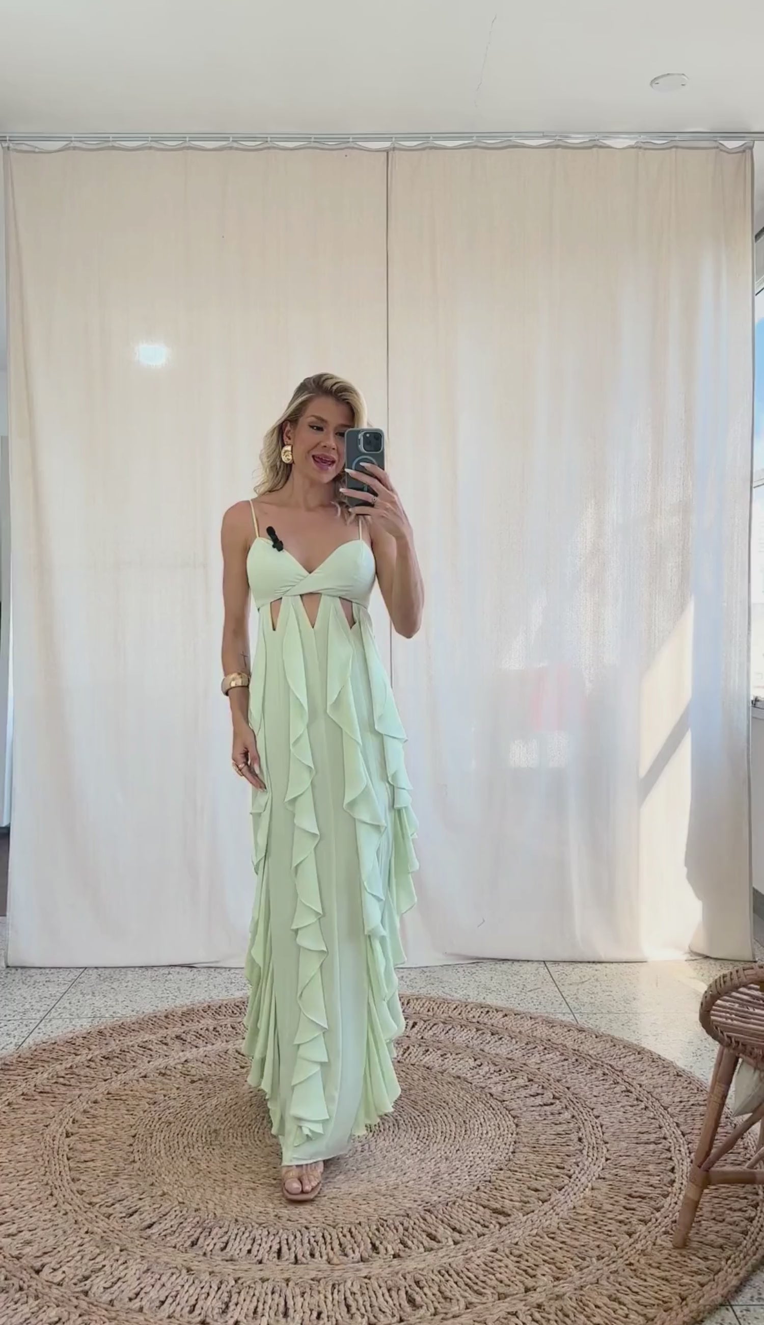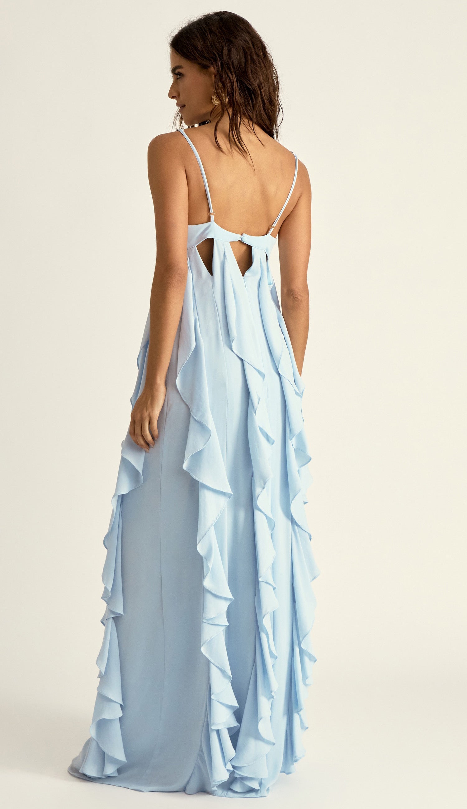 Vestido longo confeccionado em crepe leve com forro na peça inteira. Possui decote em V, alcinhas reguláveis, fechamento traseiro por botão esmaltado e zíper invisível, charmosos recortes vazados geométricos abaixo do busto e aplicações de fileiras de babados em cascata em todo o comprimento da peça, que deixa o look bem fluido e com um lindo movimento.