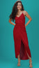 Vestido longo com forro, confeccionado em crepe texturizado mais encorpadinho com aspecto de linho. Possui decote em V com fechamento frontal por botões forrados até a cintura, onde possui um recorte com vazado frontal e faixas fixas para amarração na saia, parecendo um conjunto de colete e saia. Conta ainda com alcinhas reguláveis, elástico franzido nas costas e fenda frontal deixando a frente da saia mais curta, no estilo mullet.