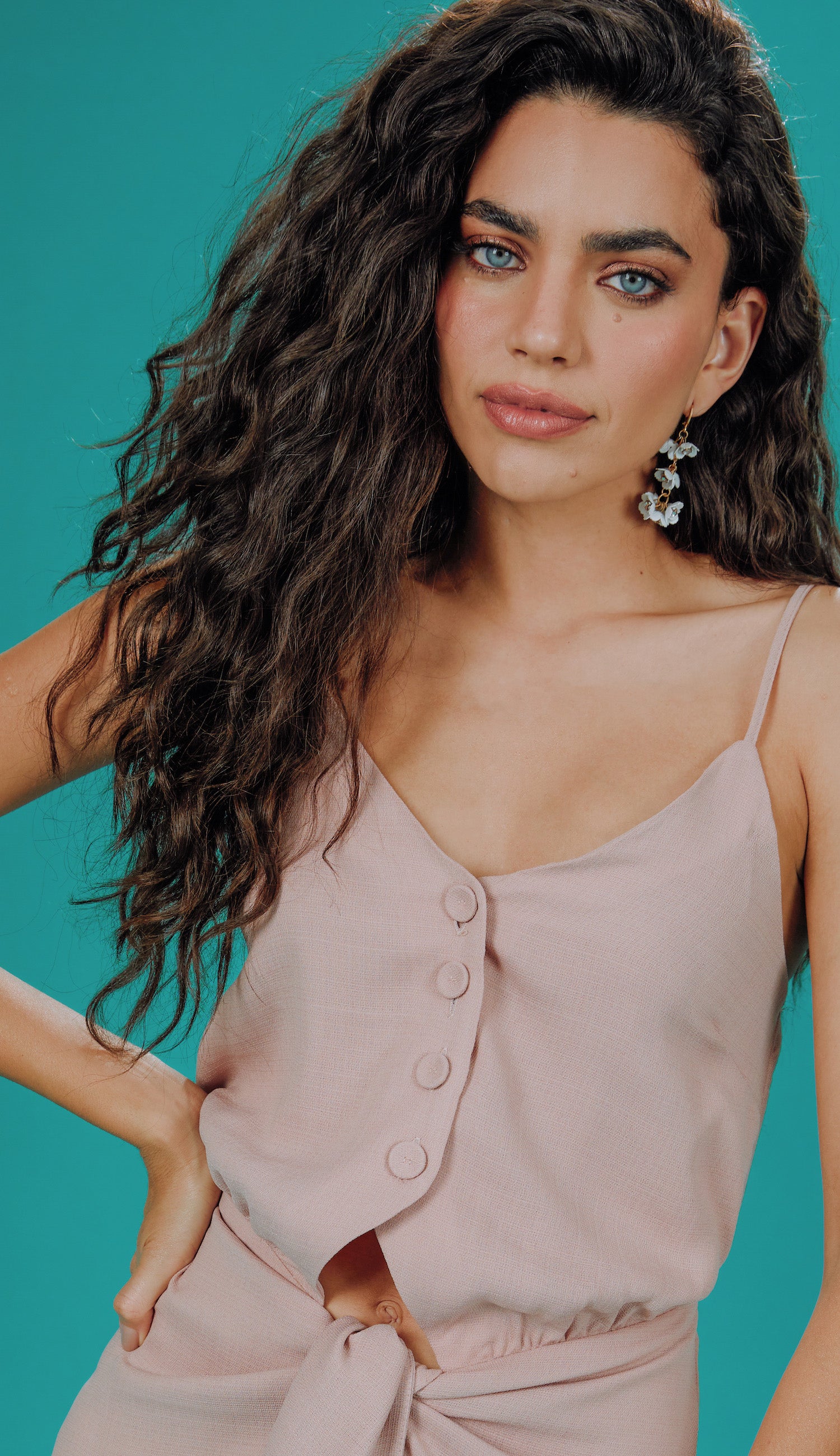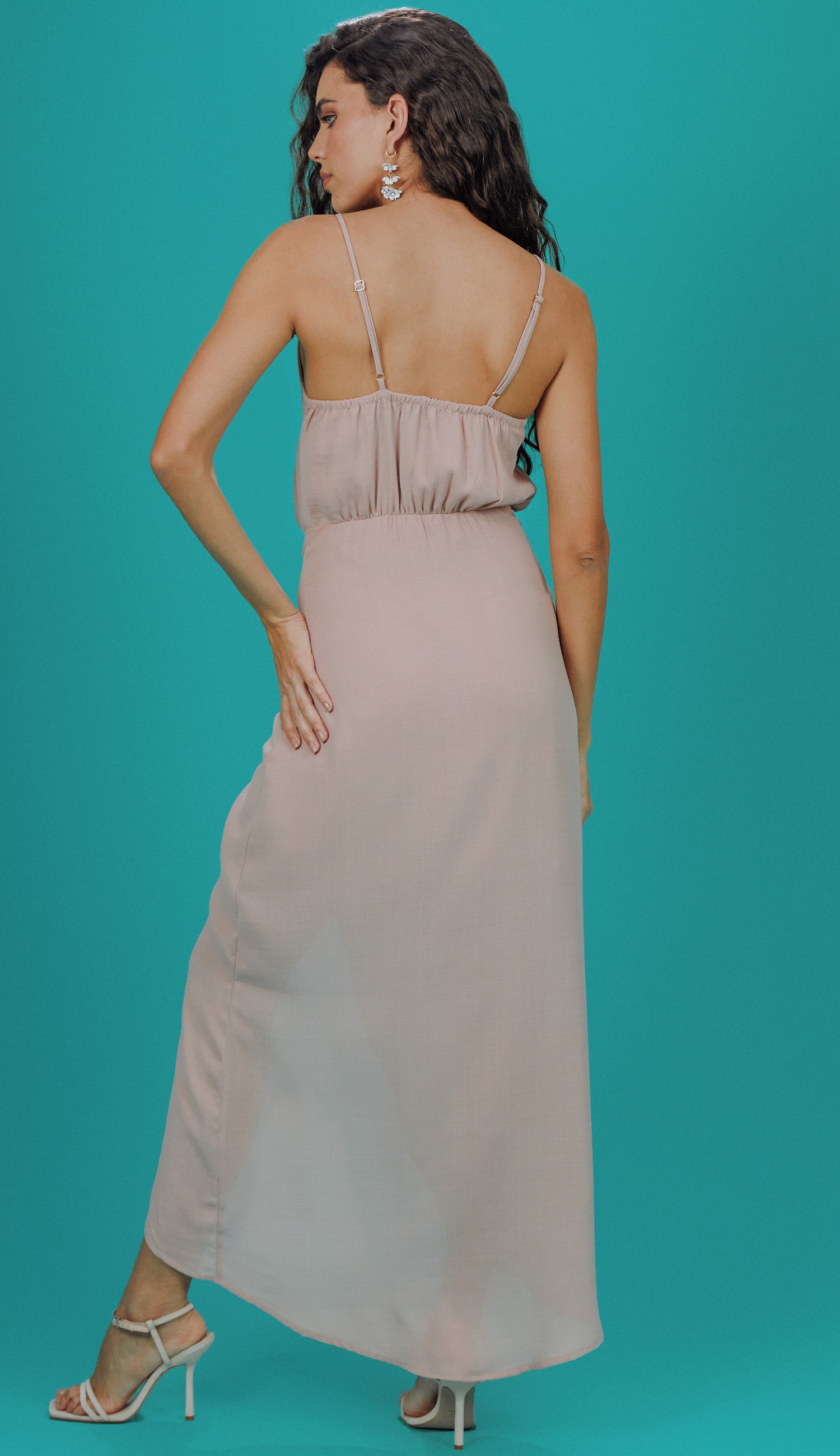 Vestido longo com forro, confeccionado em crepe texturizado mais encorpadinho com aspecto de linho. Possui decote em V com fechamento frontal por botões forrados até a cintura, onde possui um recorte com vazado frontal e faixas fixas para amarração na saia, parecendo um conjunto de colete e saia. Conta ainda com alcinhas reguláveis, elástico franzido nas costas e fenda frontal deixando a frente da saia mais curta, no estilo mullet.