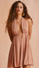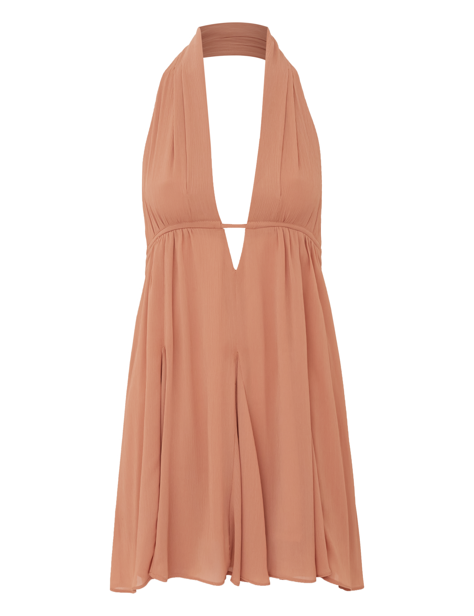 Vestido curto frente única confeccionado em crepe leve texturizado com forro na saia. Possui tecido duplo no busto para não ficar transparente; faixa única que une as duas partes do busto atrás da nuca, criando um decote em V profundo e aberto com detalhes pregueados; ajuste da silhueta por tirinha embutida logo abaixo do busto com amarração atrás; saia evasê com nesgas e ajuste da saia também nas costas por tirinha embutida para amarração, com ponteiras em formato de conchinhas.