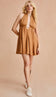 Vestido curto frente única confeccionado em crepe de alfaiataria com forro. Possui faixa única que une as duas partes do busto atrás da nuca, criando um decote em V profundo e aberto com detalhes pregueados; ajuste da silhueta por tirinha embutida logo abaixo do busto com amarração atrás; saia evasê com nesgas e ajuste da saia também nas costas por tirinha embutida para amarração, com ponteiras em formato de conchinhas.