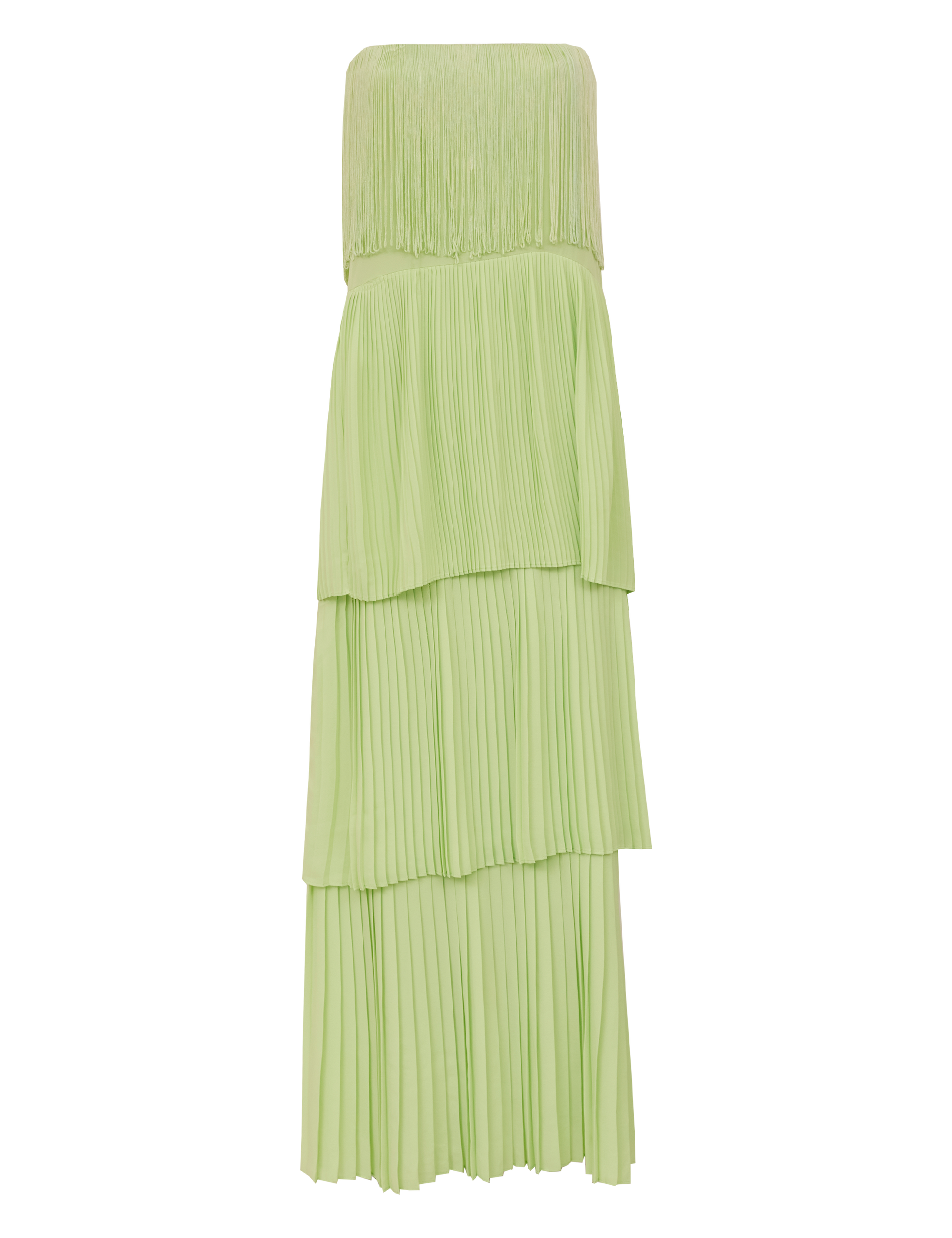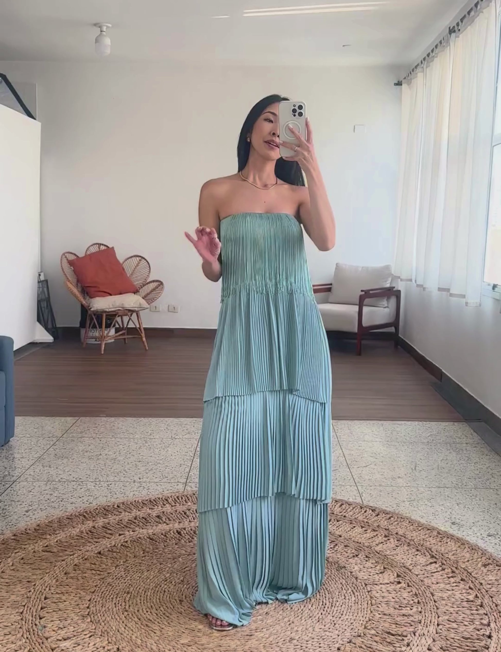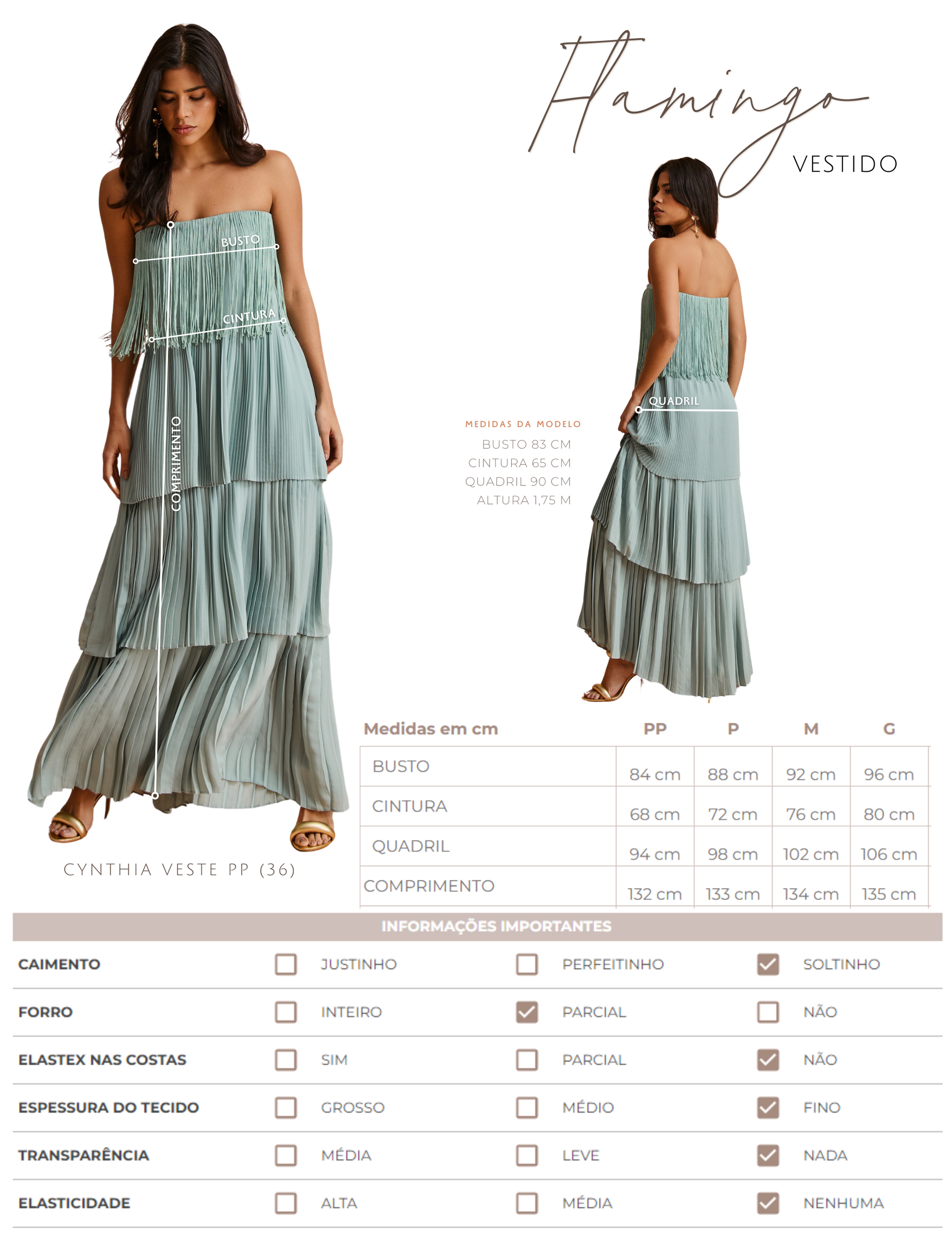 Vestido longo e amplo em camadas plissadas com tamanhos diferentes, confeccionado em crepe com forro. Modelo não possui mangas e conta com elástico interno no decote, para maior segurança e aplicação de franjas no busto. Peça leve e elegante, que permite produções de looks versáteis.