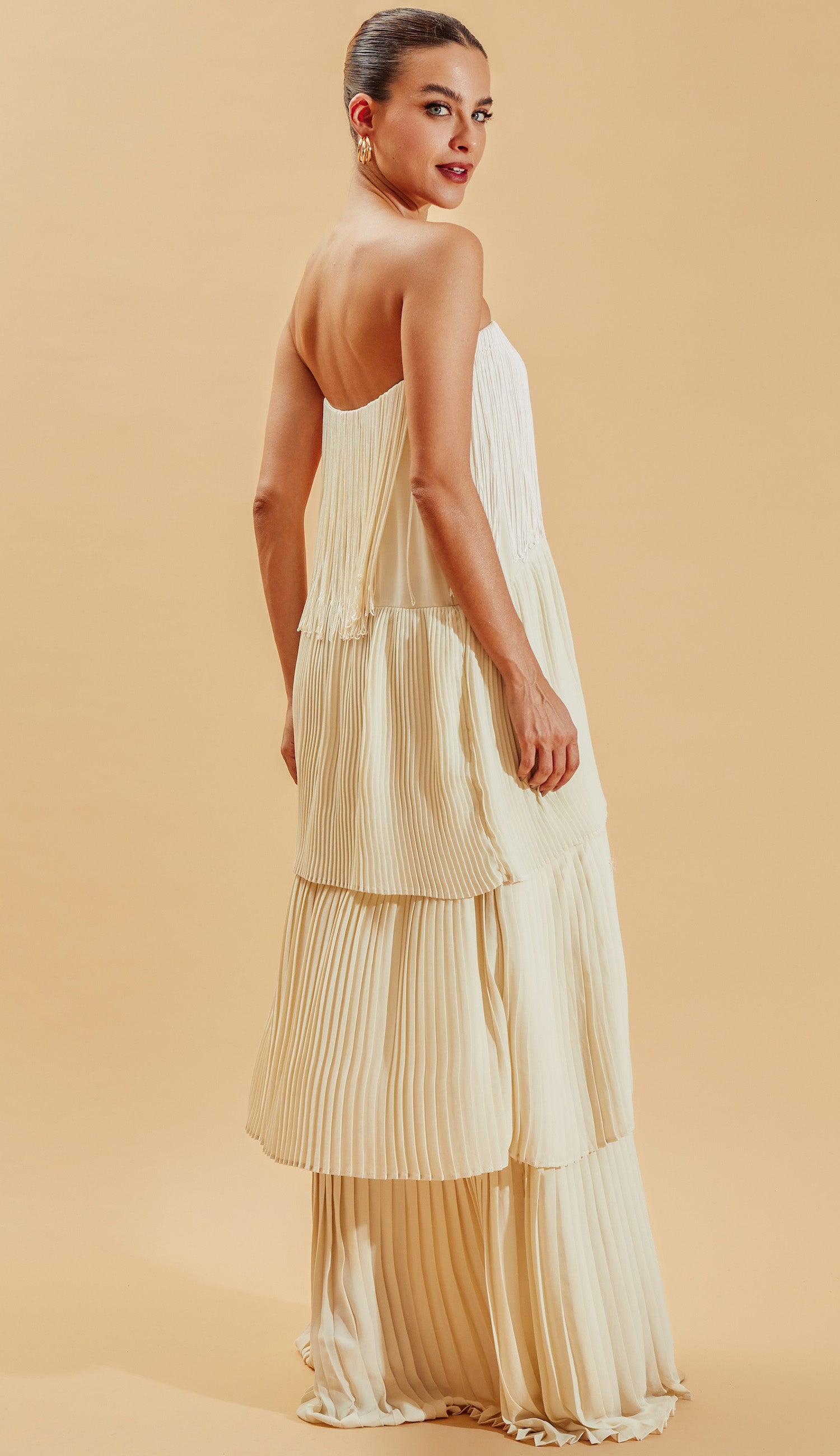 Vestido longo e amplo em camadas plissadas com tamanhos diferentes, confeccionado em crepe com forro. Modelo não possui mangas e conta com elástico interno no decote, para maior segurança e aplicação de franjas no busto. Peça leve e elegante, que permite produções de looks versáteis.