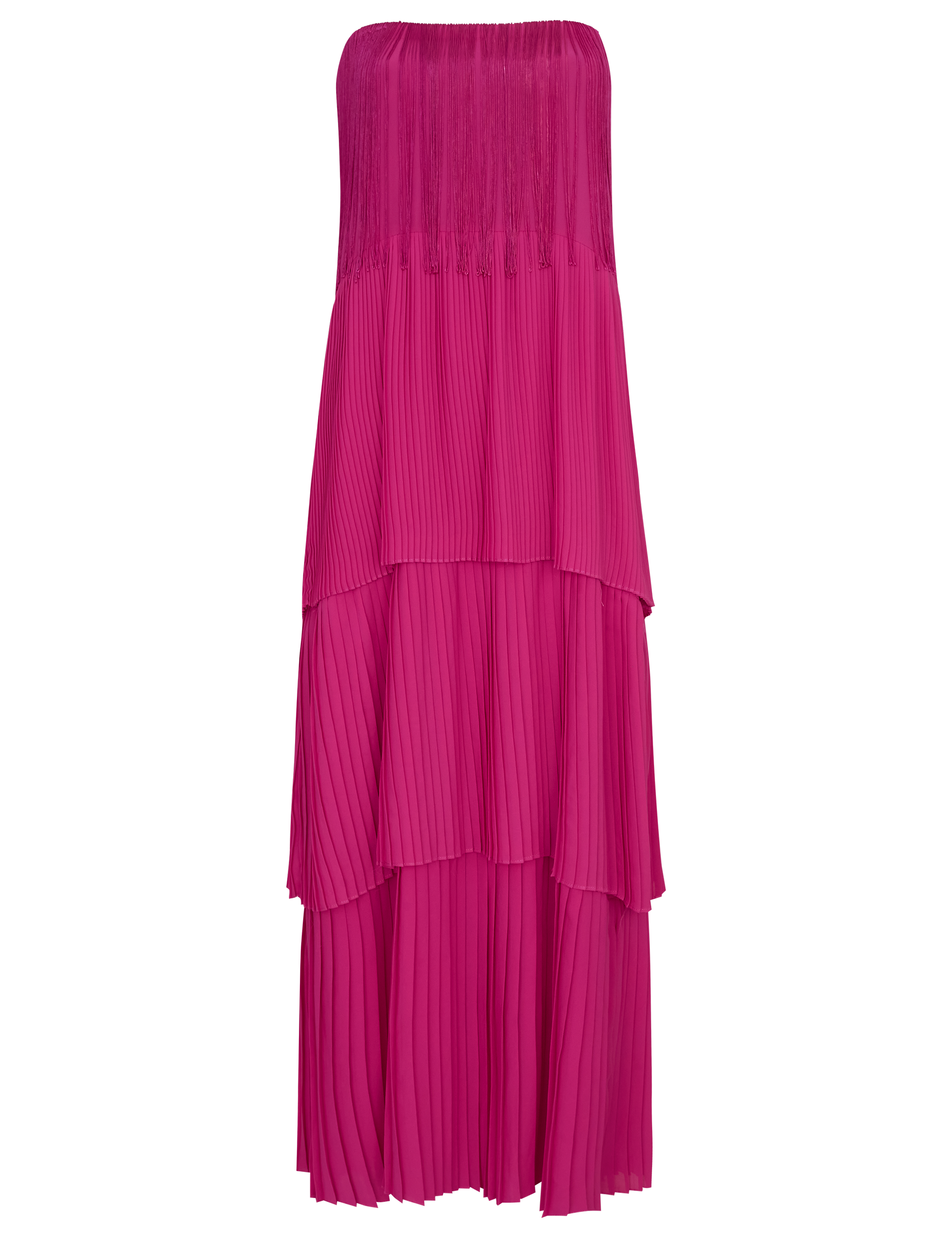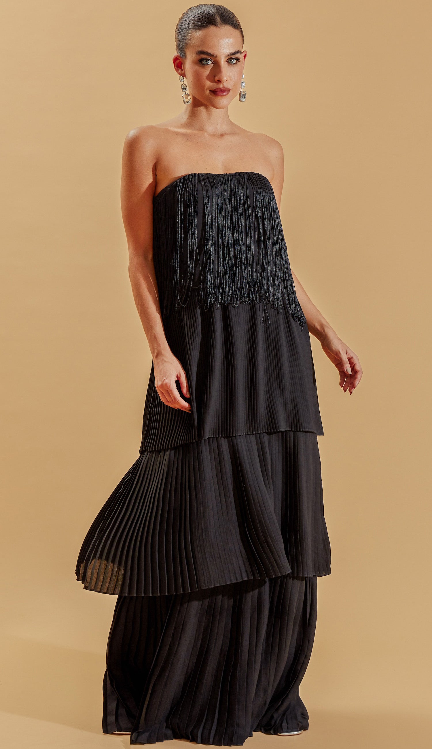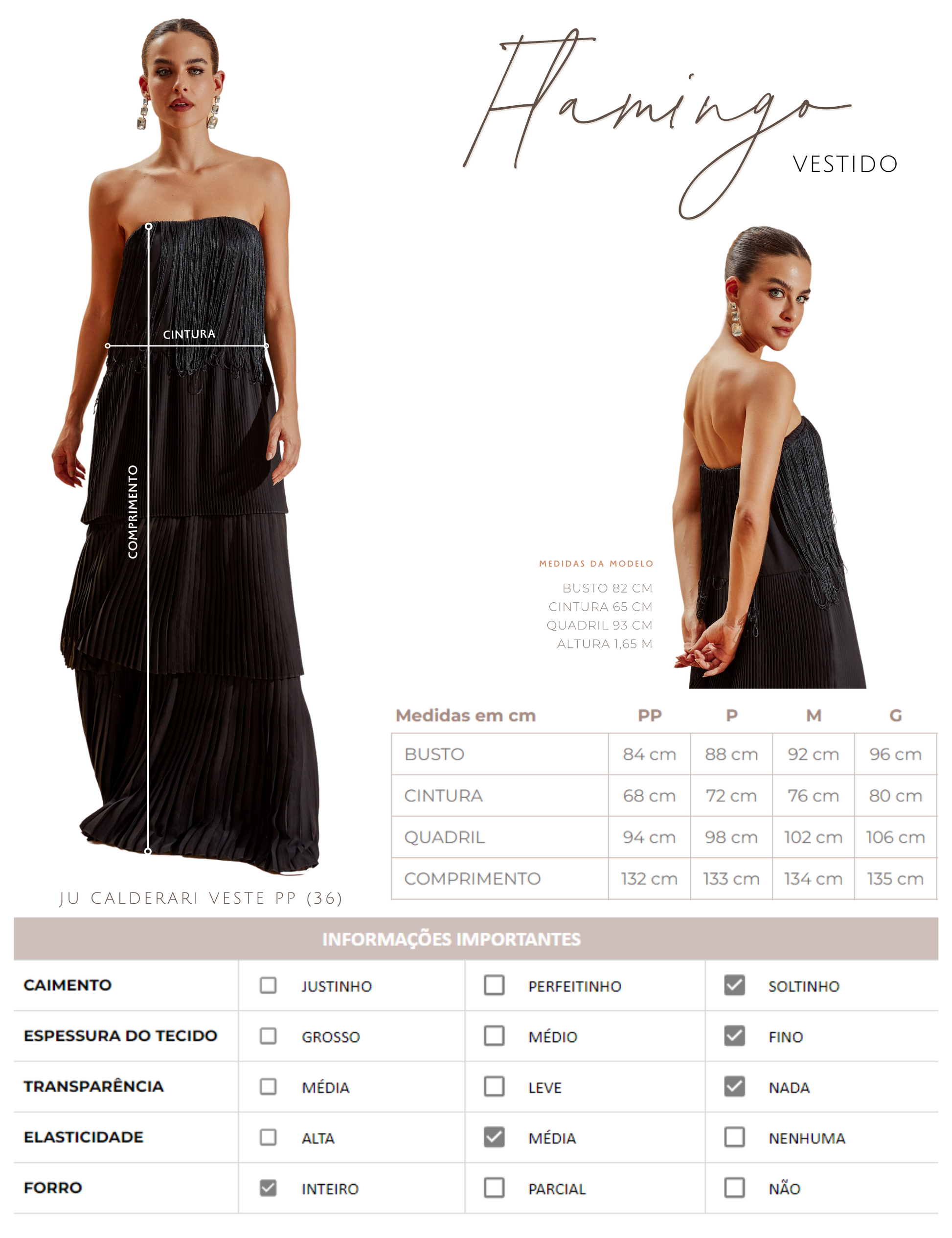 Vestido longo e amplo em camadas plissadas com tamanhos diferentes, confeccionado em crepe com forro. Modelo não possui mangas e conta com elástico interno no decote, para maior segurança e aplicação de franjas no busto. Peça leve e elegante, que permite produções de looks versáteis.