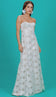 Vestido longo confeccionado em organza bordada com padronagem floral e transparência, que deixa o forro à mostra. Não possui mangas e conta com decote coração com silicone interno para maior segurança, recortes que modelam o busto, modelagem evasê e fechamento traseiro por zíper de metal com pingente que possui o delicado detalhe da conchinha da Laguna gravado no metal, o que dá um charme todo especial à peça.