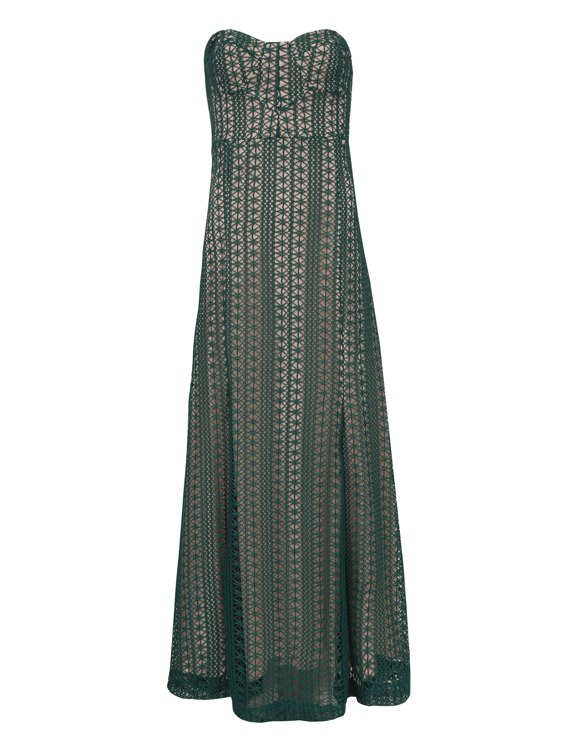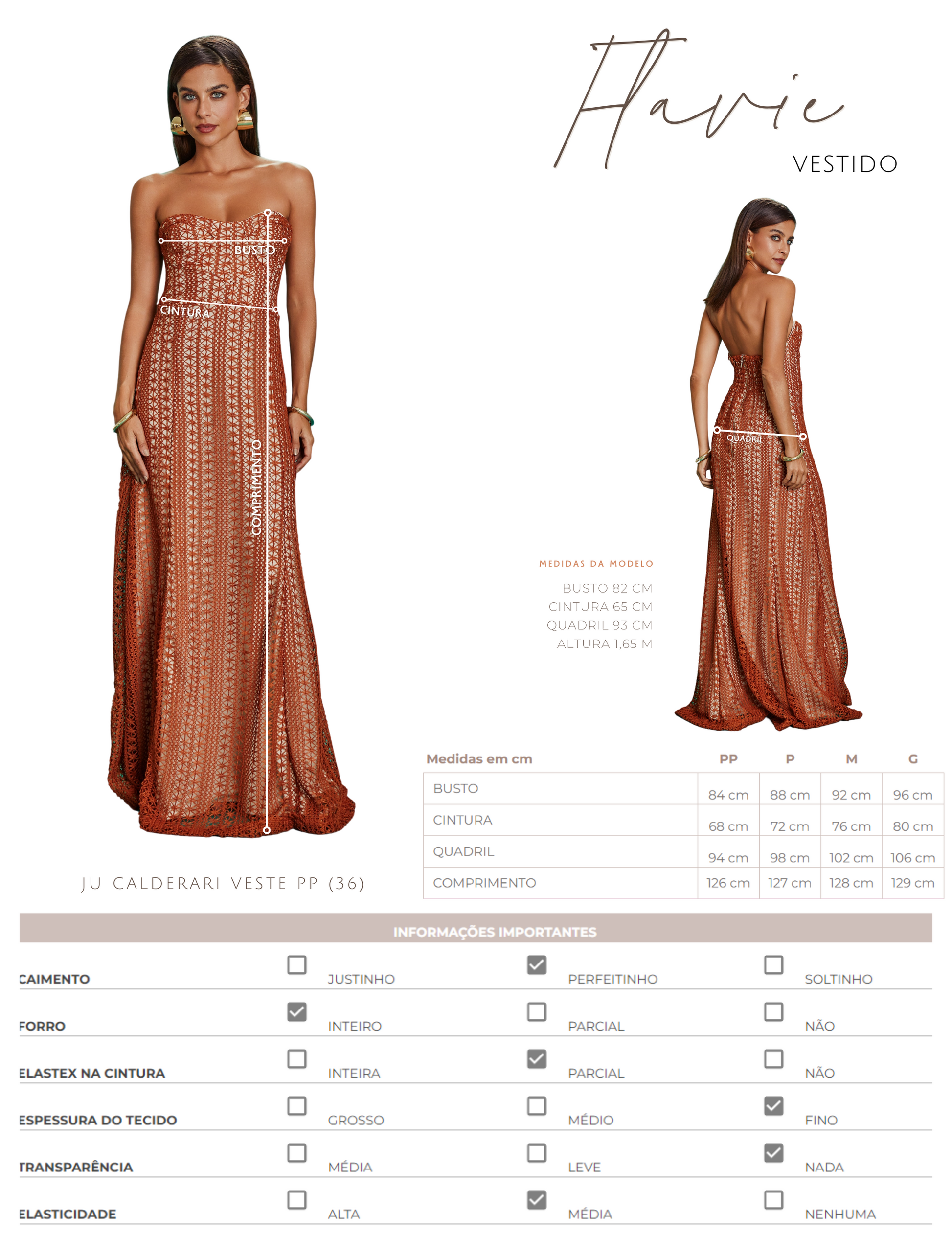Vestido longo confeccionado em renda vazada que deixa o forro à mostra. Não possui mangas e conta com decote coração com silicone interno para maior segurança, recortes que modelam o busto, modelagem evasê, lastex franzido nas costas para maior conforto e fechamento traseiro por zíper de metal com pingente que possui o delicado detalhe da conchinha da Laguna gravado no metal, o que dá um charme todo especial à peça.