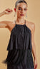 Vestido curto amplo em camadas plissadas com tamanhos diferentes, confeccionado em poliviscose texturizada com aspecto de linho e forro. Possui decote halter com alcinhas reguláveis que se cruzam nas costas, elástico interno nas costas para maior conforto, aplicação de franjas na camada abaixo do busto e fechamento nas costas com botão esmaltado. Peça leve e elegante, que permite produções de looks versáteis.