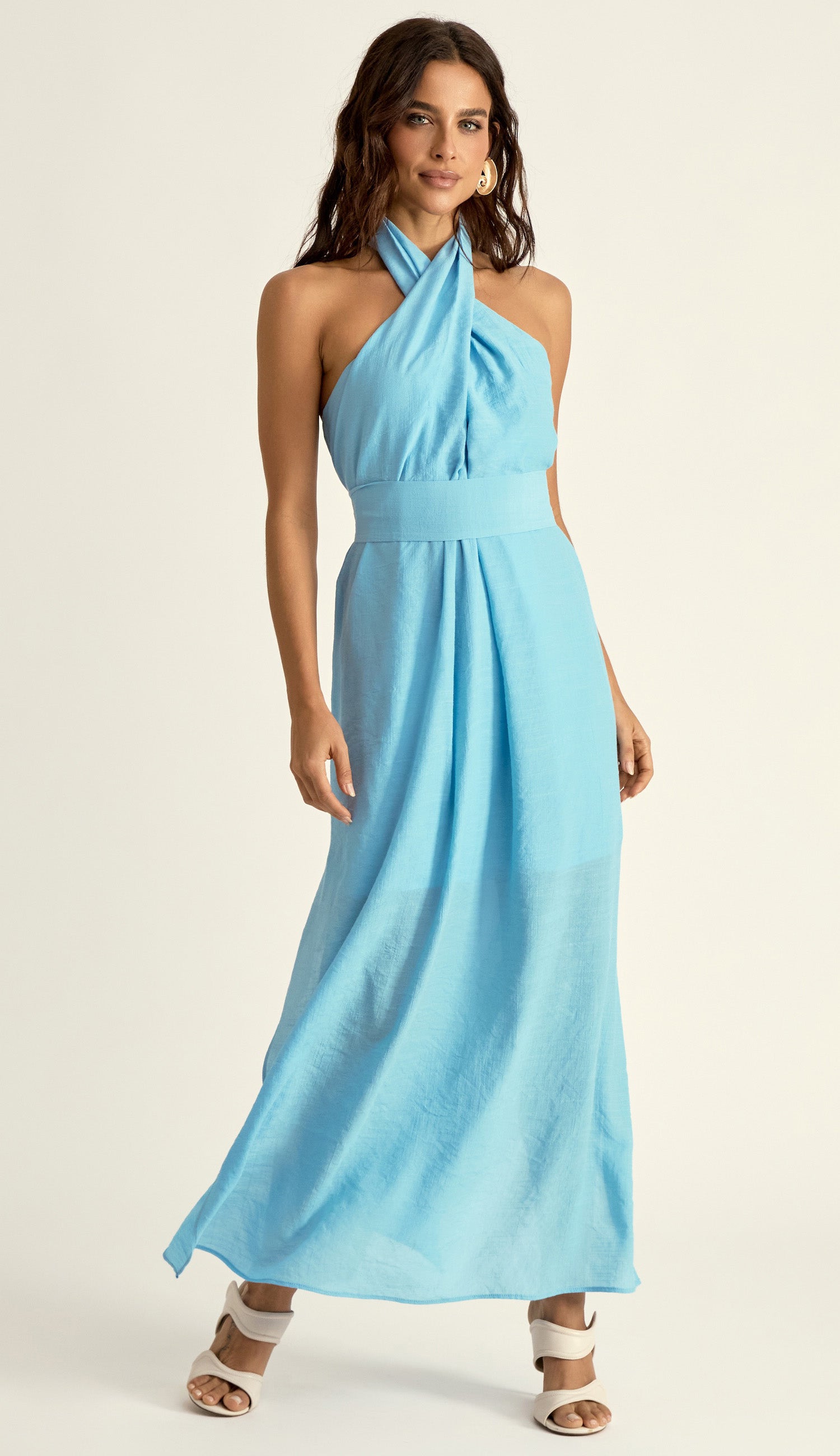 Vestido longo e amplo com forro, confeccionado em poliviscose texturizado com aspecto de linho e efeito amassadinho. Possui modelagem frente única com faixas pregueadas e transpassadas que vão até o pescoço com fechamento por botões esmaltados na nuca, costas nuas, lastex franzido nas costas da saia para melhor ajuste ao corpo, fendas laterais e acompanha faixa solta para amarrar.