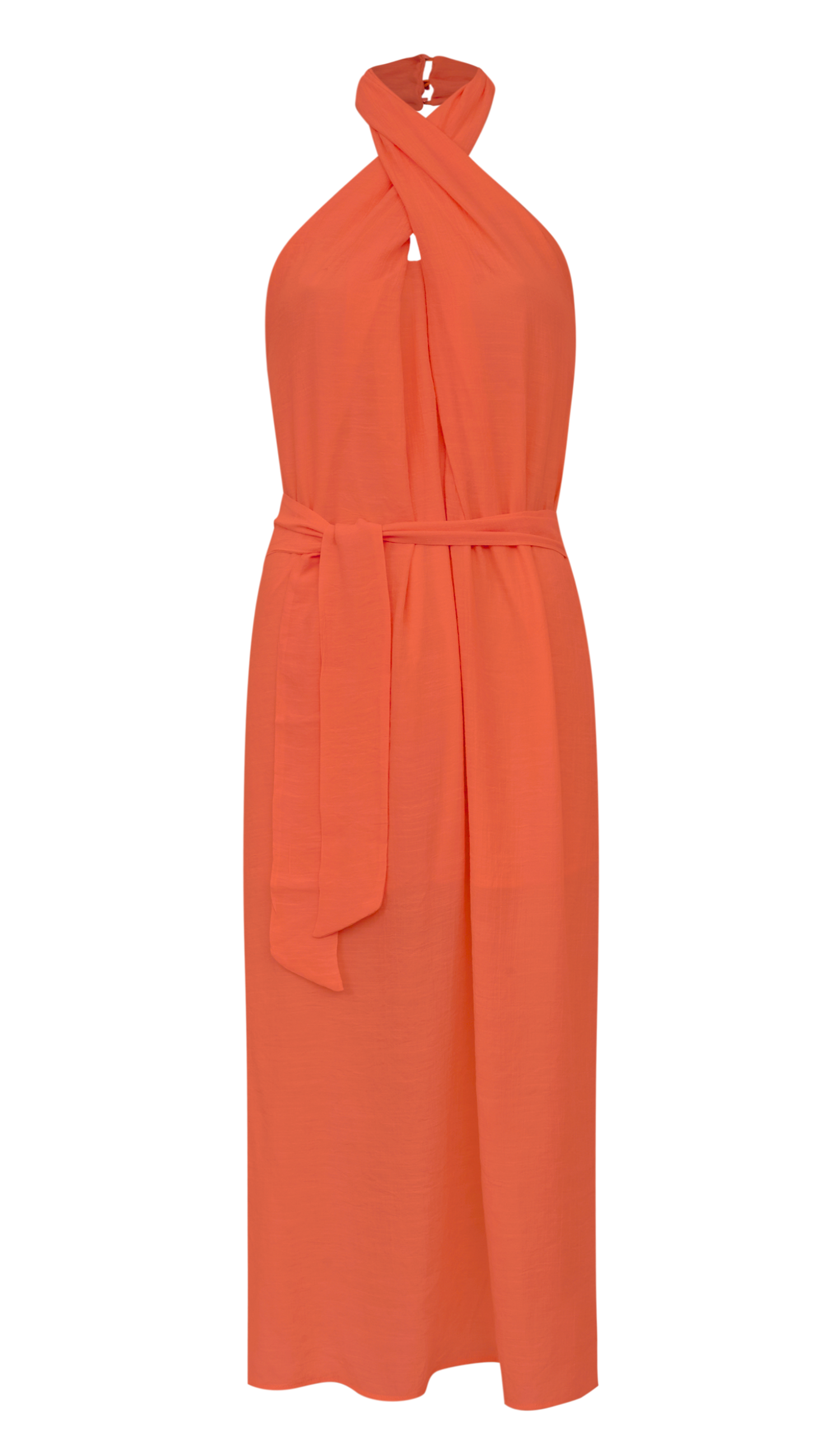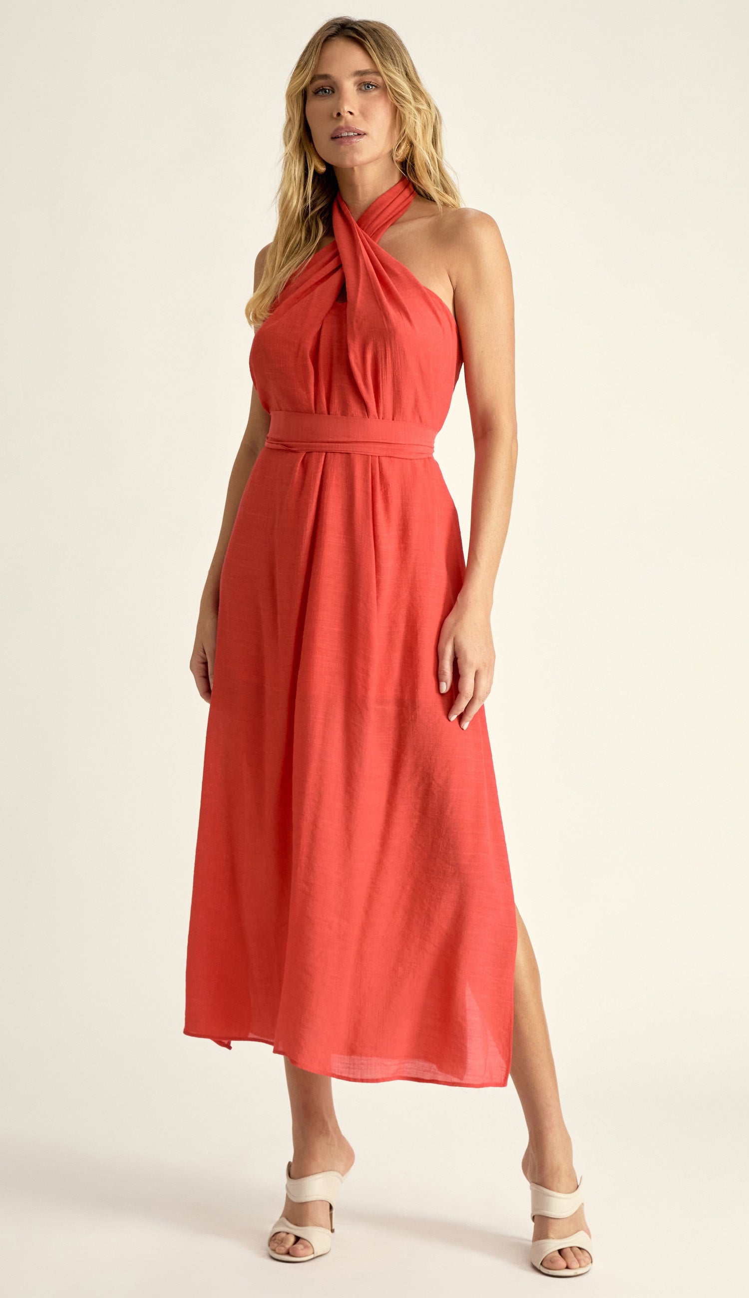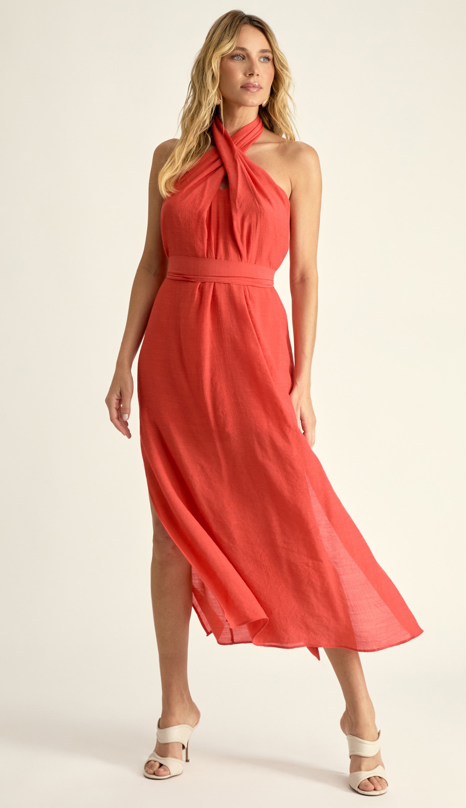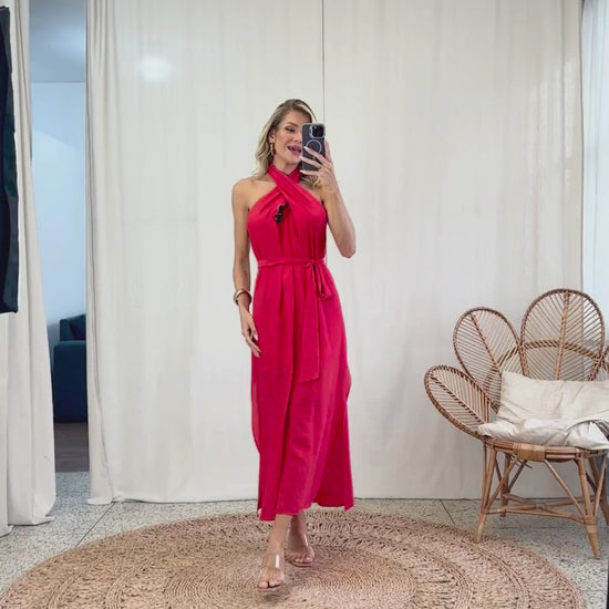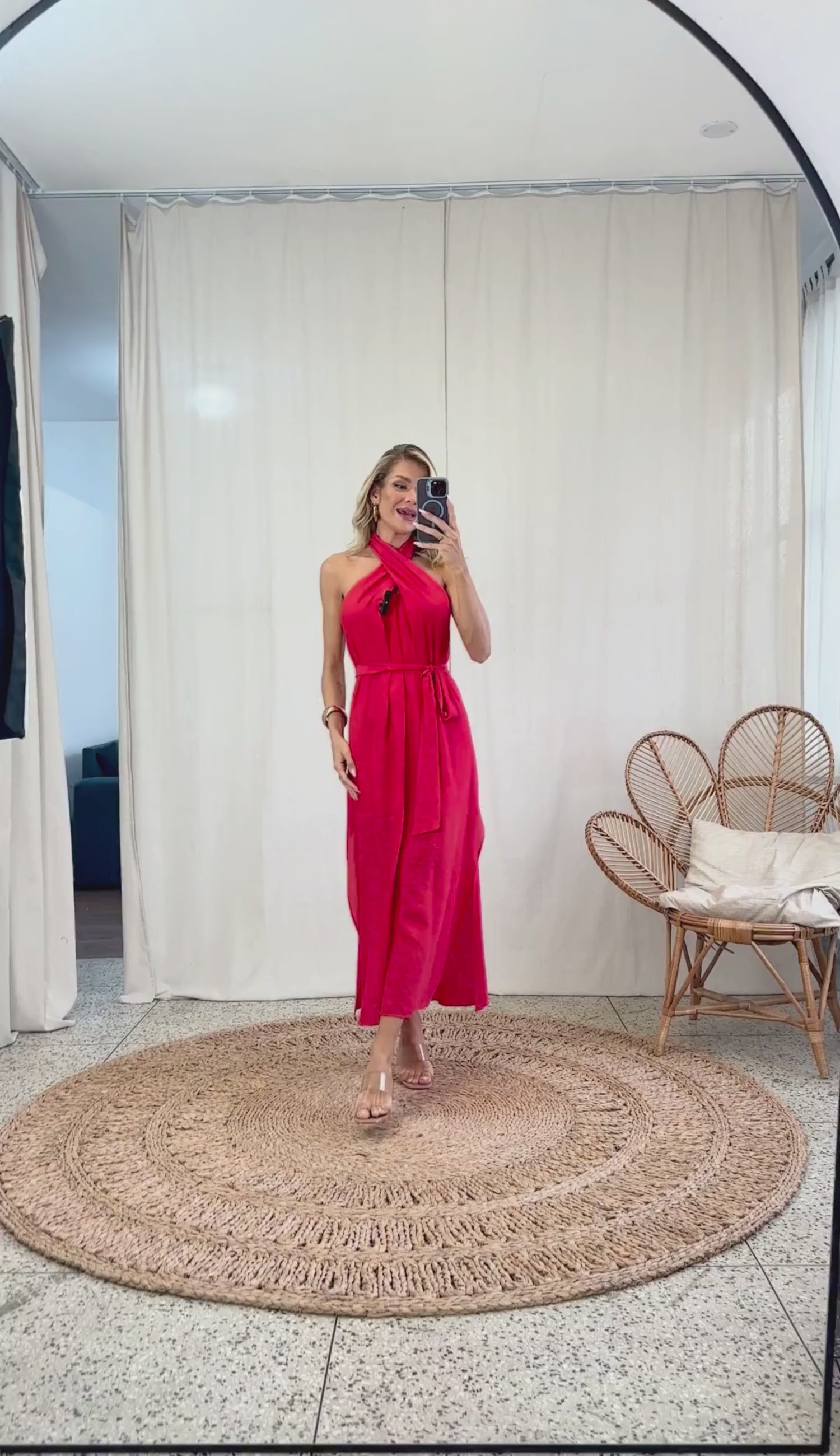 Vestido longo e amplo com forro, confeccionado em poliviscose texturizado com aspecto de linho e efeito amassadinho. Possui modelagem frente única com faixas pregueadas e transpassadas que vão até o pescoço com fechamento por botões esmaltados na nuca, costas nuas, lastex franzido nas costas da saia para melhor ajuste ao corpo, fendas laterais e acompanha faixa solta para amarrar.