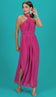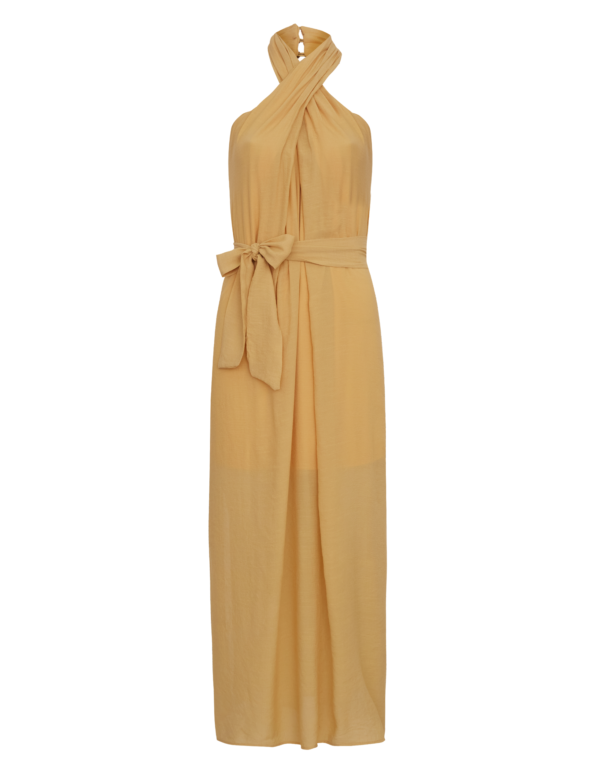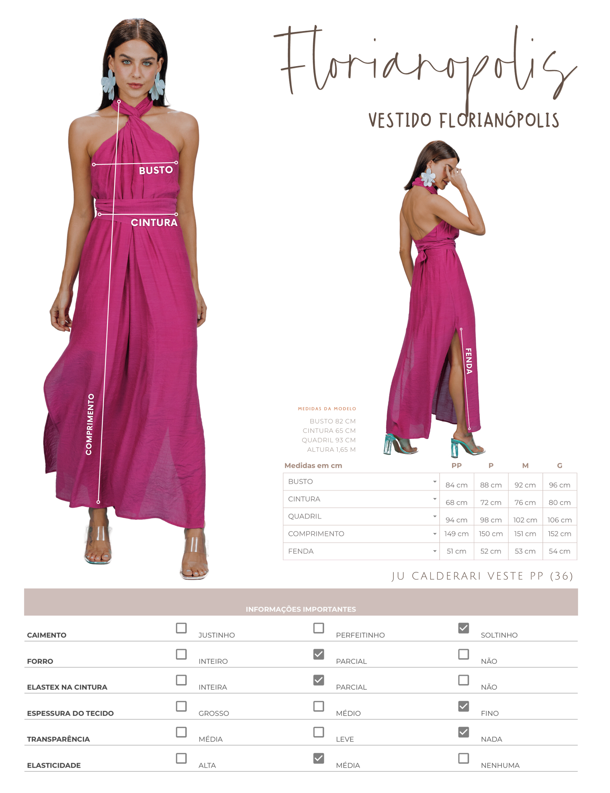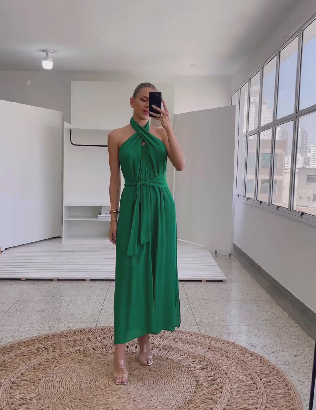 Vestido longo e amplo com forro, confeccionado em poliviscose texturizado com aspecto de linho e efeito amassadinho. Possui modelagem frente única com faixas pregueadas e transpassadas que vão até o pescoço com fechamento por botões esmaltados na nuca, costas nuas, lastex franzido nas costas da saia para melhor ajuste ao corpo, fendas laterais e acompanha faixa solta para amarrar.