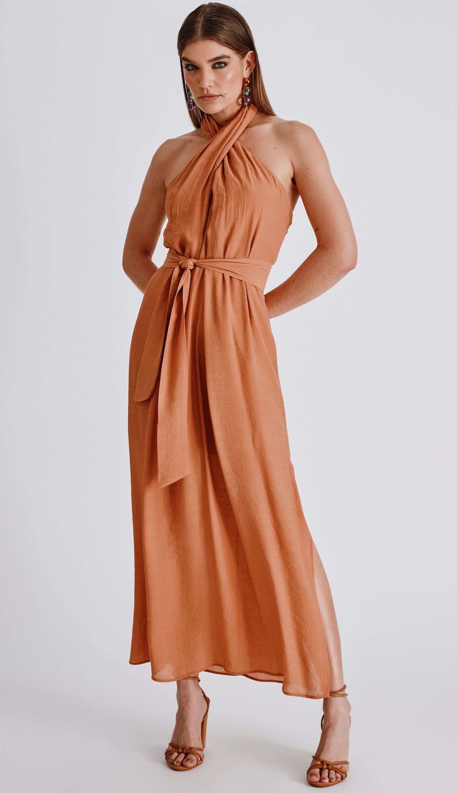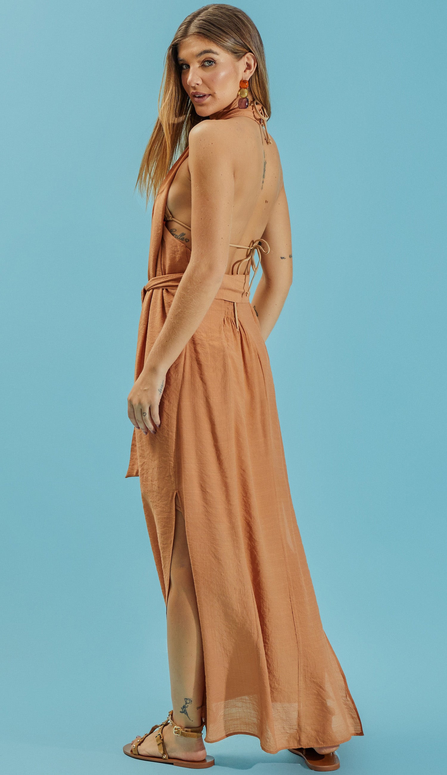 Vestido longo e amplo com forro, confeccionado em poliviscose texturizado com aspecto de linho e efeito amassadinho. Possui modelagem frente única com faixas pregueadas e transpassadas que vão até o pescoço com fechamento por botões esmaltados na nuca, costas nuas, lastex franzido nas costas da saia para melhor ajuste ao corpo, fendas laterais e acompanha faixa solta para amarrar.