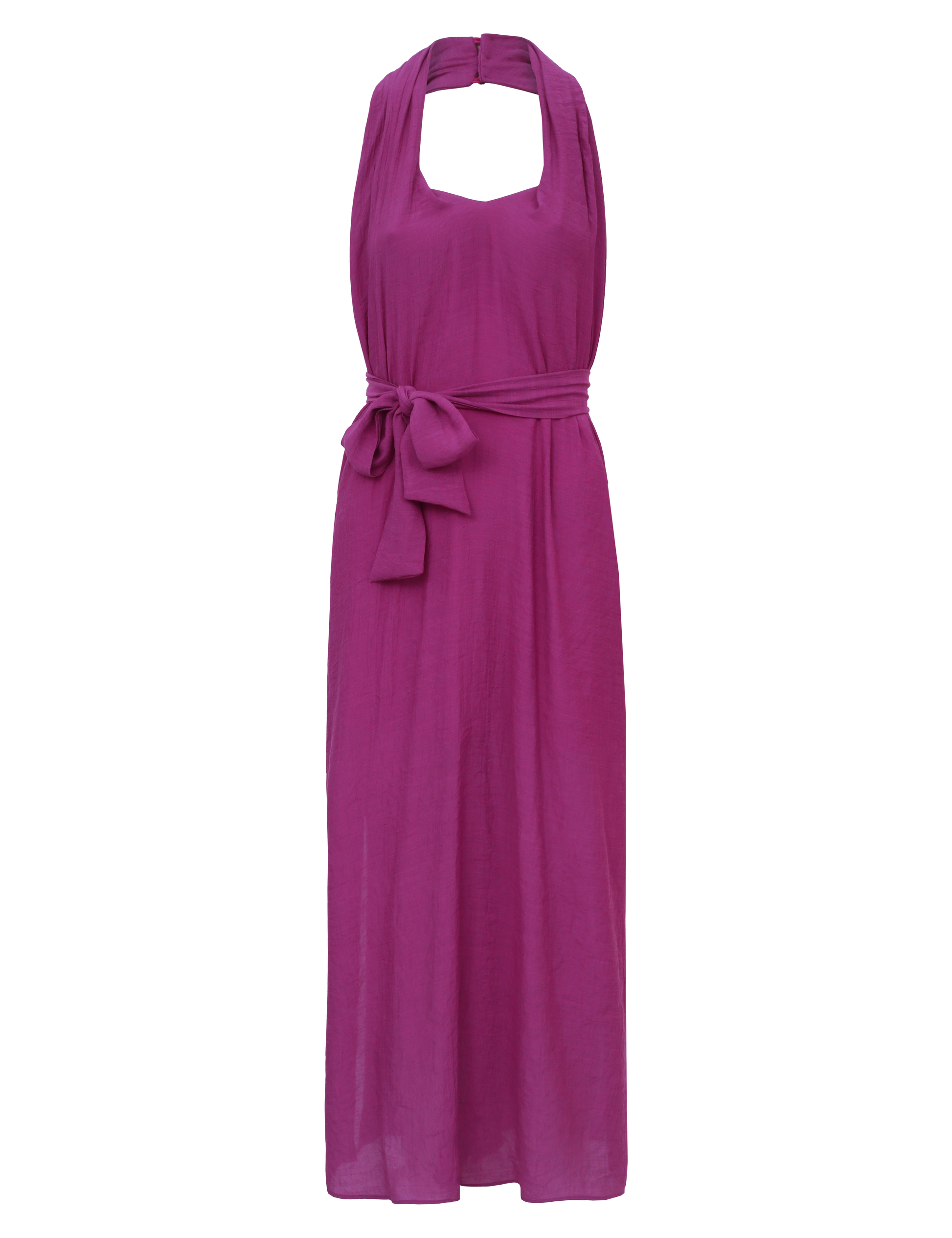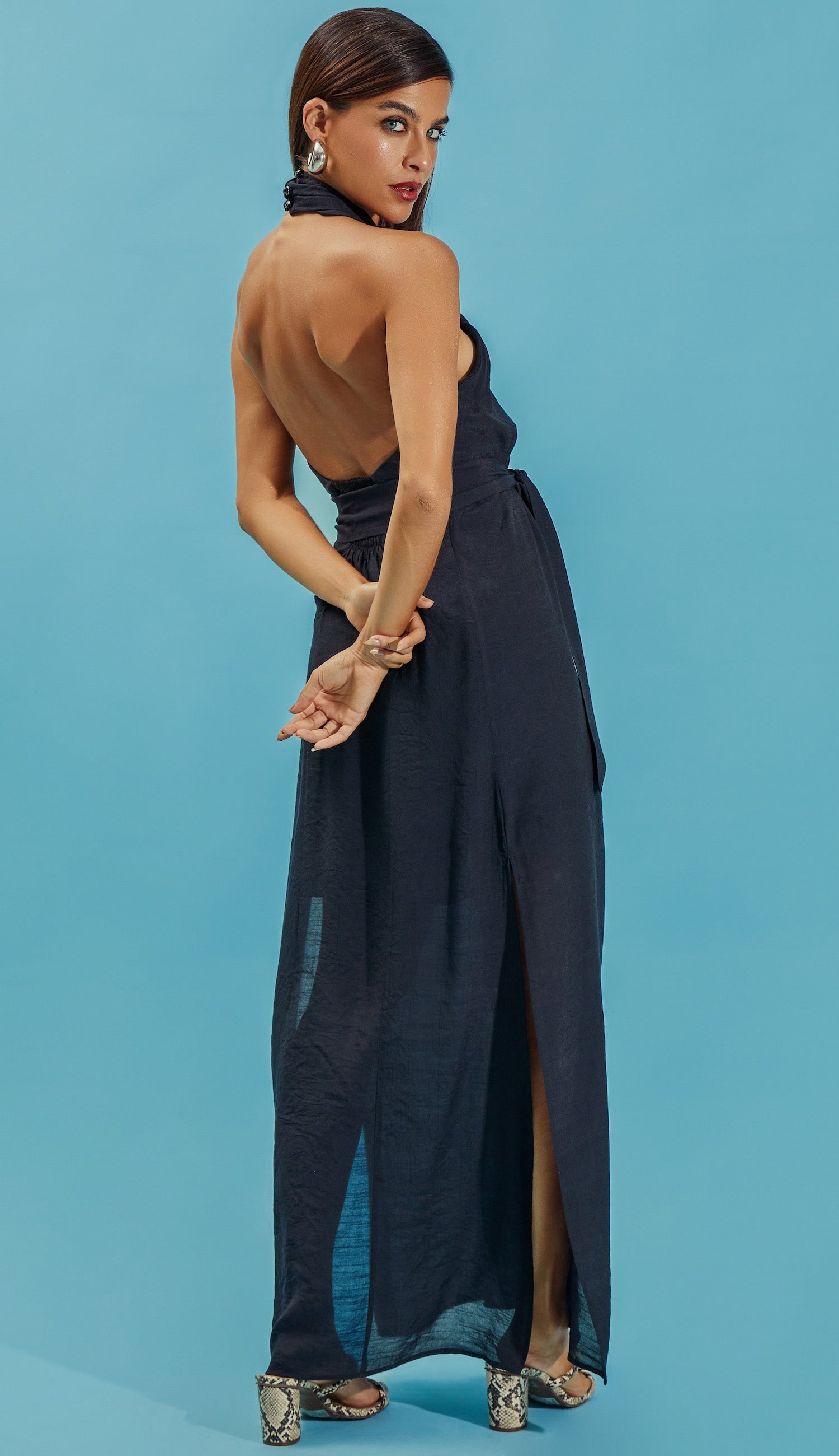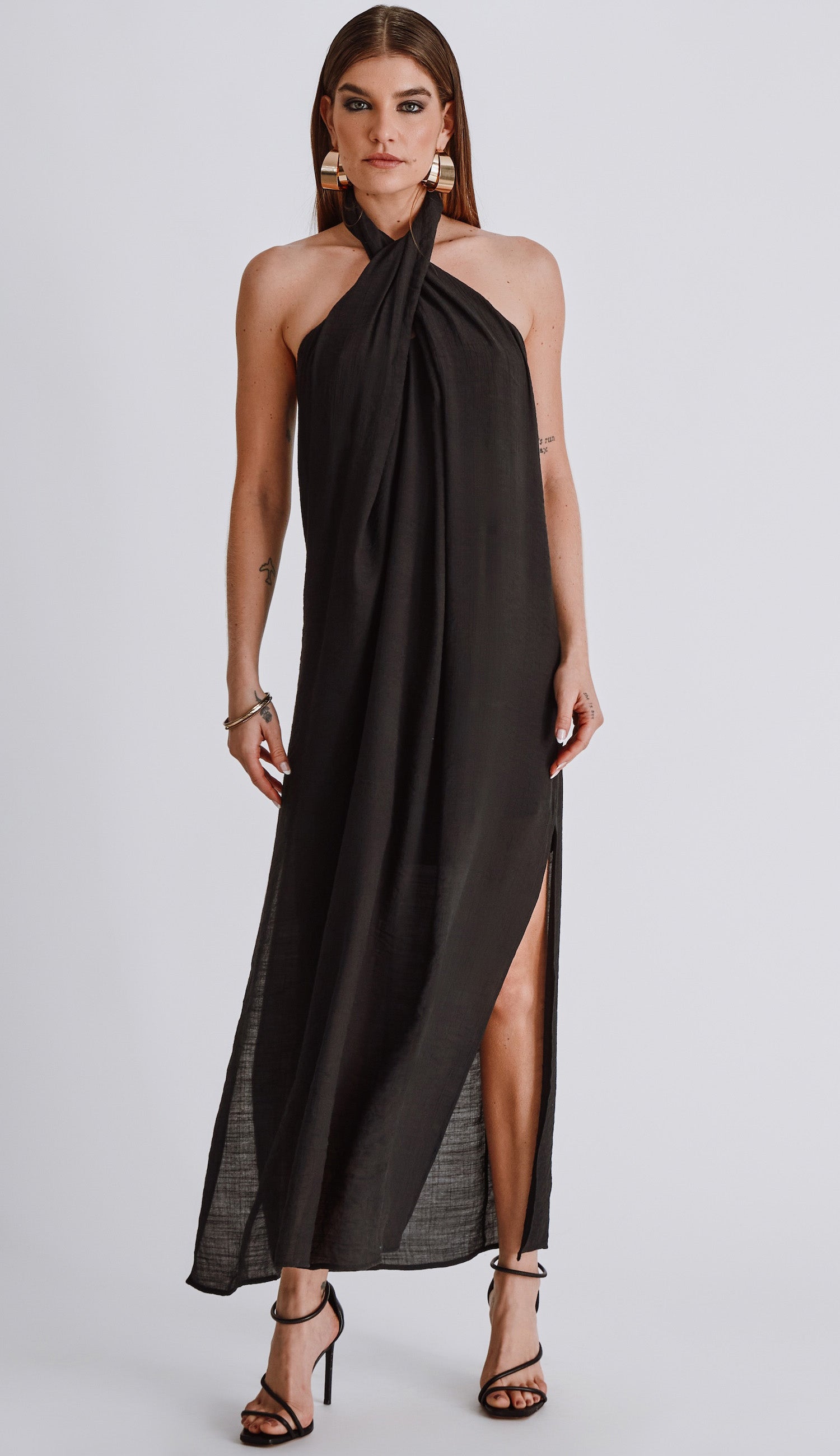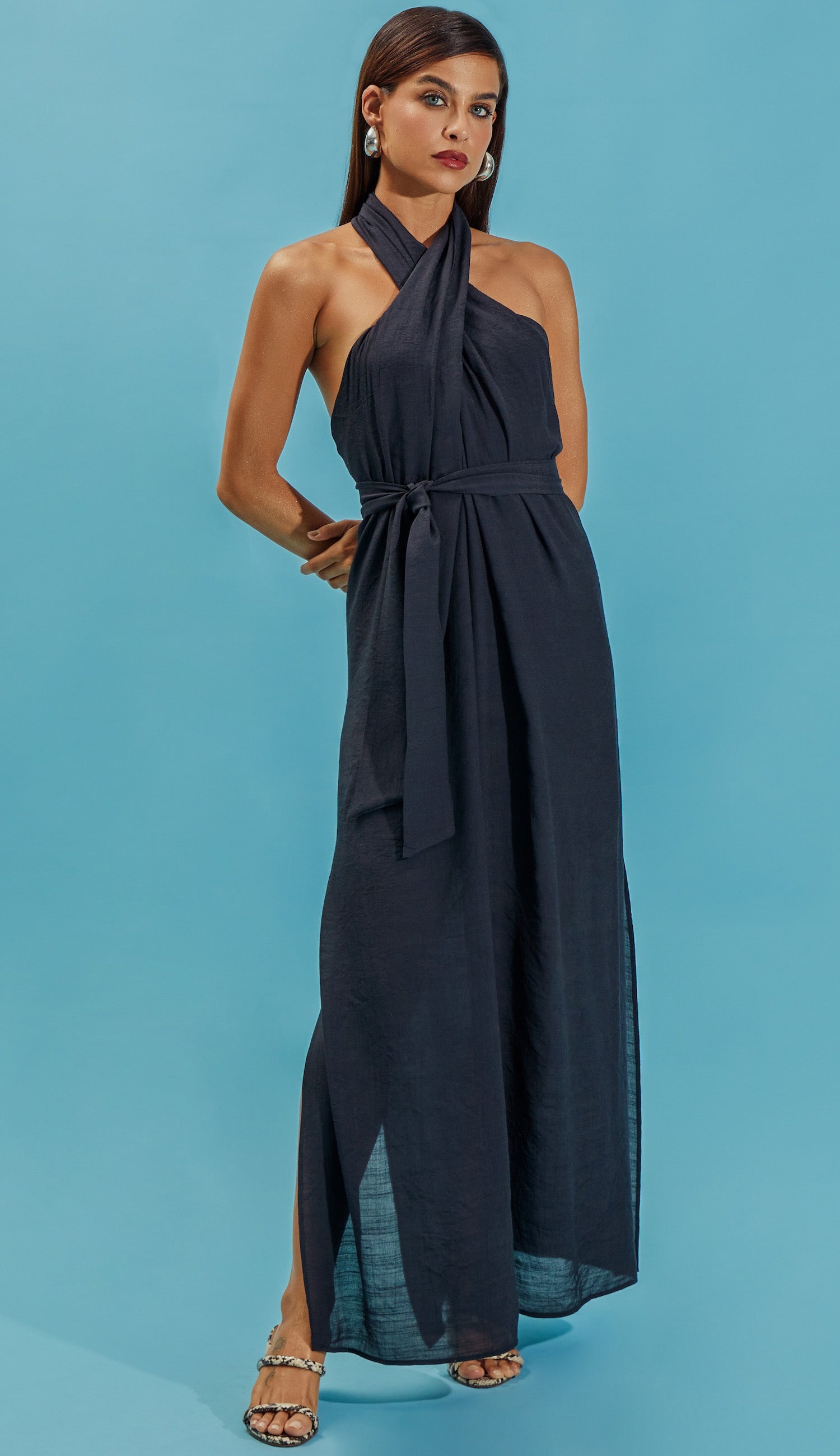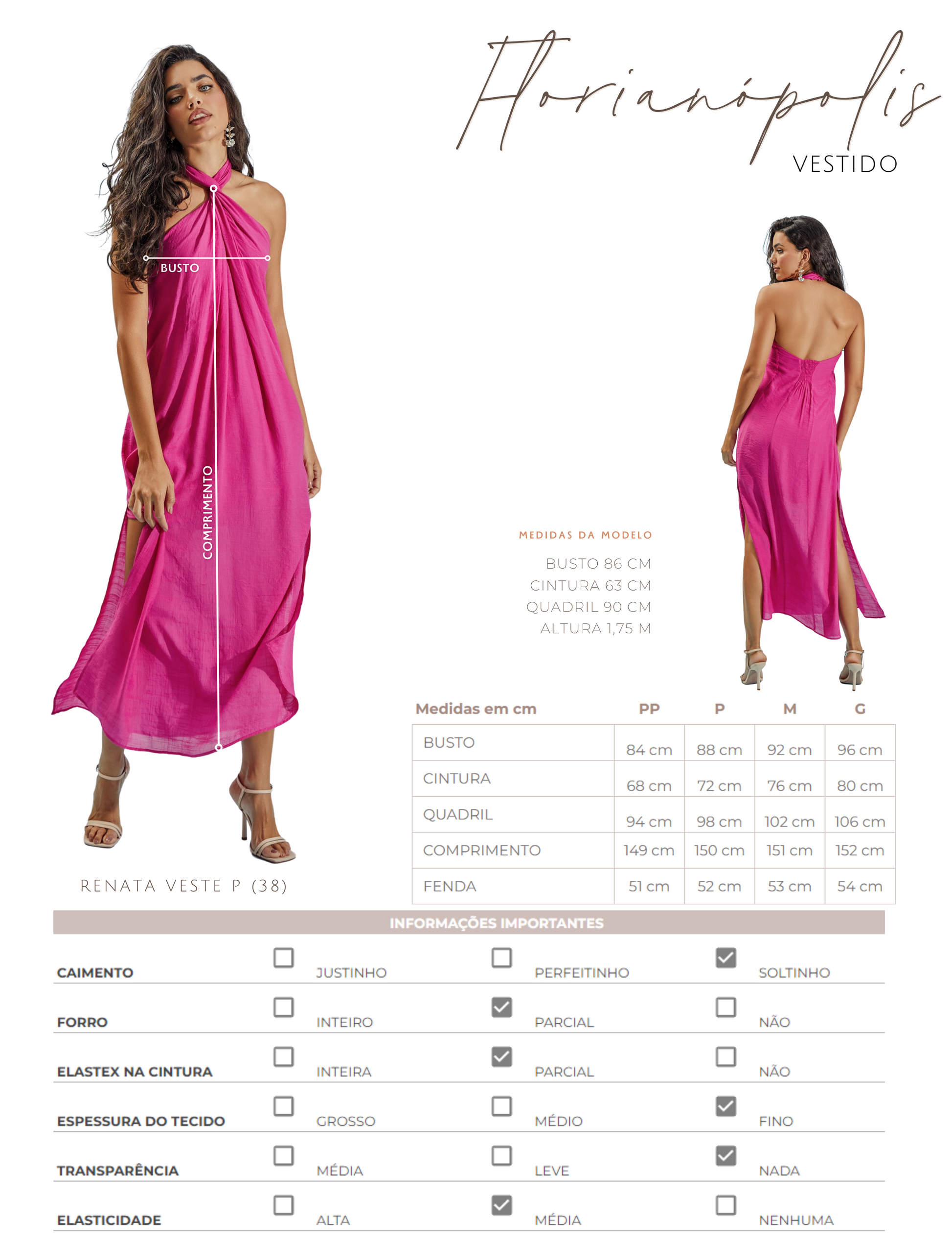 Vestido longo e amplo com forro, confeccionado em poliviscose texturizado com aspecto de linho e efeito amassadinho. Possui modelagem frente única com faixas pregueadas e transpassadas que vão até o pescoço com fechamento por botões esmaltados na nuca, costas nuas, lastex franzido nas costas da saia para melhor ajuste ao corpo, fendas laterais e acompanha faixa solta para amarrar.
