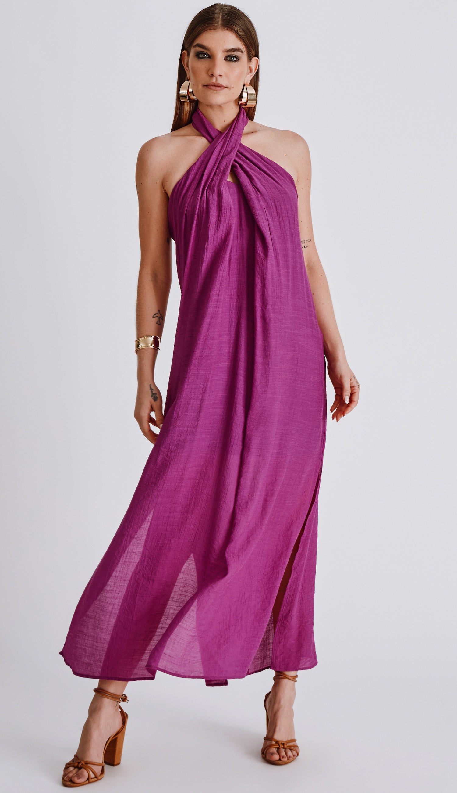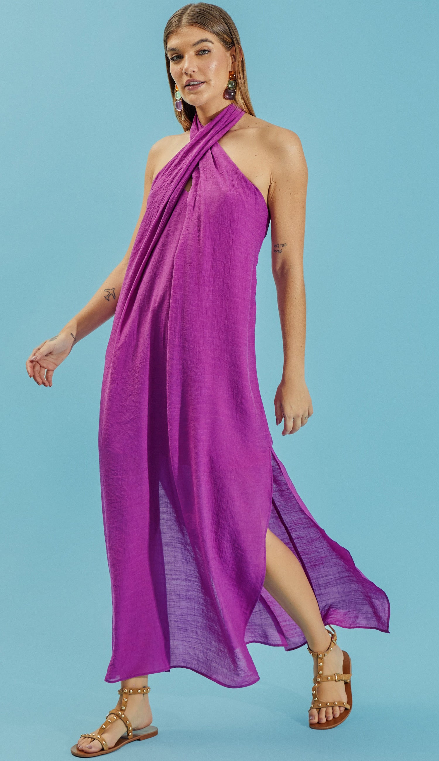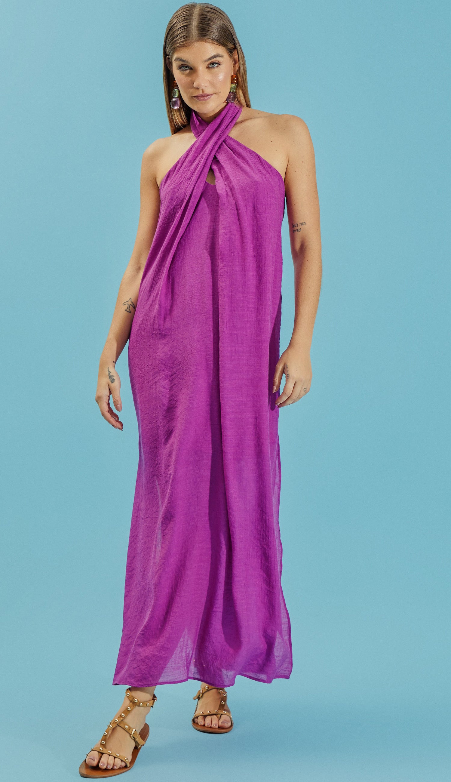 Vestido longo e amplo com forro, confeccionado em poliviscose texturizado com aspecto de linho e efeito amassadinho. Possui modelagem frente única com faixas pregueadas e transpassadas que vão até o pescoço com fechamento por botões esmaltados na nuca, costas nuas, lastex franzido nas costas da saia para melhor ajuste ao corpo, fendas laterais e acompanha faixa solta para amarrar.