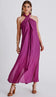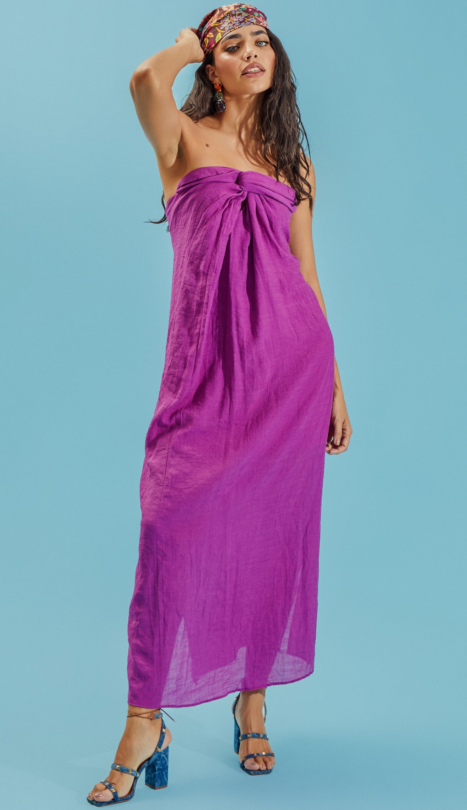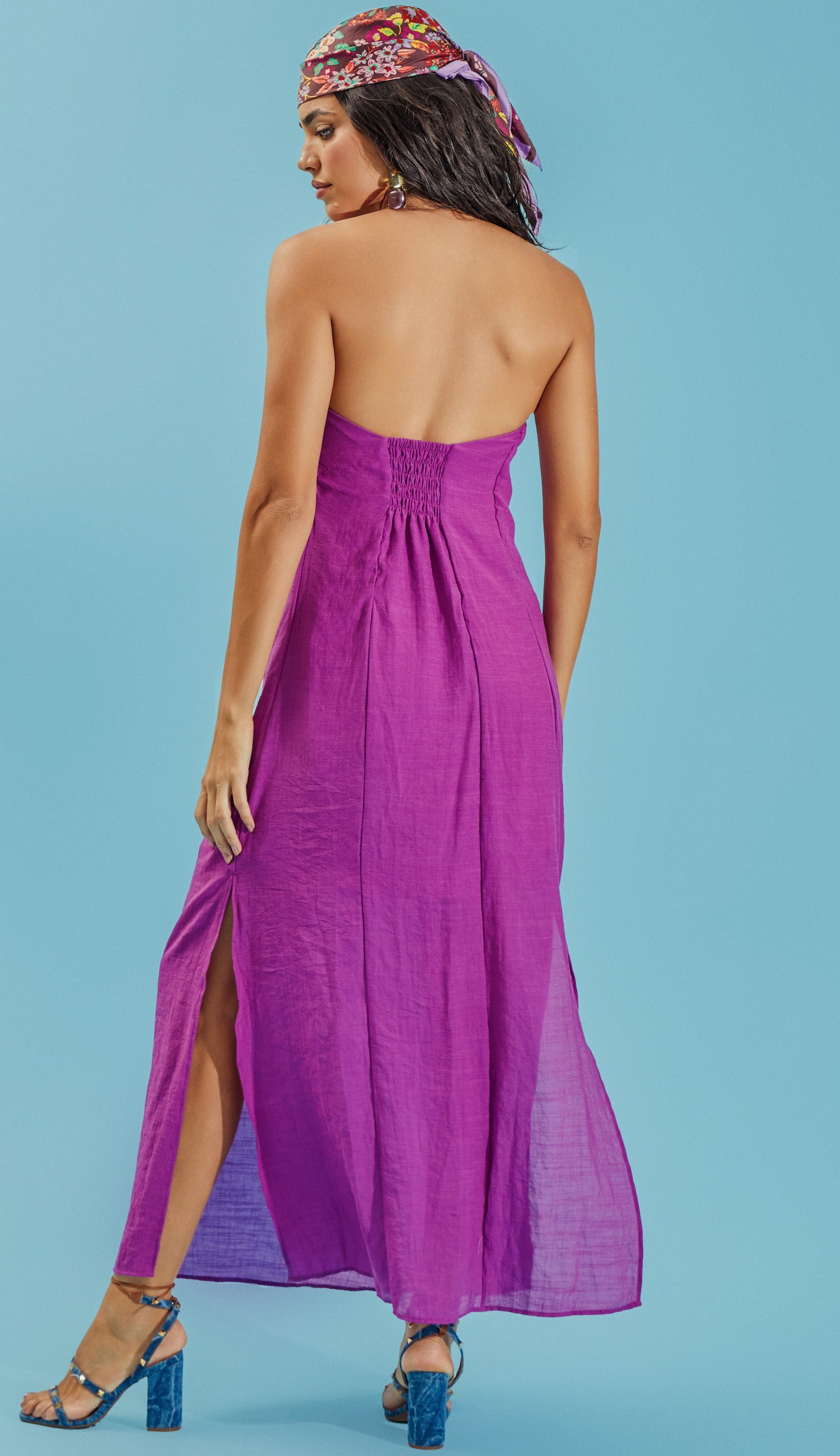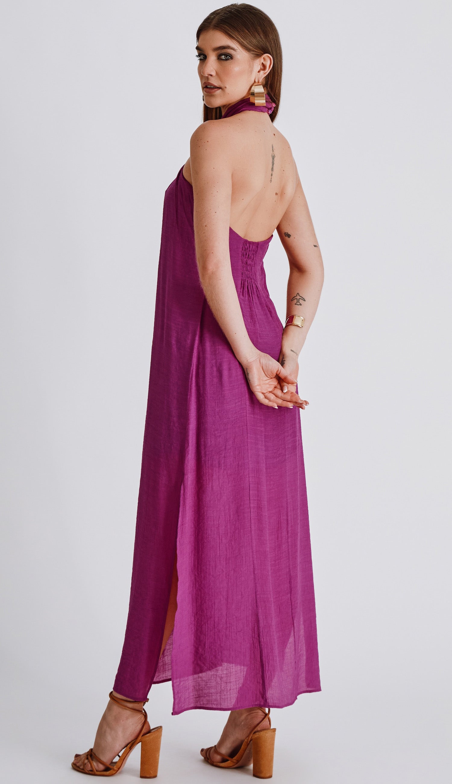 Vestido longo e amplo com forro, confeccionado em poliviscose texturizado com aspecto de linho e efeito amassadinho. Possui modelagem frente única com faixas pregueadas e transpassadas que vão até o pescoço com fechamento por botões esmaltados na nuca, costas nuas, lastex franzido nas costas da saia para melhor ajuste ao corpo, fendas laterais e acompanha faixa solta para amarrar.
