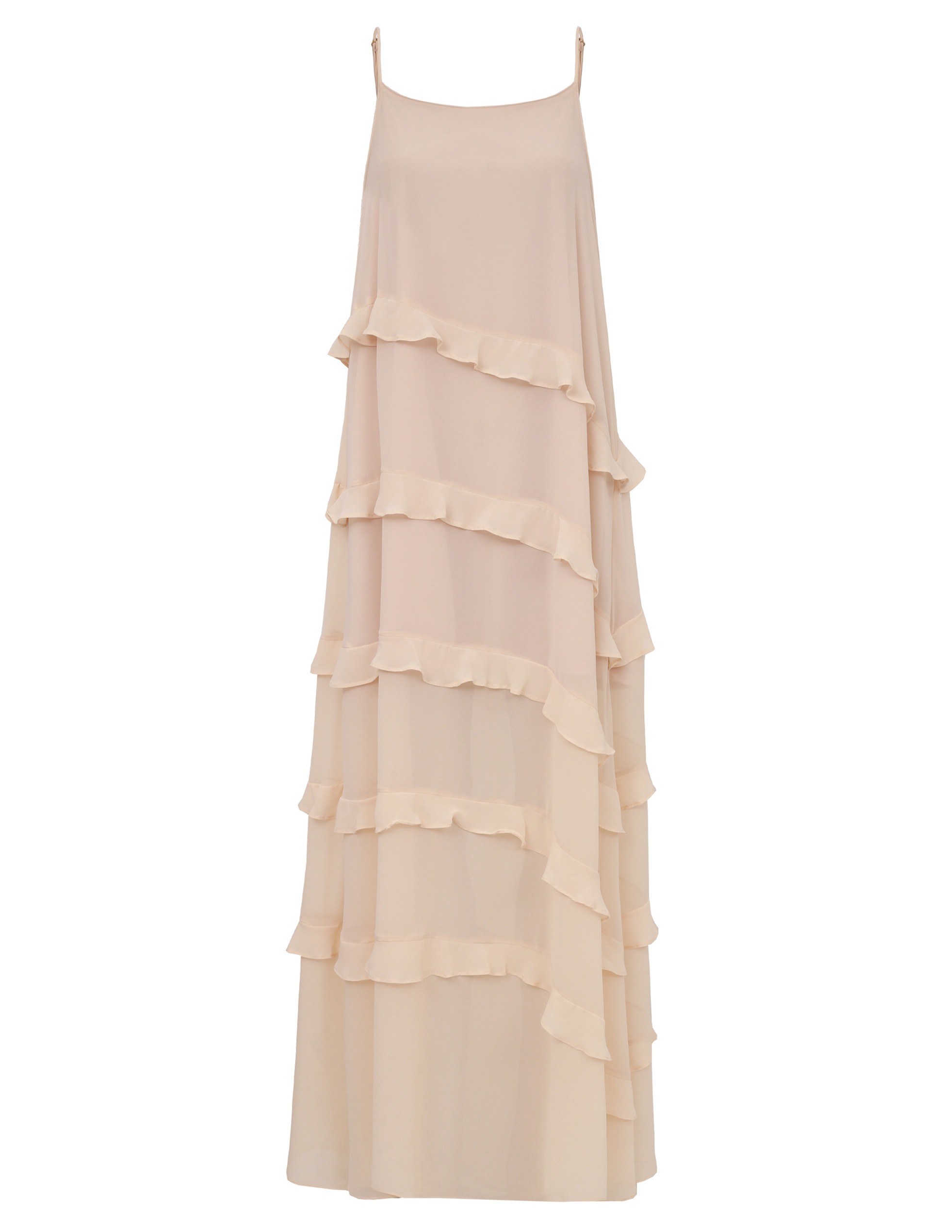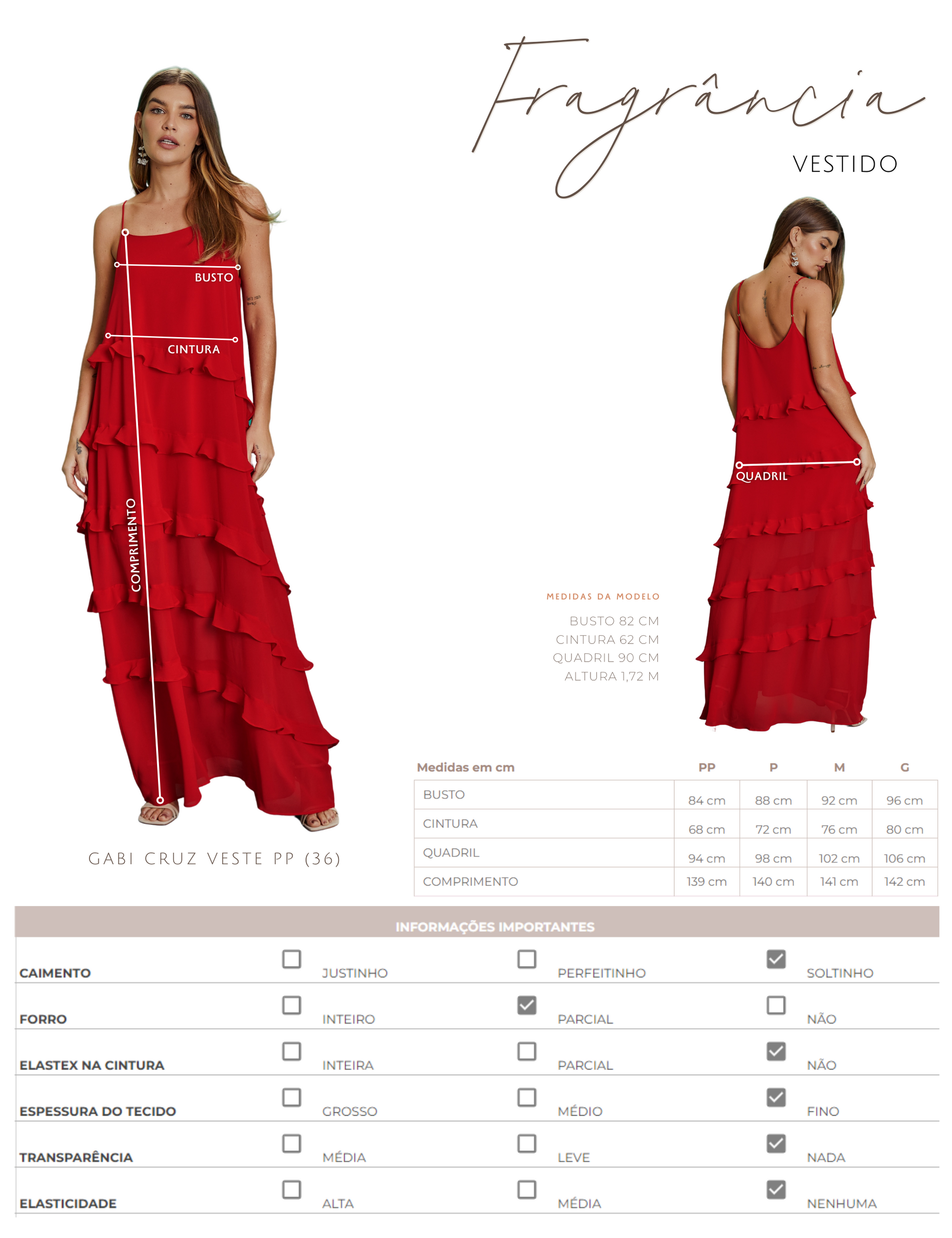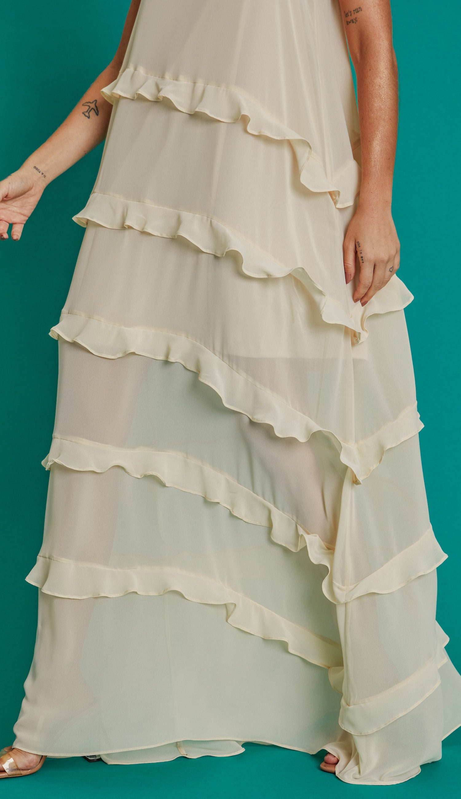 Vestido longo e amplo confeccionado em crepe com forro. Possui decote redondo na frente e nas costas, alcinhas reguláveis e recortes diagonais com babados em todo o comprimento.
