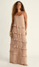 Vestido longo e amplo confeccionado em crepe com forro. Possui decote redondo na frente e nas costas, alcinhas reguláveis e recortes diagonais com babados em todo o comprimento.