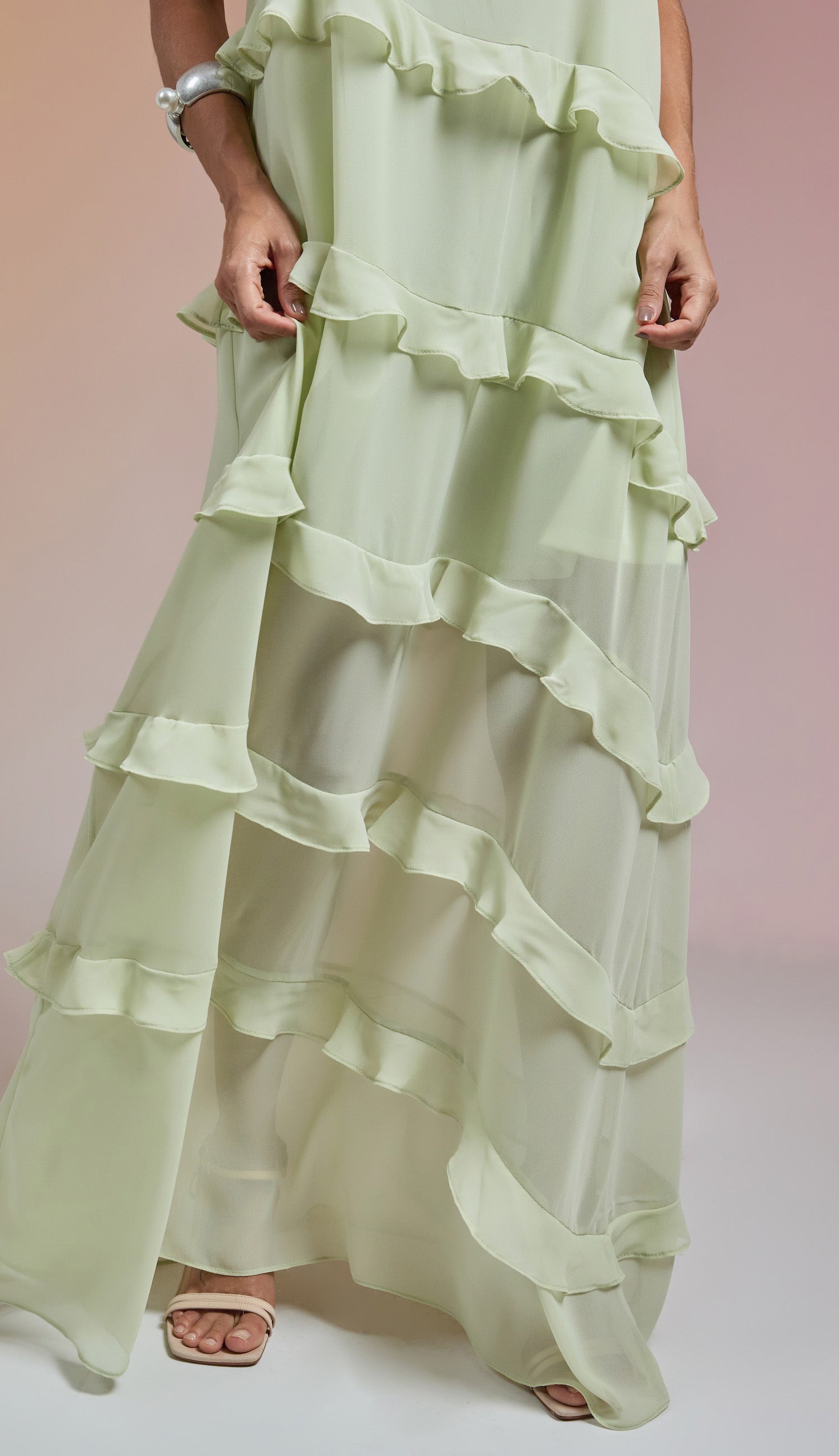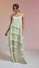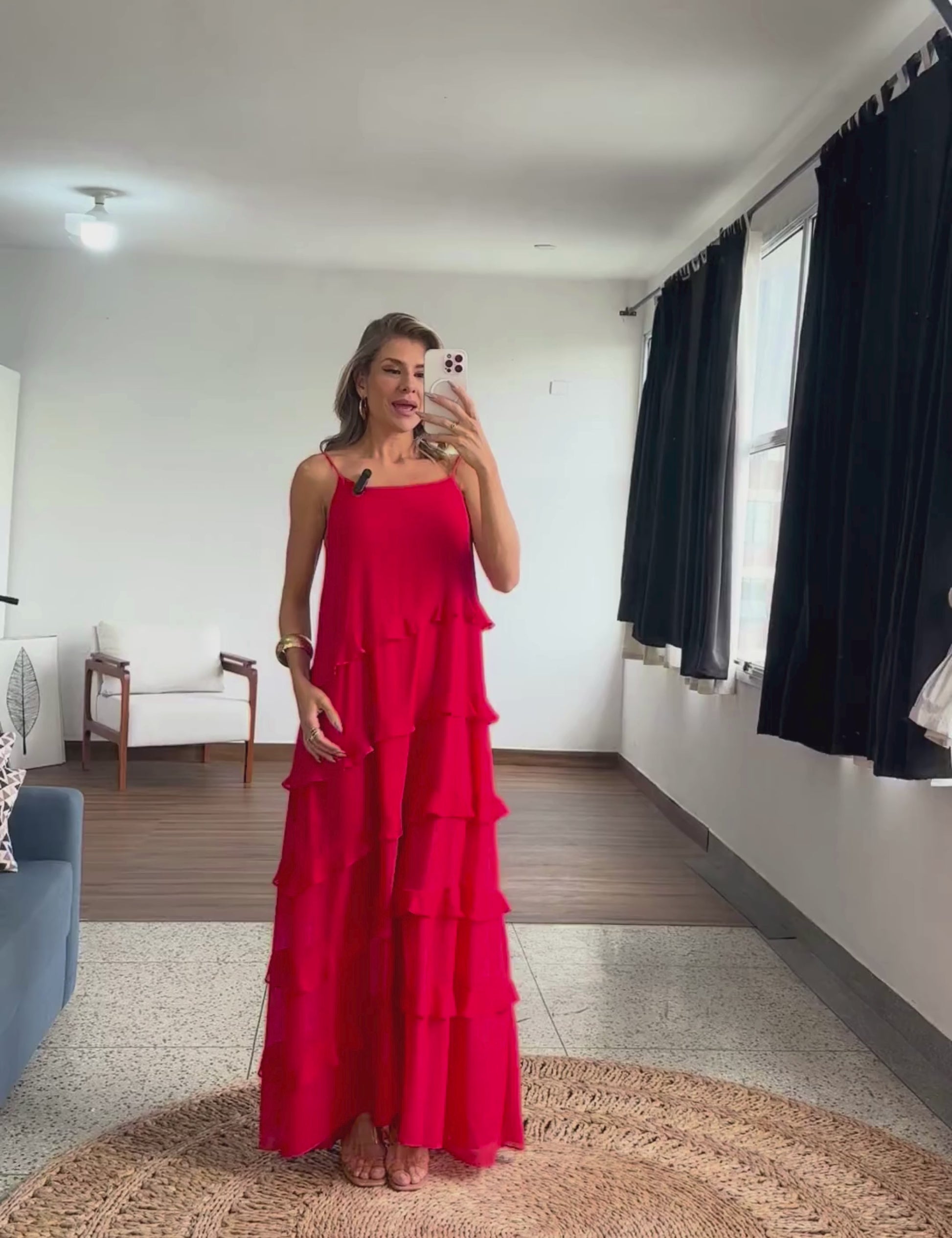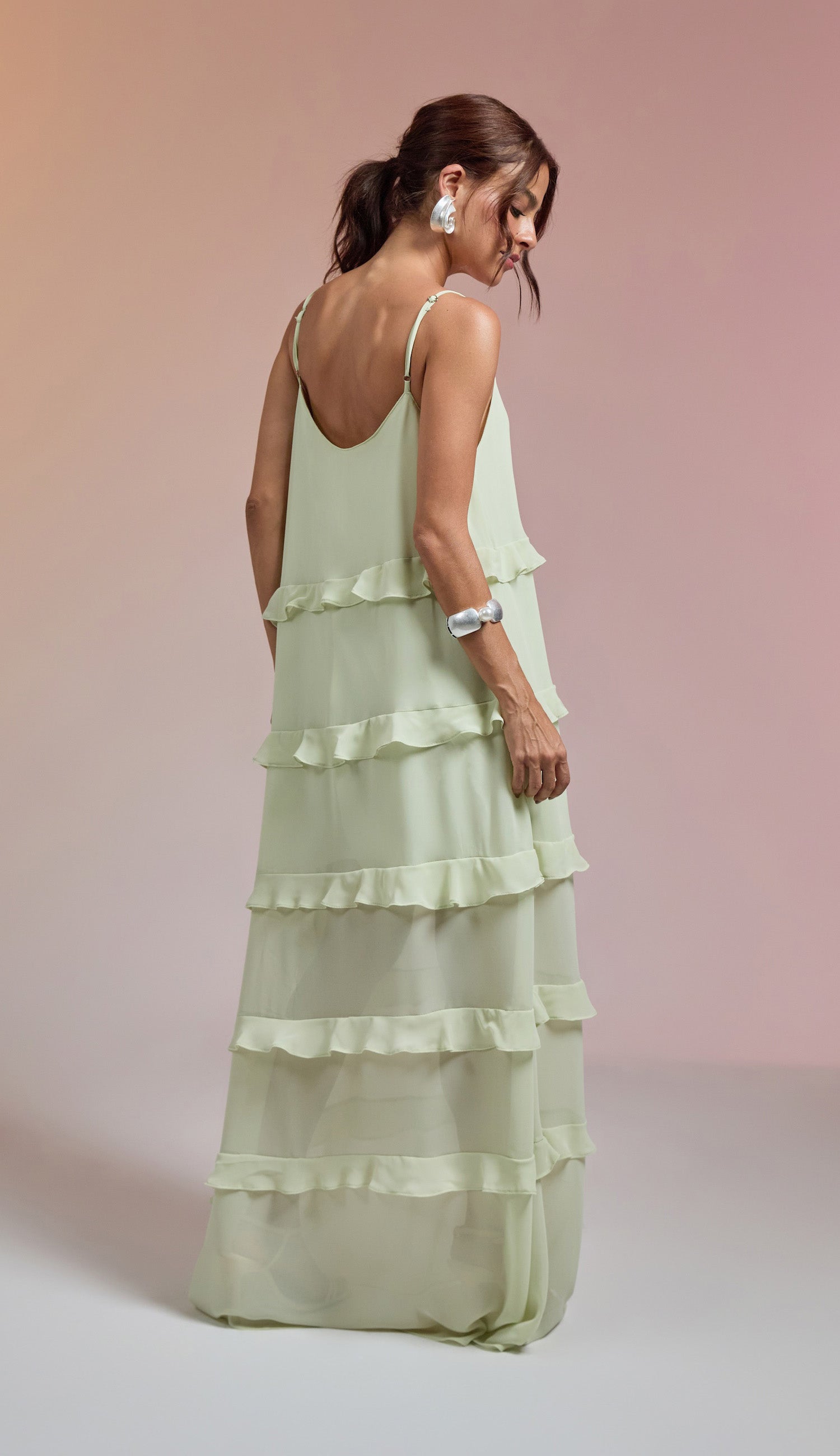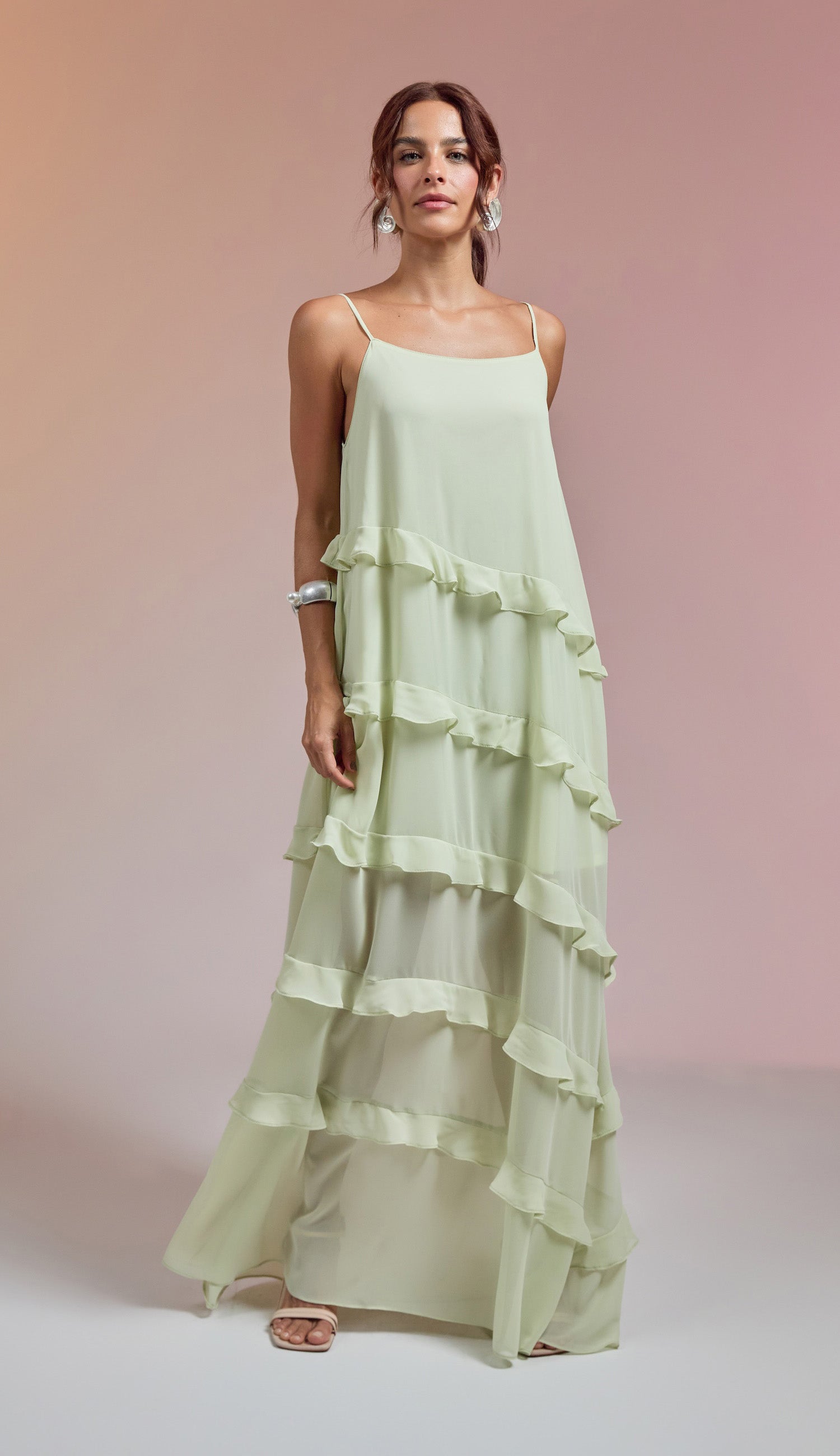 Vestido longo e amplo confeccionado em crepe com forro. Possui decote redondo na frente e nas costas, alcinhas reguláveis e recortes diagonais com babados em todo o comprimento.