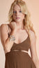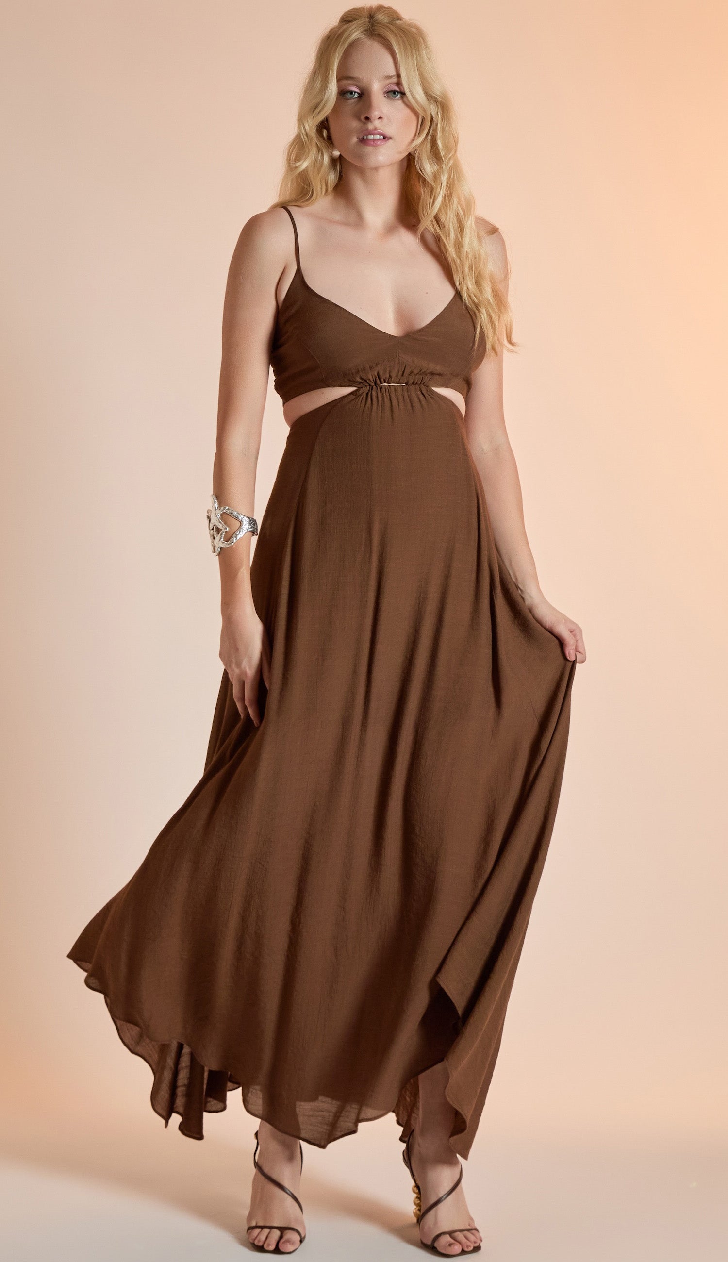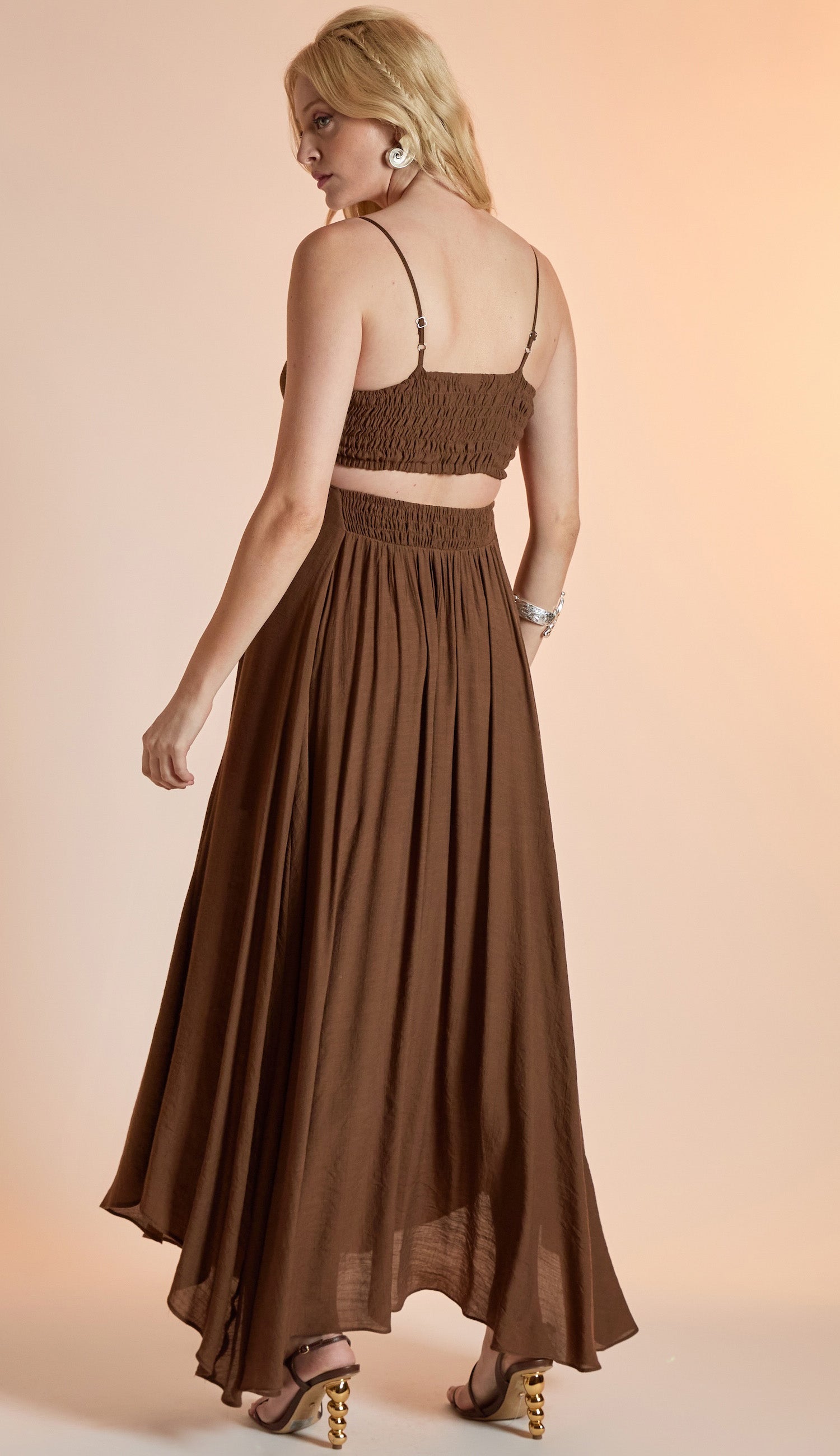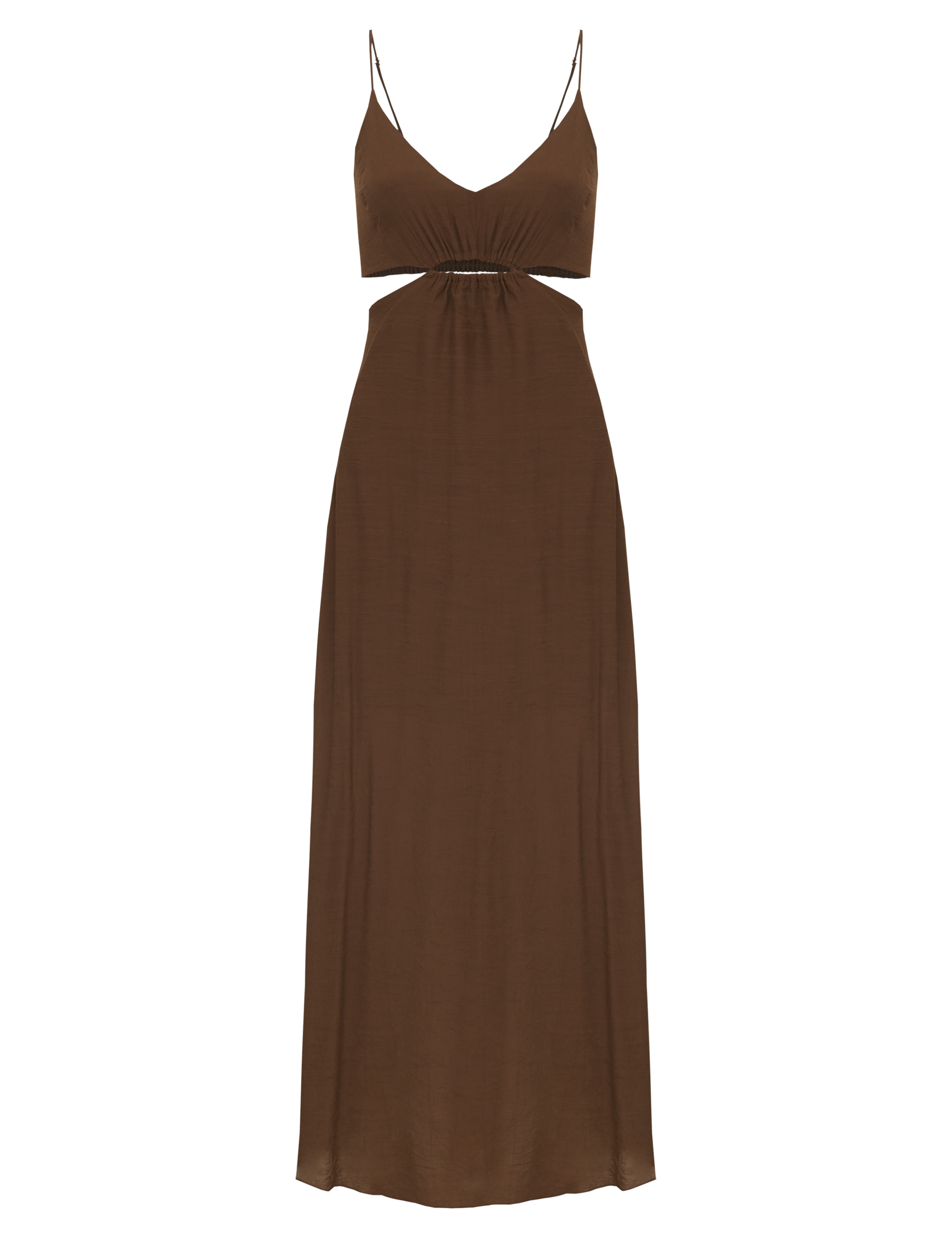 Vestido longo com forro na saia, confeccionado em poliviscose texturizada com aspecto de linho e efeito amassadinho. Possui decote em V, alcinhas reguláveis, busto fixo à saia apenas por detalhe frontal de recorte com franzidinhos, deixando toda a região da cintura à mostra; e conta com lastex franzido nas costas da saia e do busto para melhor ajuste ao corpo.