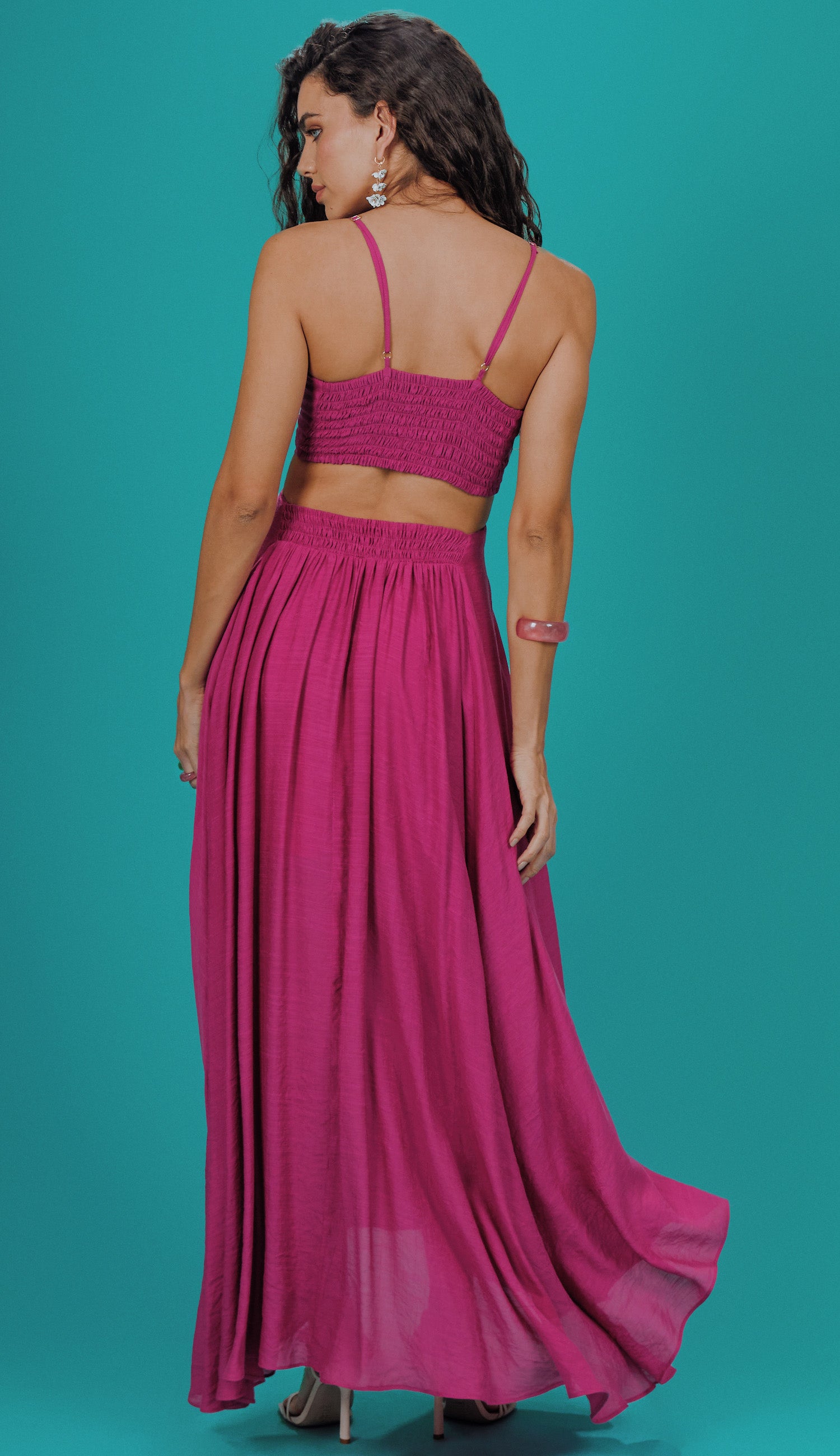 Vestido longo com forro na saia, confeccionado em poliviscose texturizada com aspecto de linho e efeito amassadinho. Possui decote em V, alcinhas reguláveis, busto fixo à saia apenas por detalhe frontal de recorte com franzidinhos, deixando toda a região da cintura à mostra; e conta com lastex franzido nas costas da saia e do busto para melhor ajuste ao corpo.