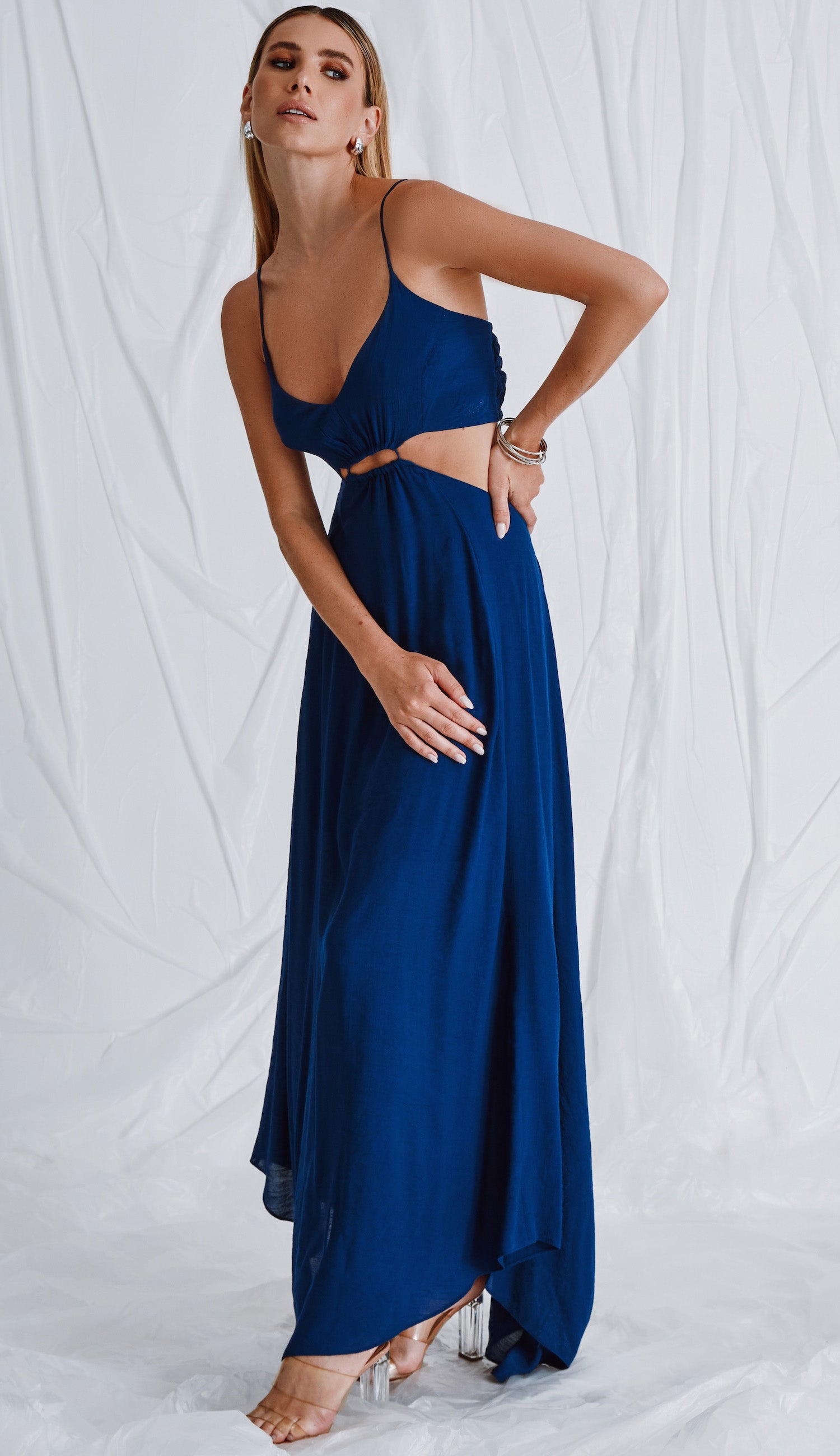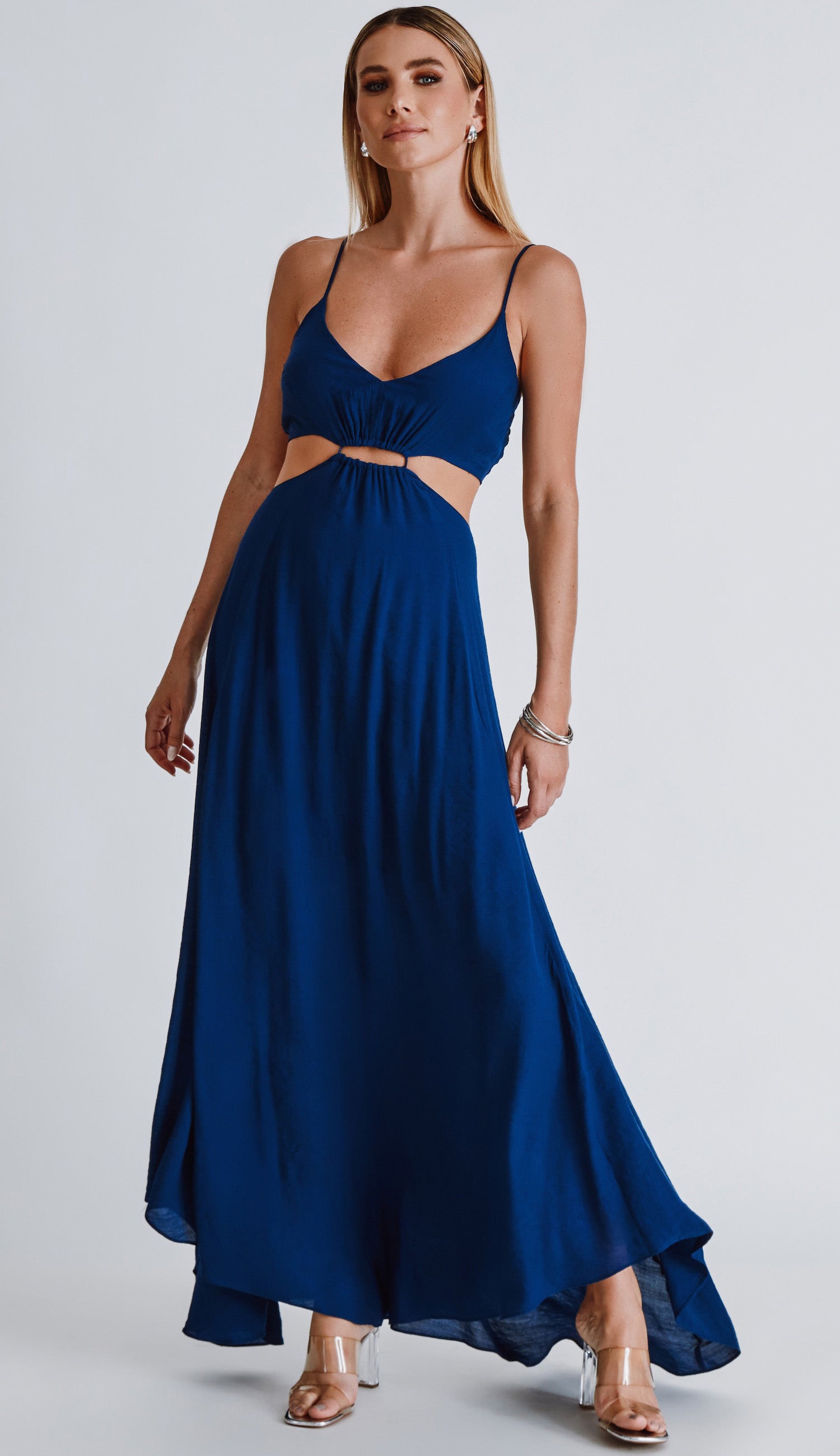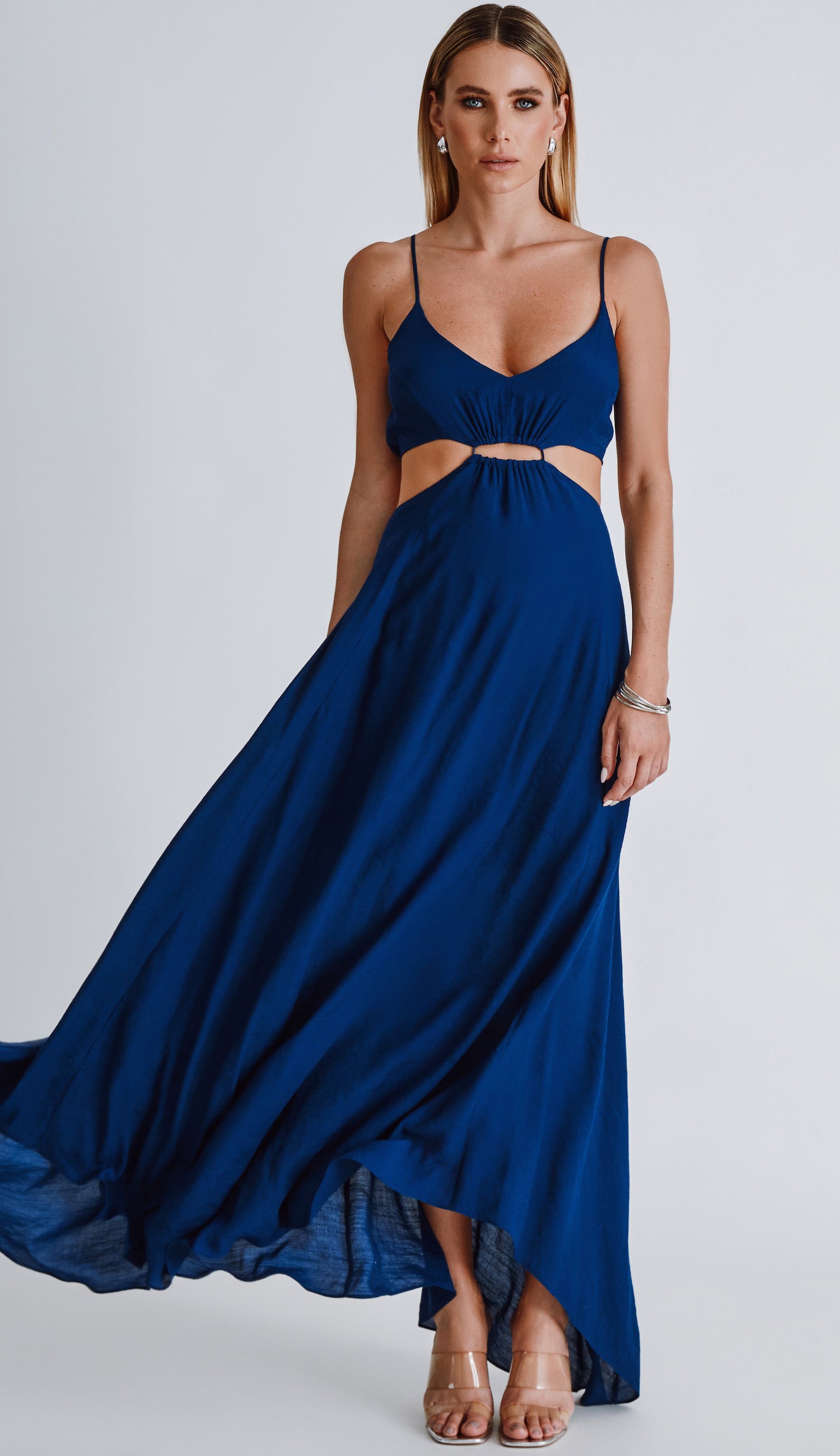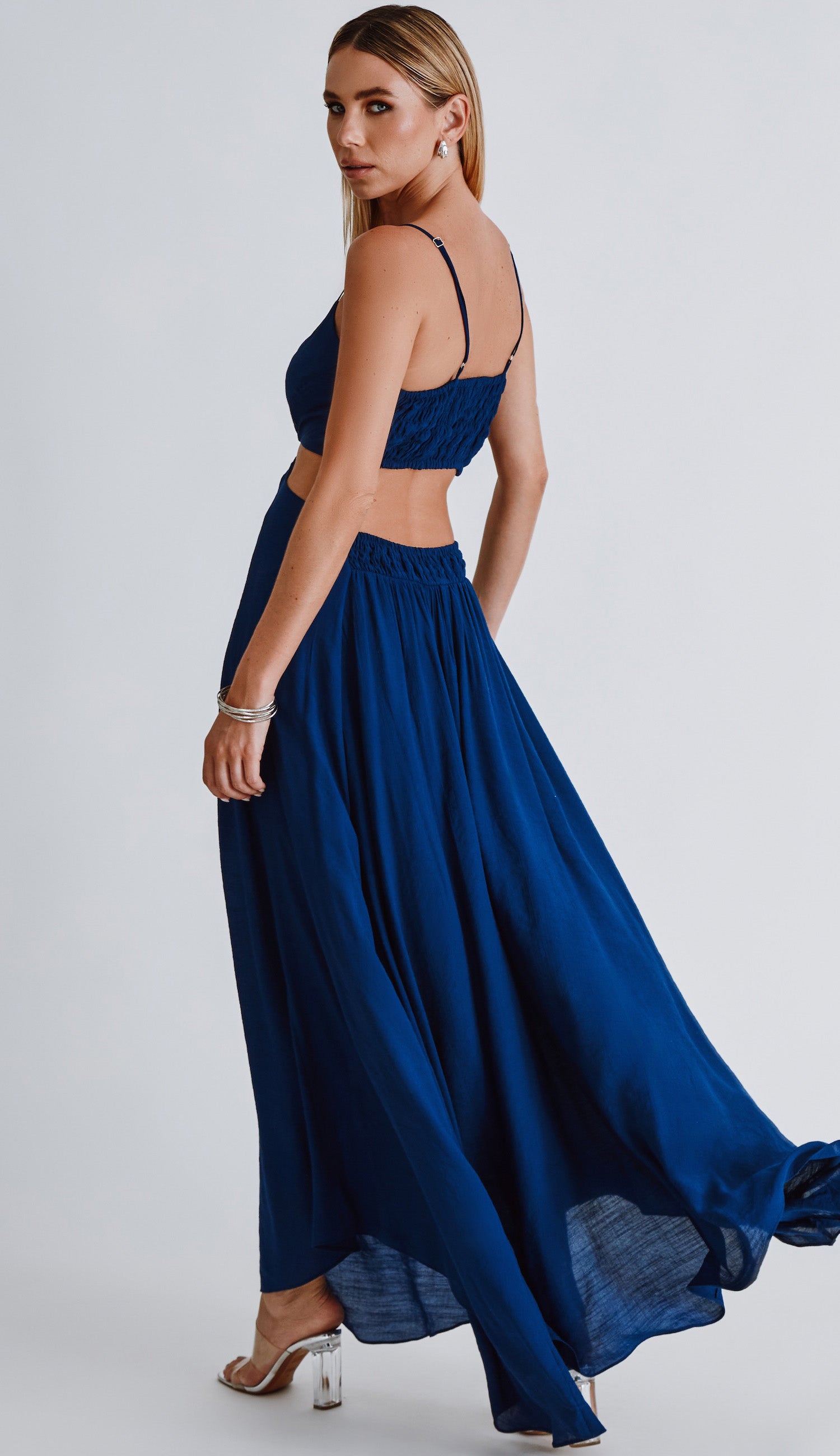 Vestido longo com forro na saia, confeccionado em poliviscose texturizada com aspecto de linho e efeito amassadinho. Possui decote em V, alcinhas reguláveis, busto fixo à saia apenas por detalhe frontal de recorte com franzidinhos, deixando toda a região da cintura à mostra; e conta com lastex franzido nas costas da saia e do busto para melhor ajuste ao corpo.