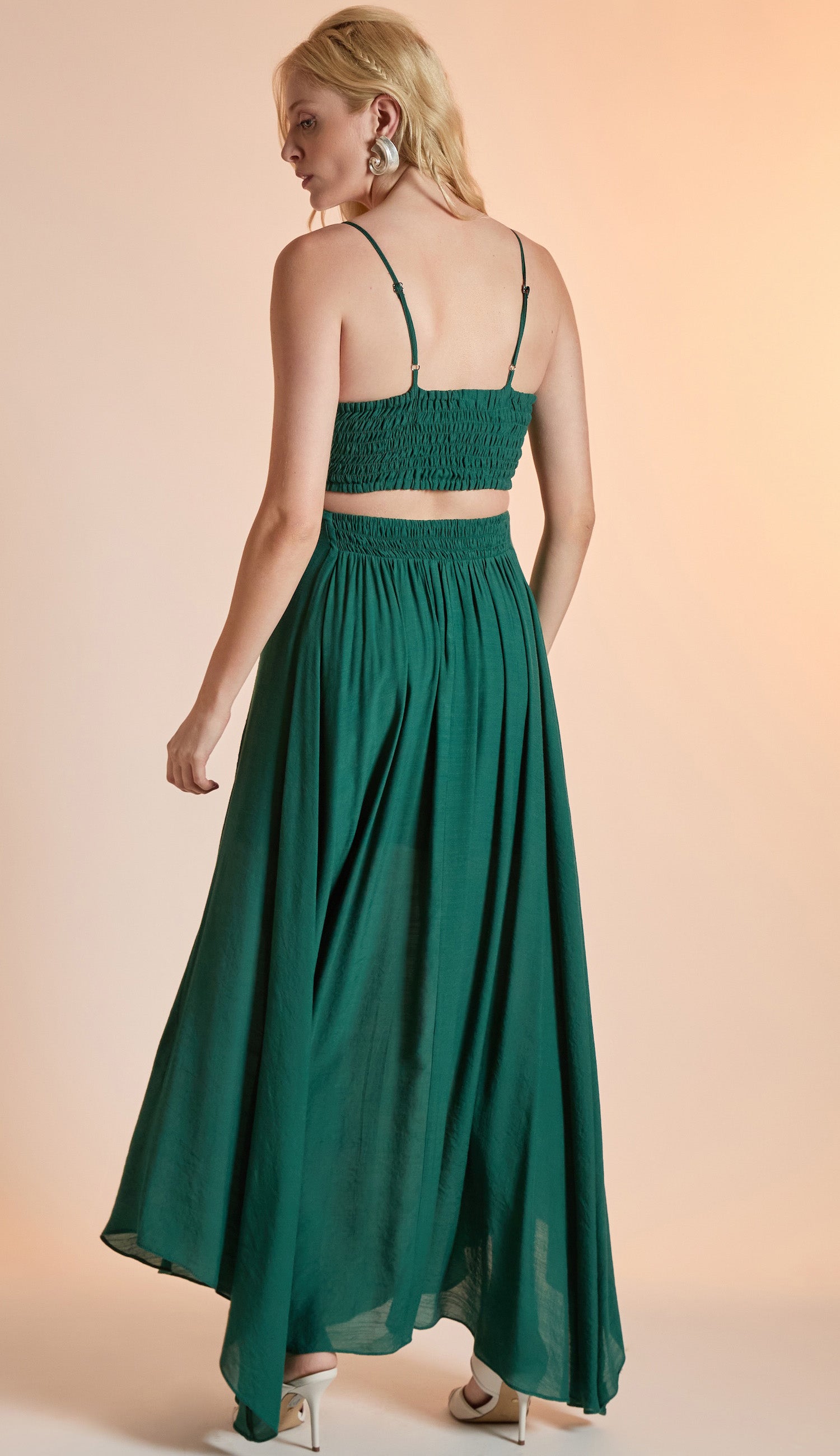 Vestido longo com forro na saia, confeccionado em poliviscose texturizada com aspecto de linho e efeito amassadinho. Possui decote em V, alcinhas reguláveis, busto fixo à saia apenas por detalhe frontal de recorte com franzidinhos, deixando toda a região da cintura à mostra; e conta com lastex franzido nas costas da saia e do busto para melhor ajuste ao corpo.