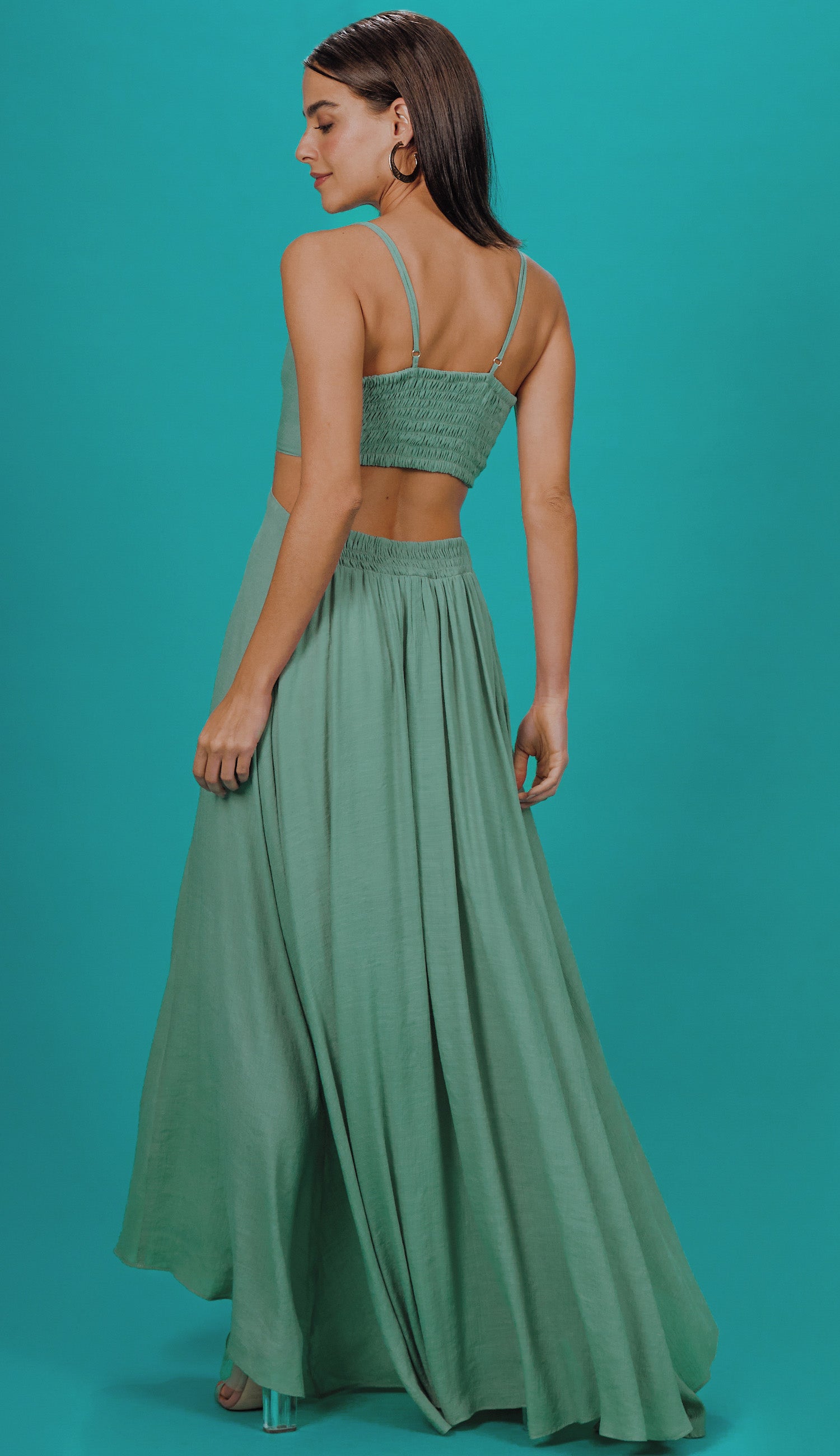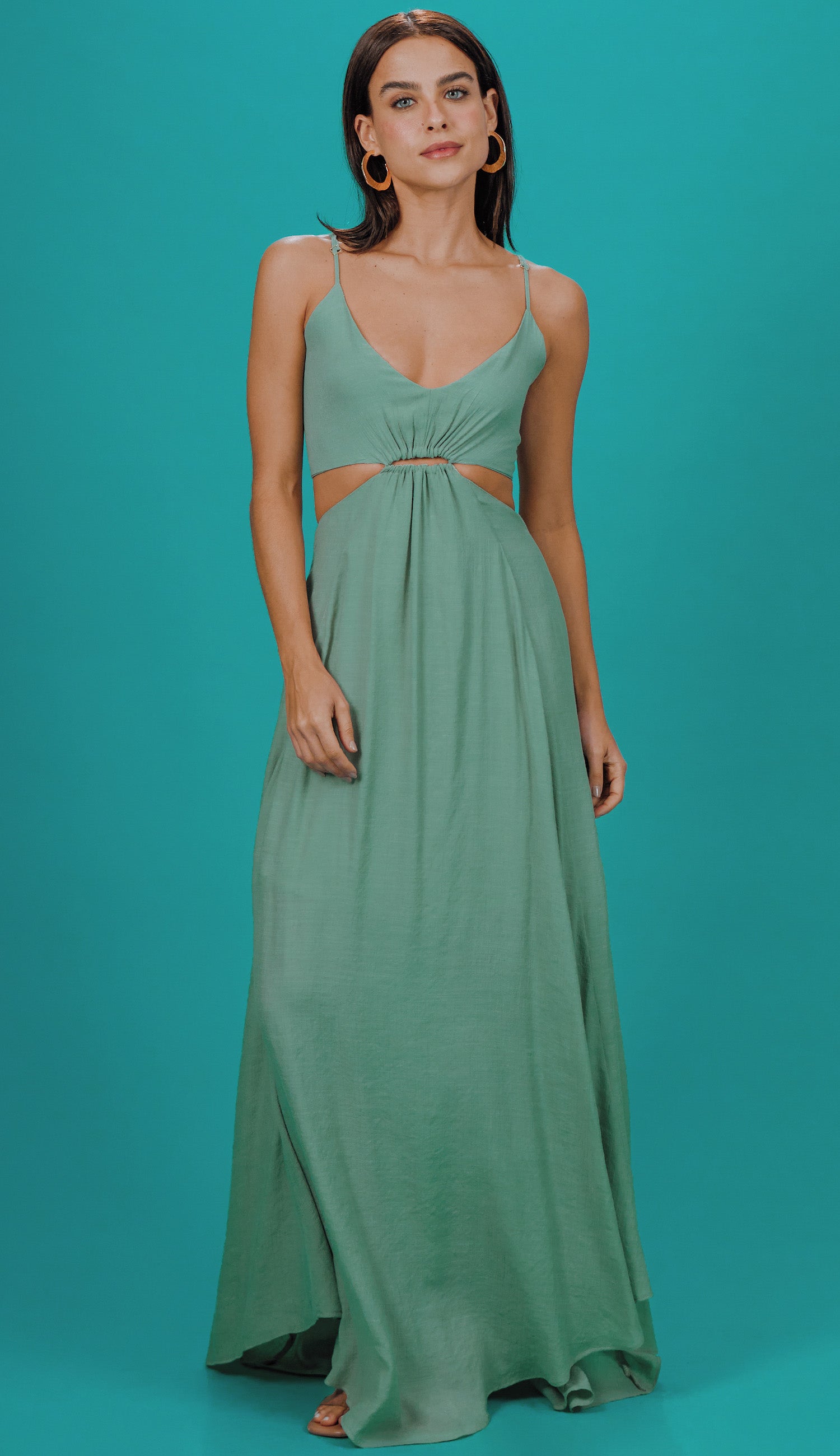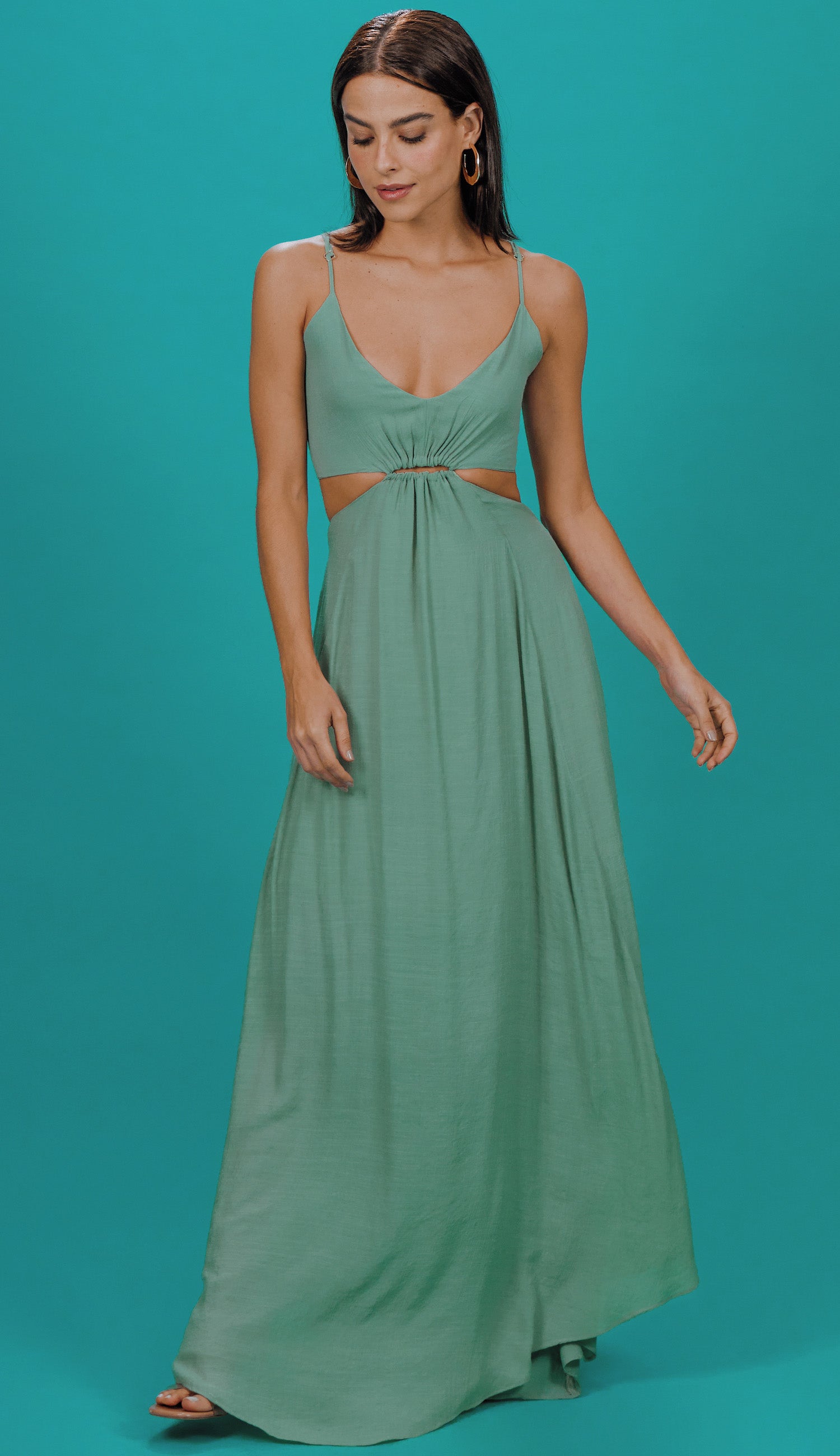 Vestido longo com forro na saia, confeccionado em poliviscose texturizada com aspecto de linho e efeito amassadinho. Possui decote em V, alcinhas reguláveis, busto fixo à saia apenas por detalhe frontal de recorte com franzidinhos, deixando toda a região da cintura à mostra; e conta com lastex franzido nas costas da saia e do busto para melhor ajuste ao corpo.