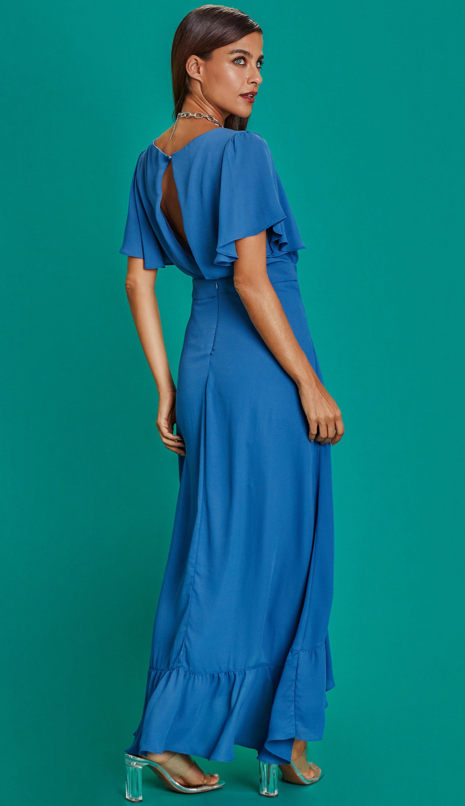 Vestido longo confeccionado em crepe com shorts e forro. Possui decote "V", delicado franzido no busto, saia mullet, shorts fixo por baixo da saia e fechamento frontal por botões esmaltados. O mood mais romântico e delicado fica por conta da manga curta godê e da fenda frontal com babados!
