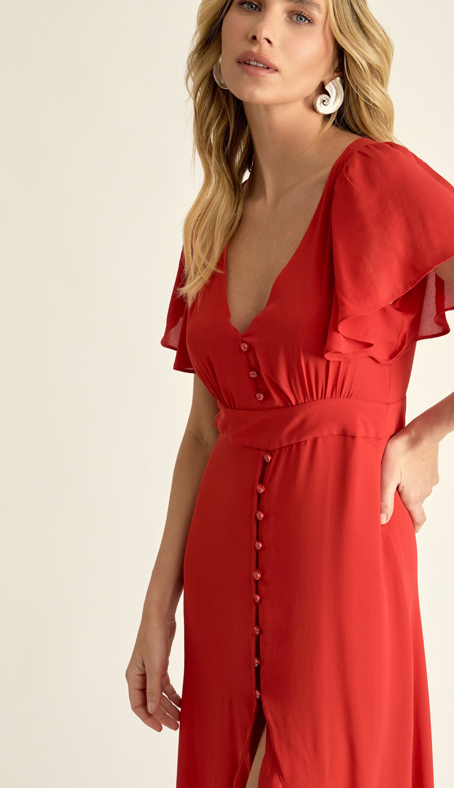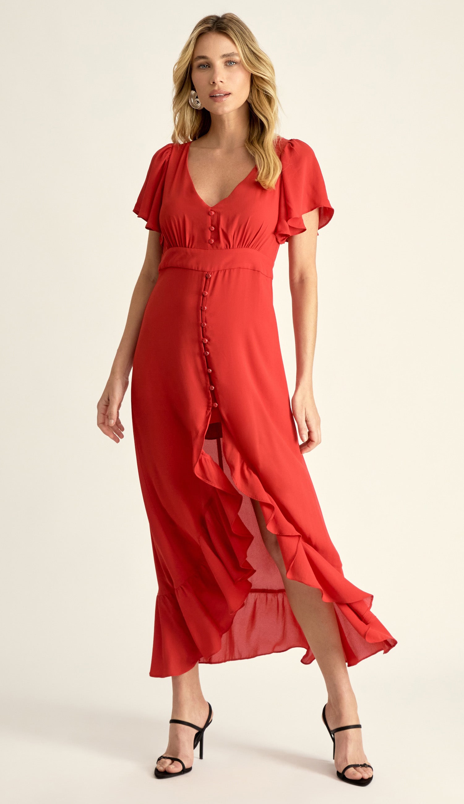 Vestido longo confeccionado em crepe com shorts e forro. Possui decote "V", delicado franzido no busto, saia mullet, shorts fixo por baixo da saia e fechamento frontal por botões esmaltados. O mood mais romântico e delicado fica por conta da manga curta godê e da fenda frontal com babados!