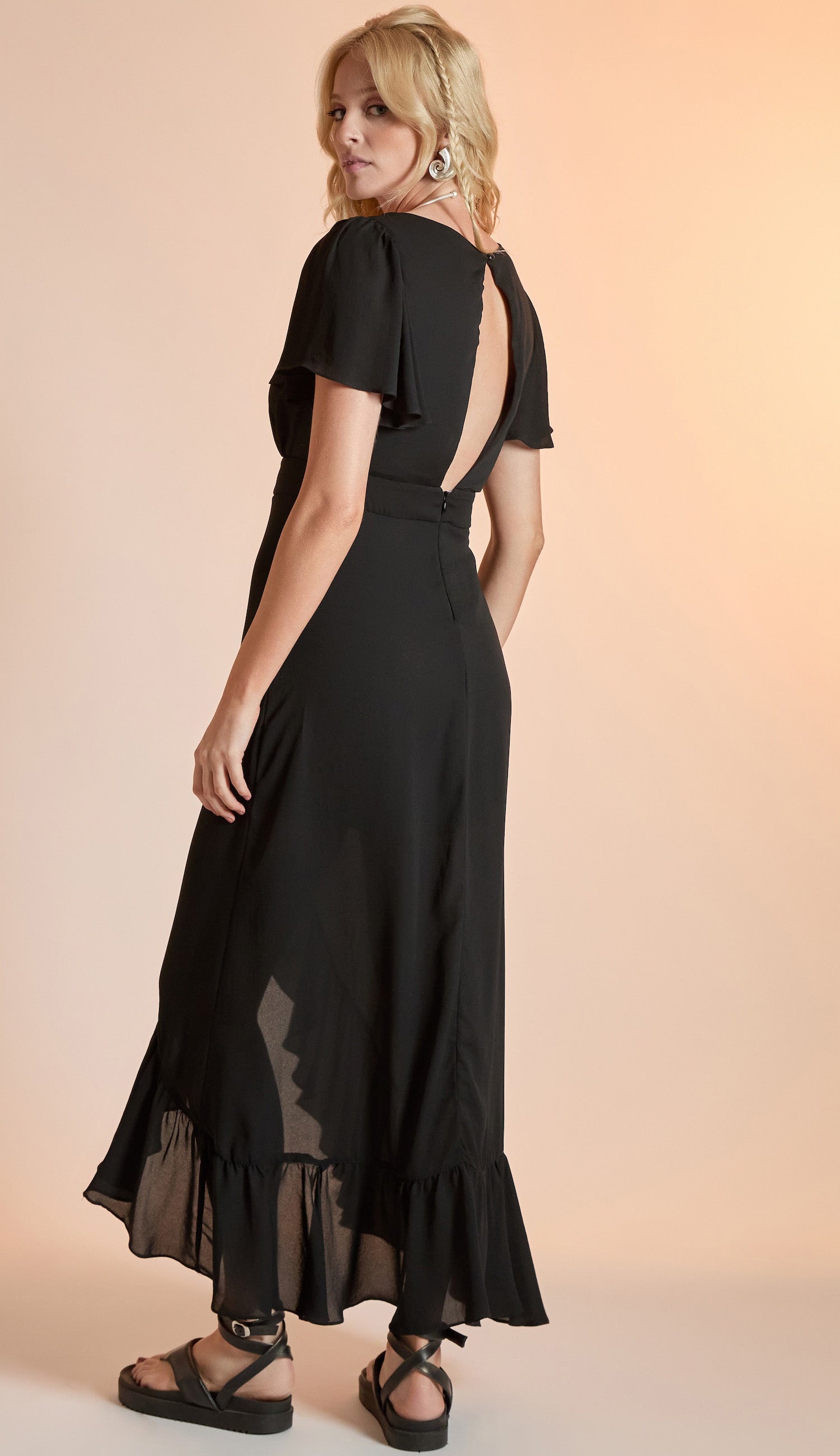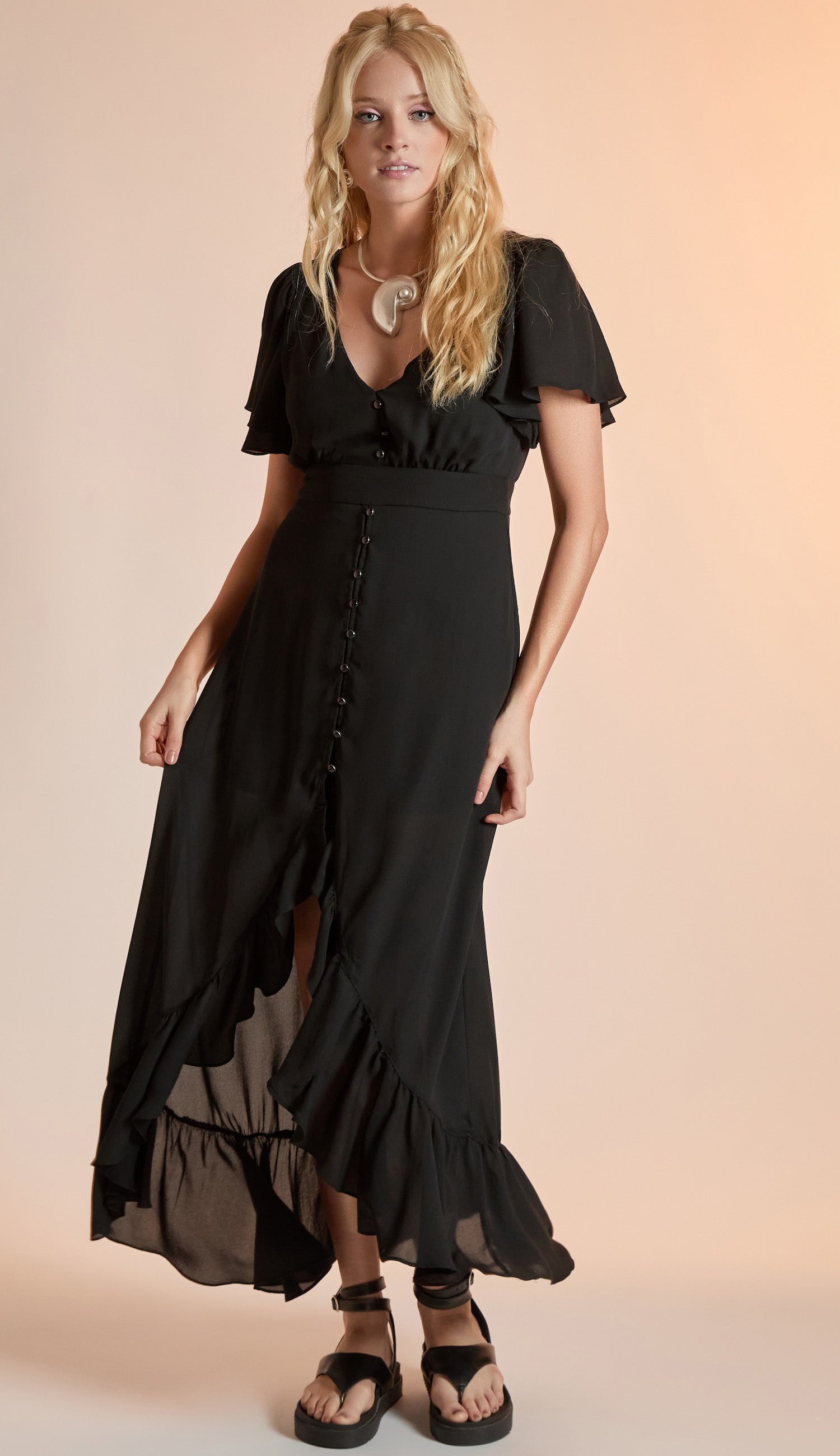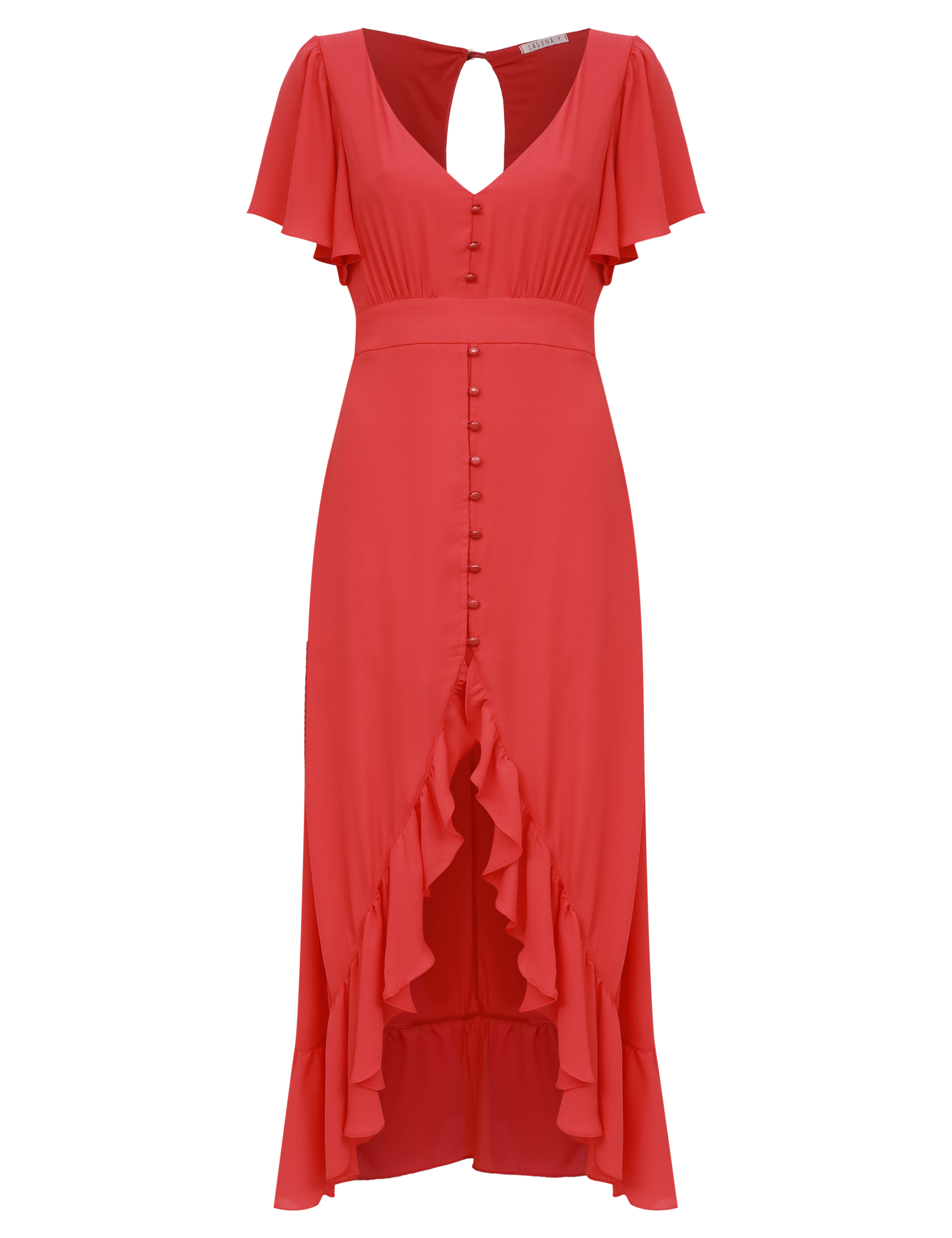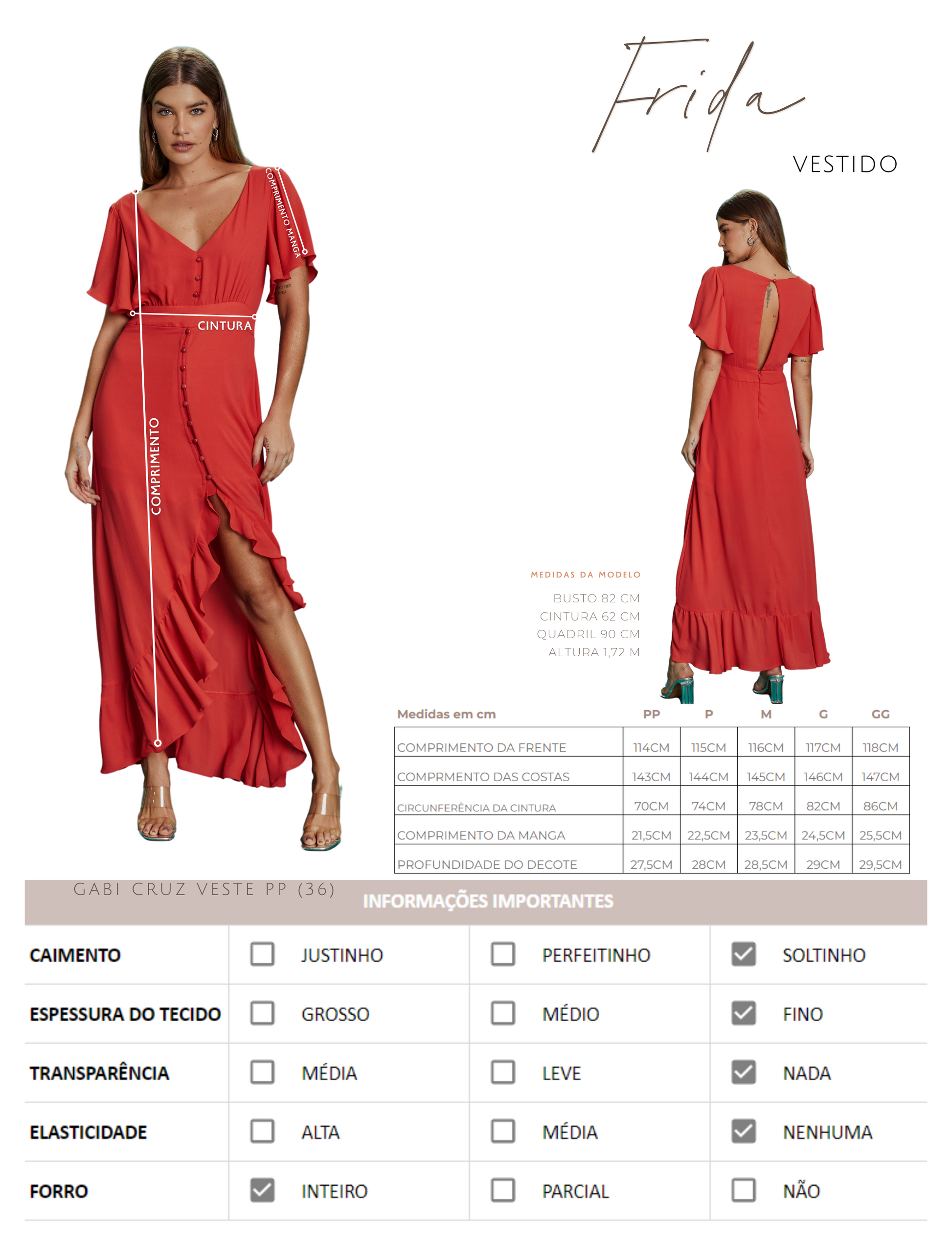 Vestido longo confeccionado em crepe com shorts e forro. Possui decote "V", delicado franzido no busto, saia mullet, shorts fixo por baixo da saia e fechamento frontal por botões esmaltados. O mood mais romântico e delicado fica por conta da manga curta godê e da fenda frontal com babados!