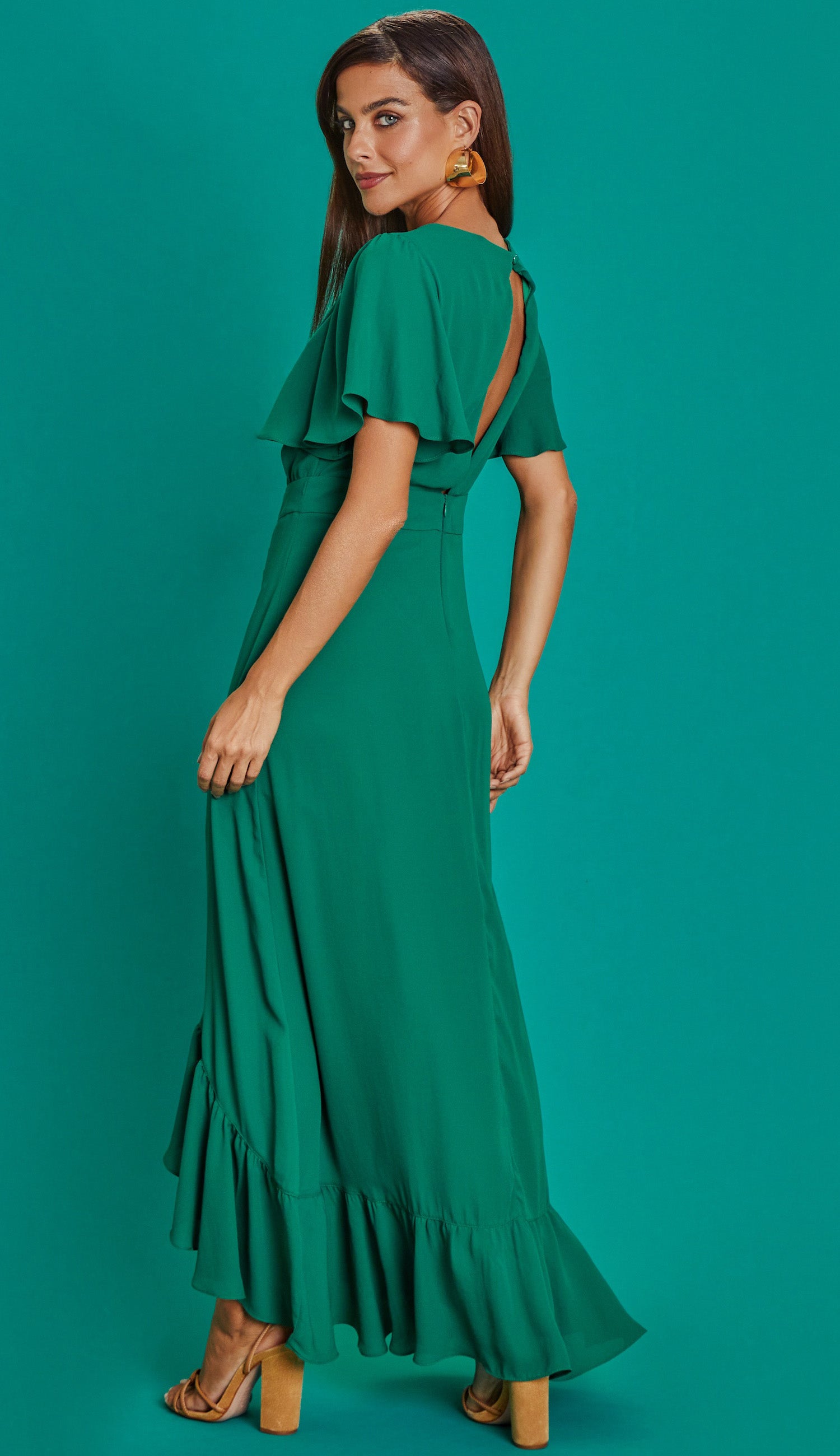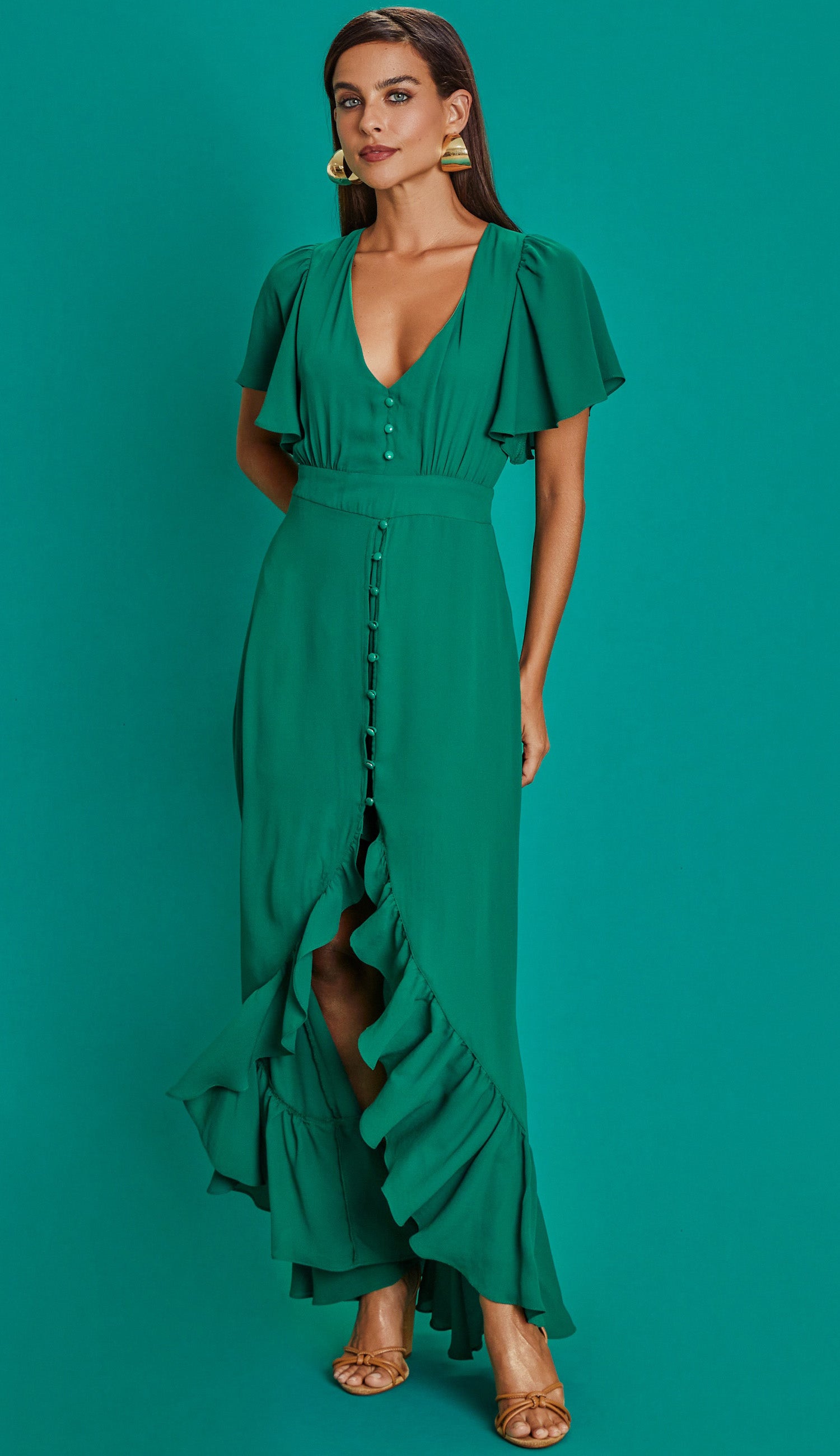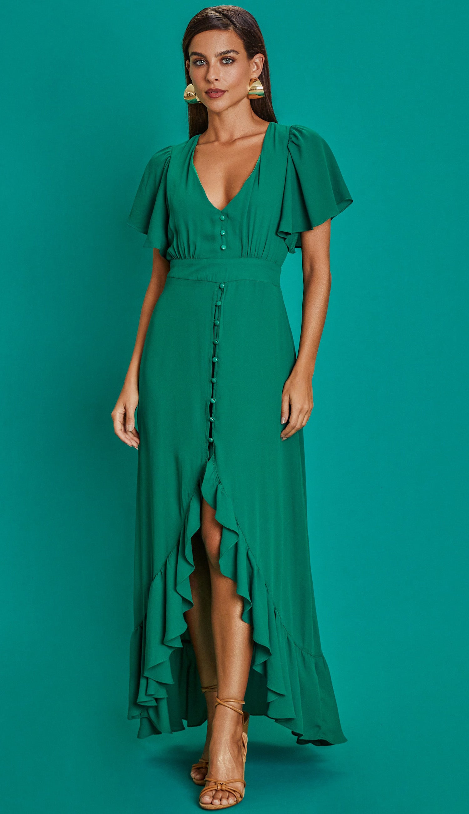 Vestido longo confeccionado em crepe com shorts e forro. Possui decote "V", delicado franzido no busto, saia mullet, shorts fixo por baixo da saia e fechamento frontal por botões esmaltados. O mood mais romântico e delicado fica por conta da manga curta godê e da fenda frontal com babados!