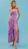 Vestido longo confeccionado em viscose twill com forro na saia. Possui decote em V, alcinhas trançadas com regulagem, franzidinhos no busto, recorte com babado diagonal na saia seguido de fenda frente-lateral e lastex franzido nas costas para melhor ajuste ao corpo.