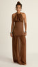 Vestido longo confeccionado em crepe leve com forro. Possui decote halter com franzidinho na gola, alcinhas compridas para amarrar na nuca com ponteiras de metal em formato de conchinha, franzidinho também na cintura deixando um aspecto blusê na parte do busto, saia com forro e justinha até a altura do quadril onde conta com recorte, pala e franzidinho com saia soltinha a partir daí e sem forro nessa região, deixando um aspecto de sutil transparência e bastante fluidez. Conta ainda com costas nuas e fechamento traseiro na saia por zíper de metal com a mesma ponteira de metal em formato de conchinha.