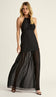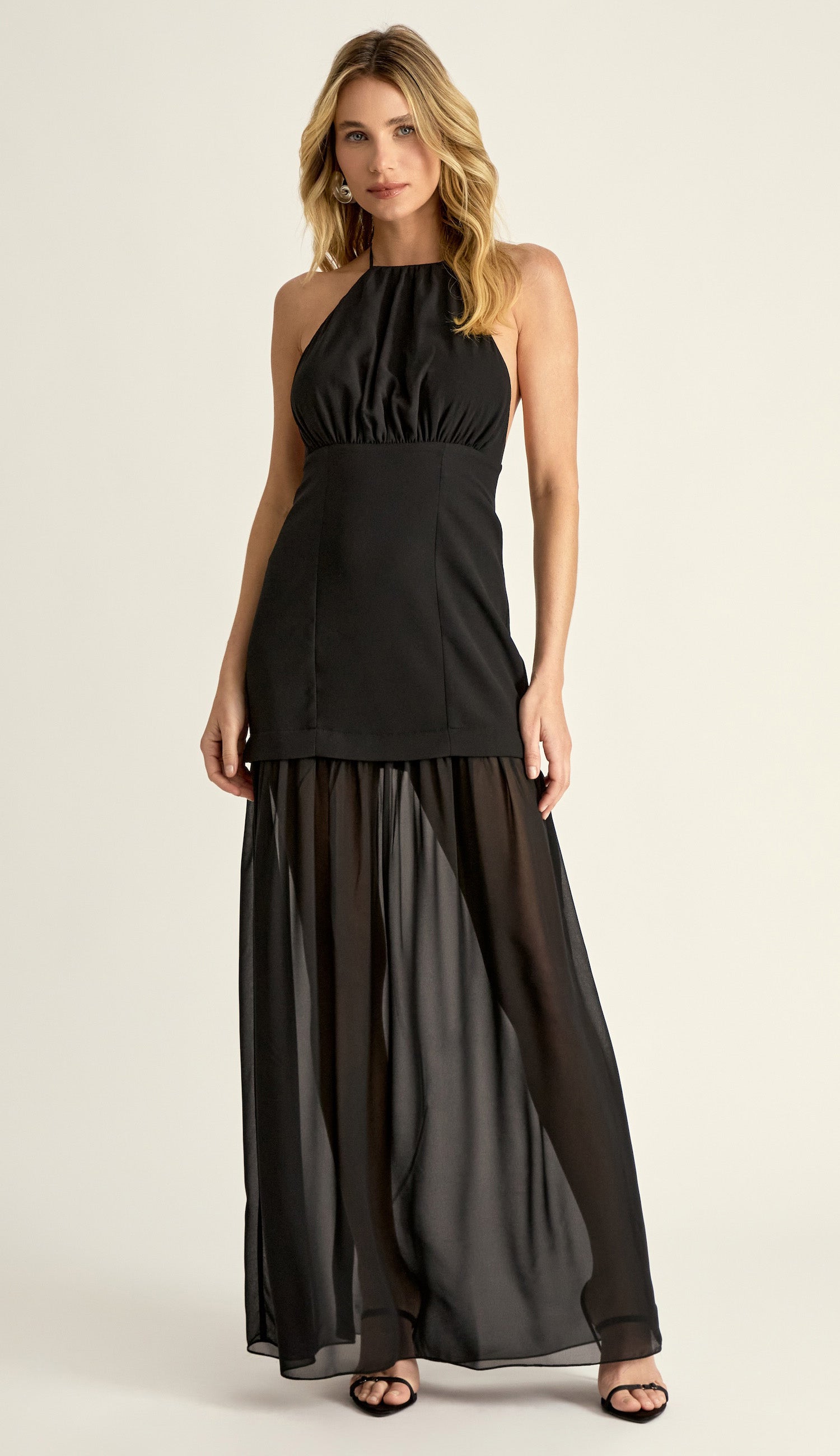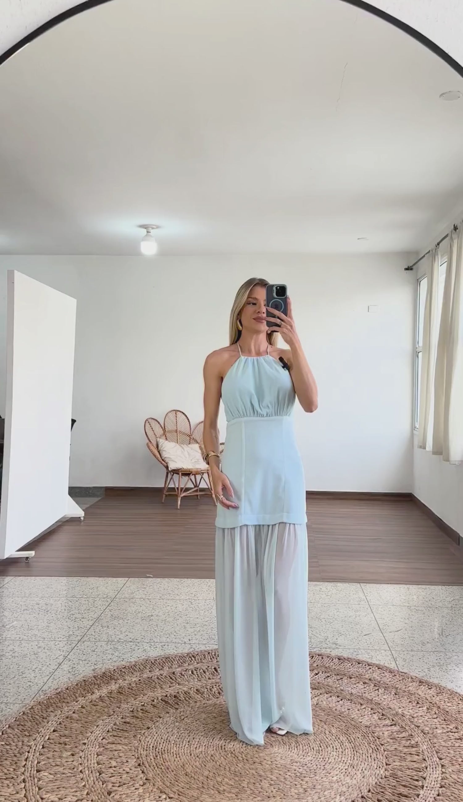 Vestido longo confeccionado em crepe leve com forro. Possui decote halter com franzidinho na gola, alcinhas compridas para amarrar na nuca com ponteiras de metal em formato de conchinha, franzidinho também na cintura deixando um aspecto blusê na parte do busto, saia com forro e justinha até a altura do quadril onde conta com recorte, pala e franzidinho com saia soltinha a partir daí e sem forro nessa região, deixando um aspecto de sutil transparência e bastante fluidez. Conta ainda com costas nuas e fechamento traseiro na saia por zíper de metal com a mesma ponteira de metal em formato de conchinha.