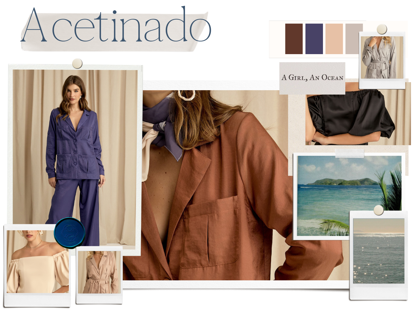 Vestido longo com forro, confeccionado em alfaiataria acetinada com efeito amassadinho. Possui decote coração com pala e recortes que modelam o busto; barbatanas logo abaixo para maior sustentação; alcinhas reguláveis; busto fixo à saia apenas por recorte frontal, deixando toda a região da cintura à mostra; lastex franzido nas costas do busto e da saia, para melhor ajuste ao corpo; pala na cintura e preguinhas frontais na saia.