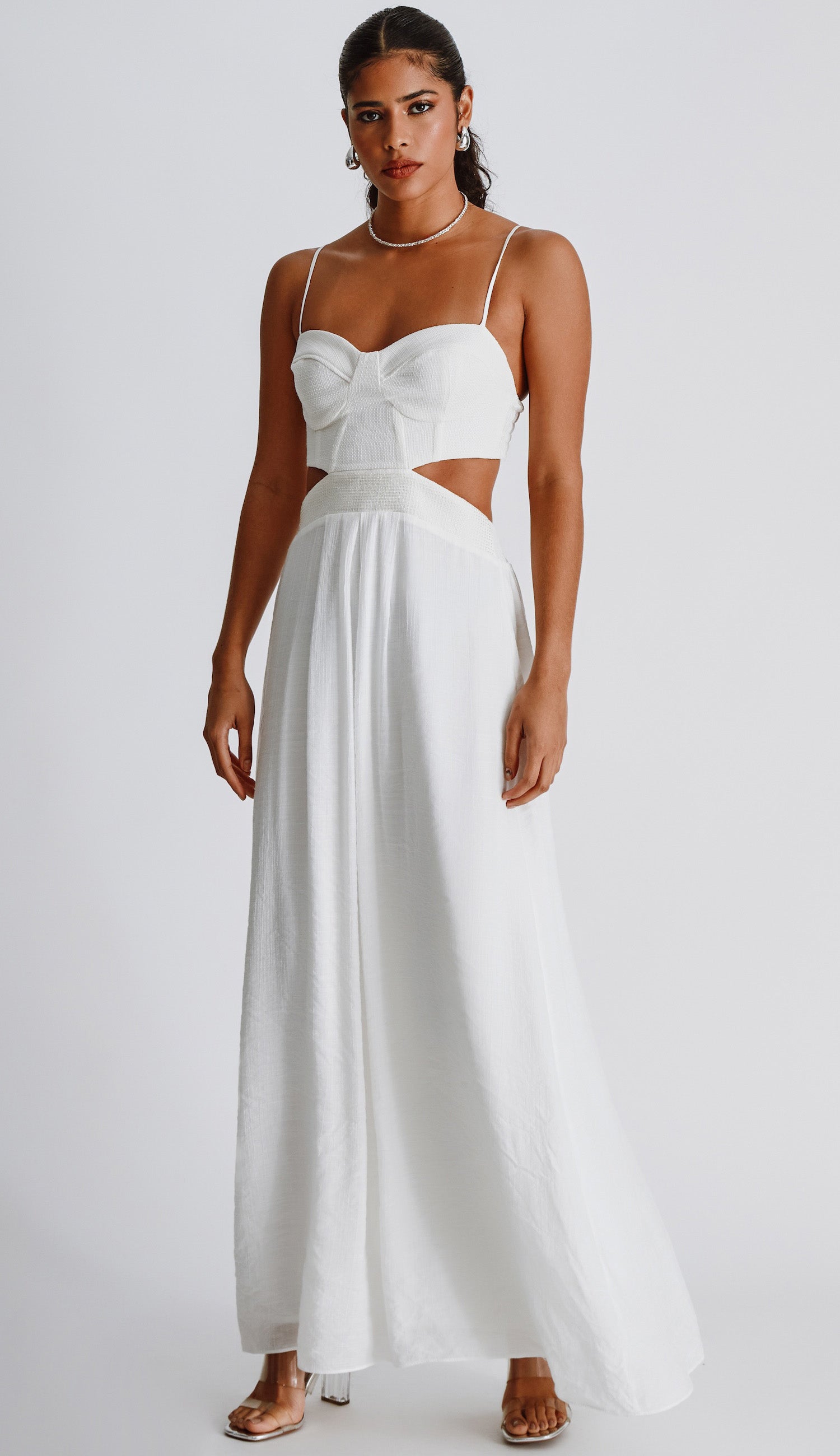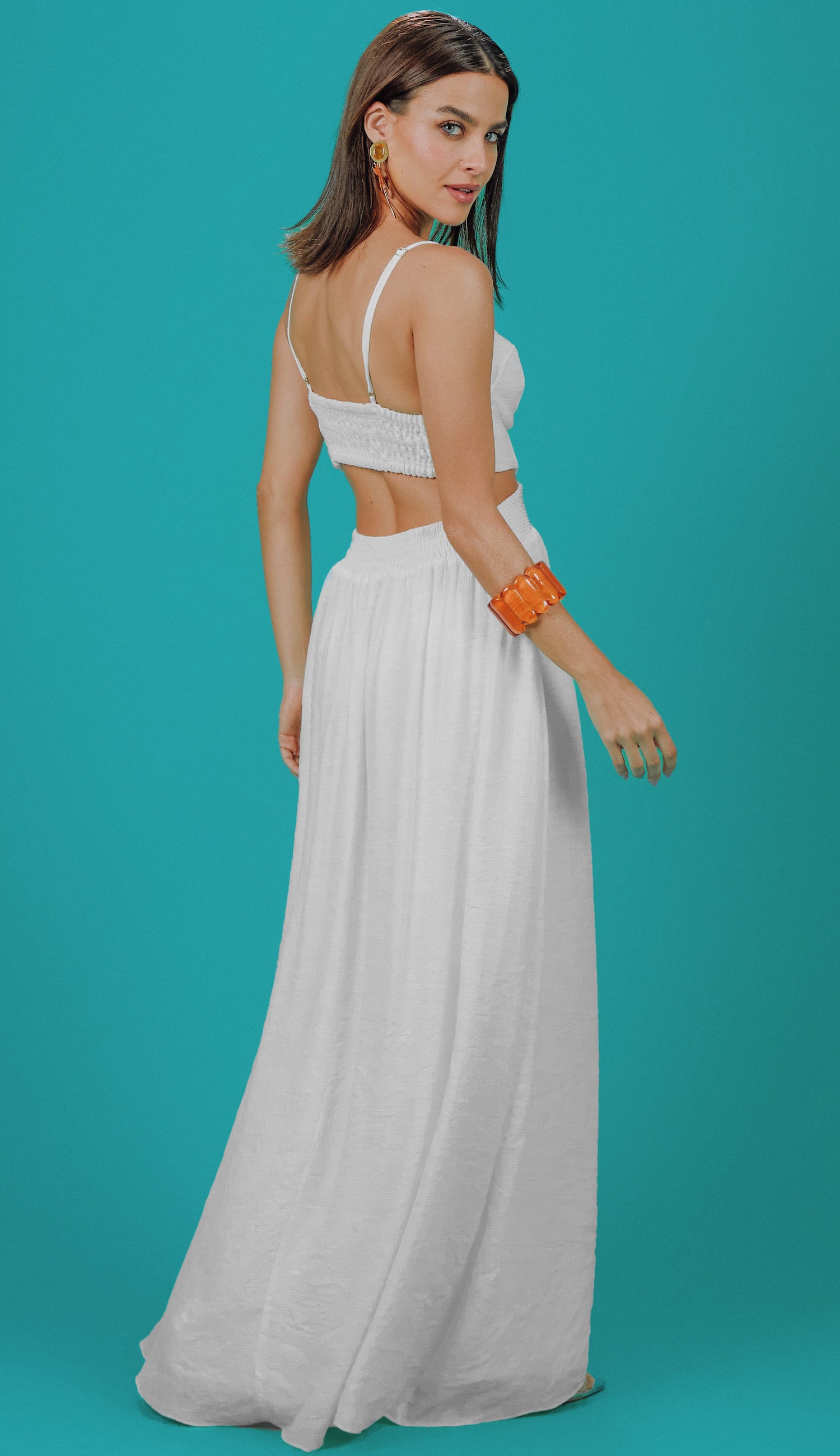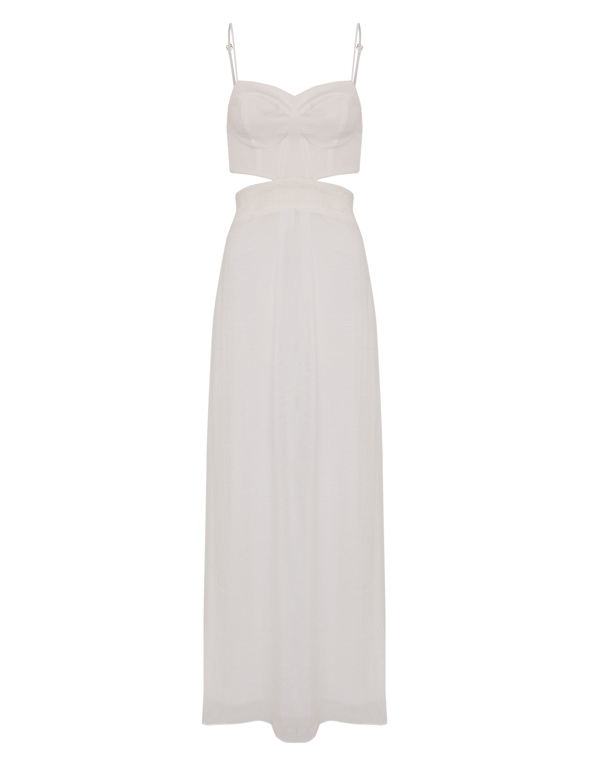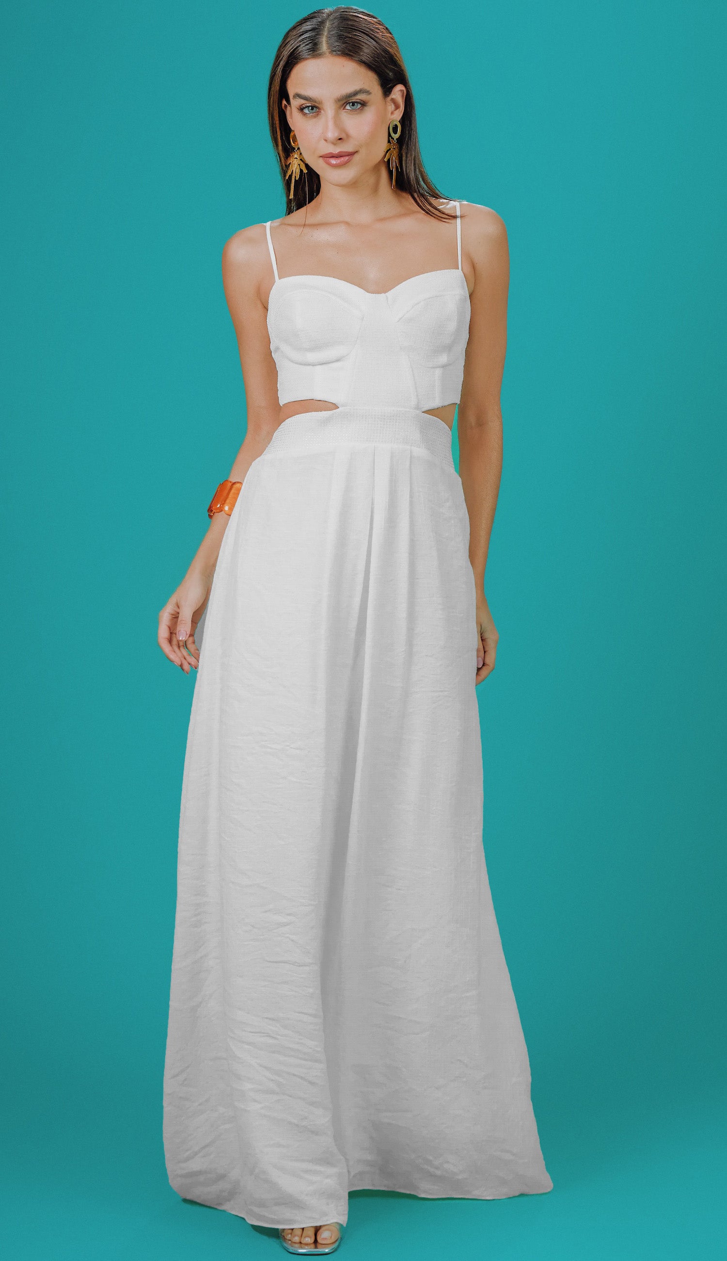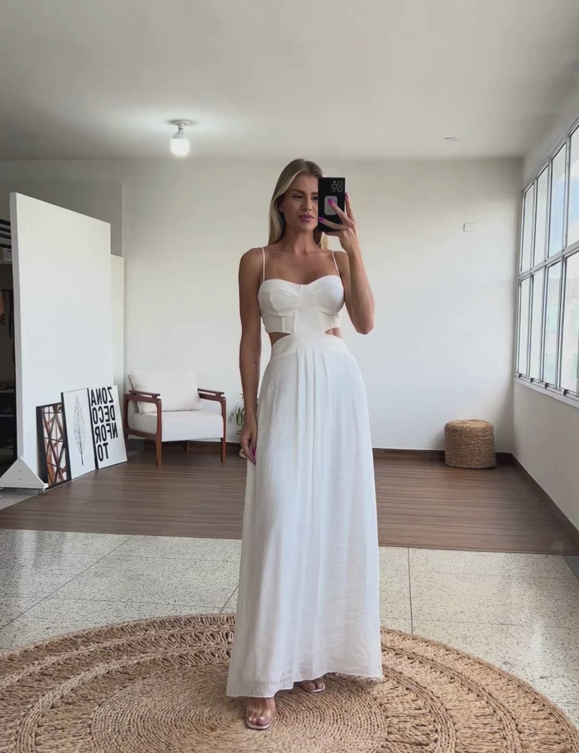 Vestido longo com forro. Busto confeccionado em tweed encorpado e saia confeccionada em poliviscose texturizada com aspecto de linho e efeito amassadinho. Possui decote coração com pala e recortes que modelam o busto; barbatanas logo abaixo para maior sustentação; alcinhas reguláveis; busto fixo à saia apenas por recorte frontal, deixando toda a região da cintura à mostra; lastex franzido nas costas do busto e da saia, para melhor ajuste ao corpo; pala na cintura, toda com aplicação de strass delicado e preguinhas frontais na saia.