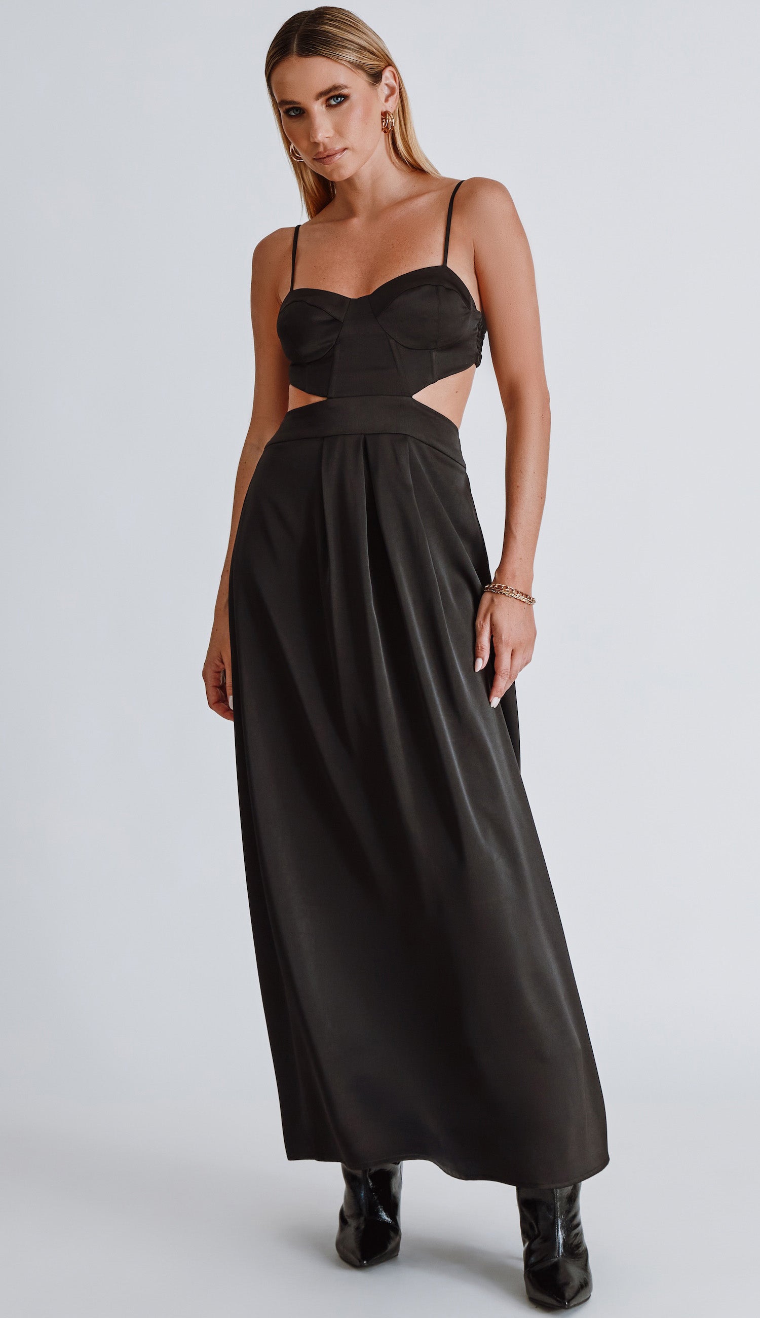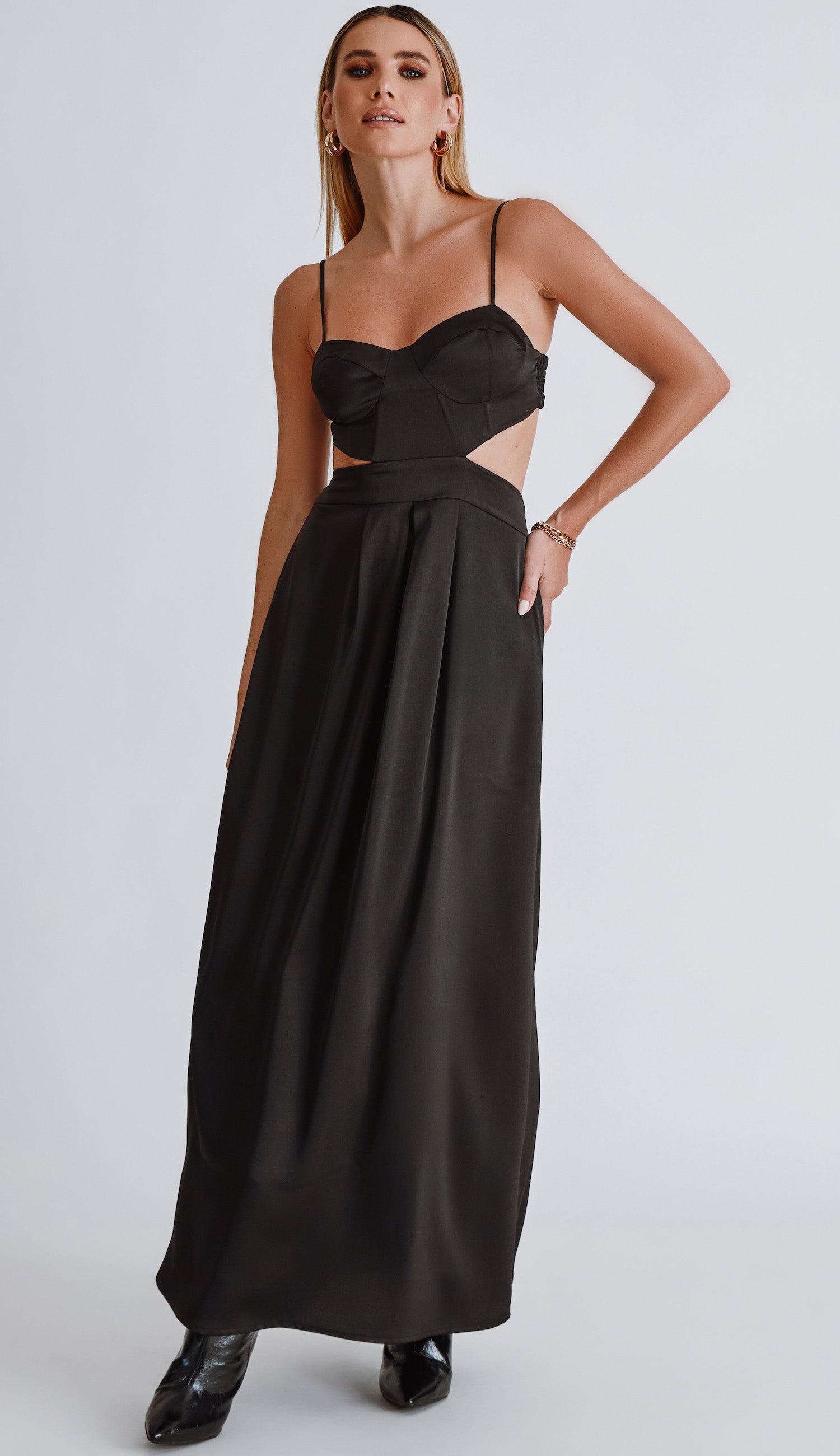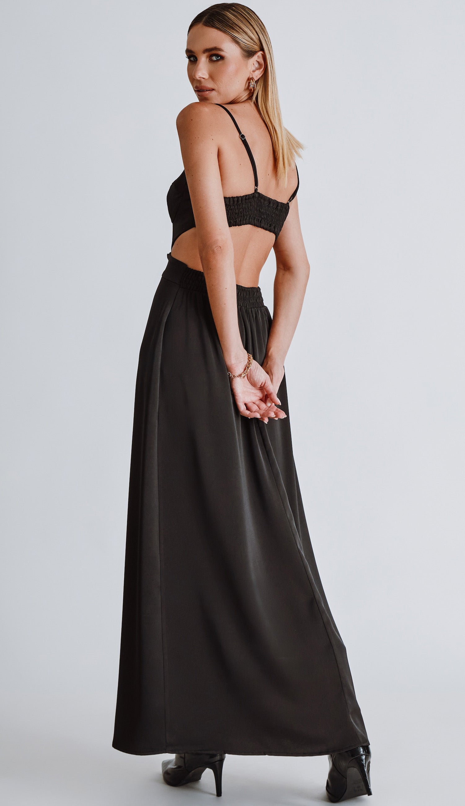 Vestido longo confeccionado em alfaiataria acetinada com forro. Possui decote coração com pala e recortes que modelam o busto; barbatanas logo abaixo para maior sustentação; alcinhas reguláveis; busto fixo à saia apenas por recorte frontal, deixando toda a região da cintura à mostra; lastex franzido nas costas do busto e da saia, para melhor ajuste ao corpo; pala na cintura e preguinhas frontais na saia.
