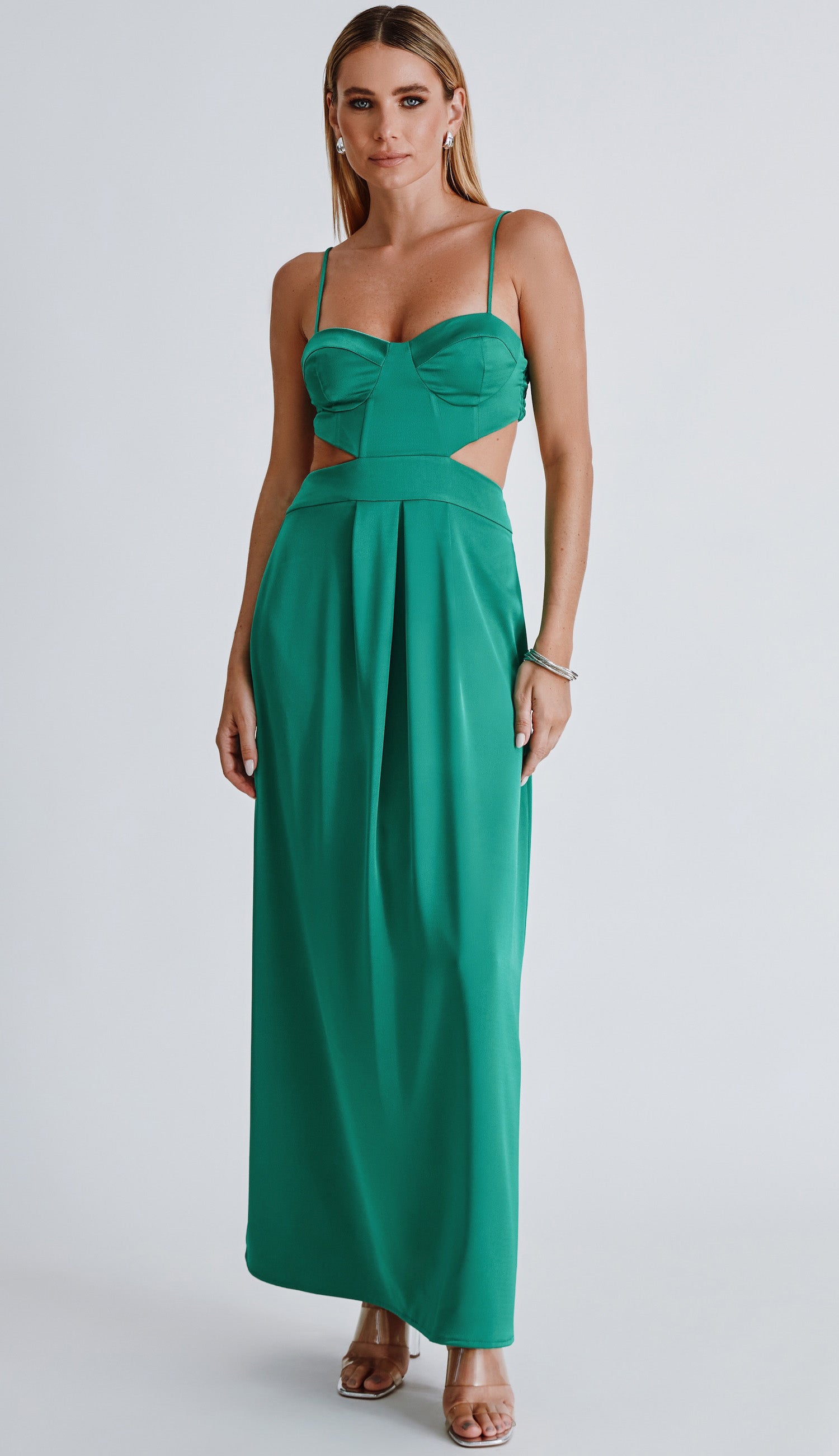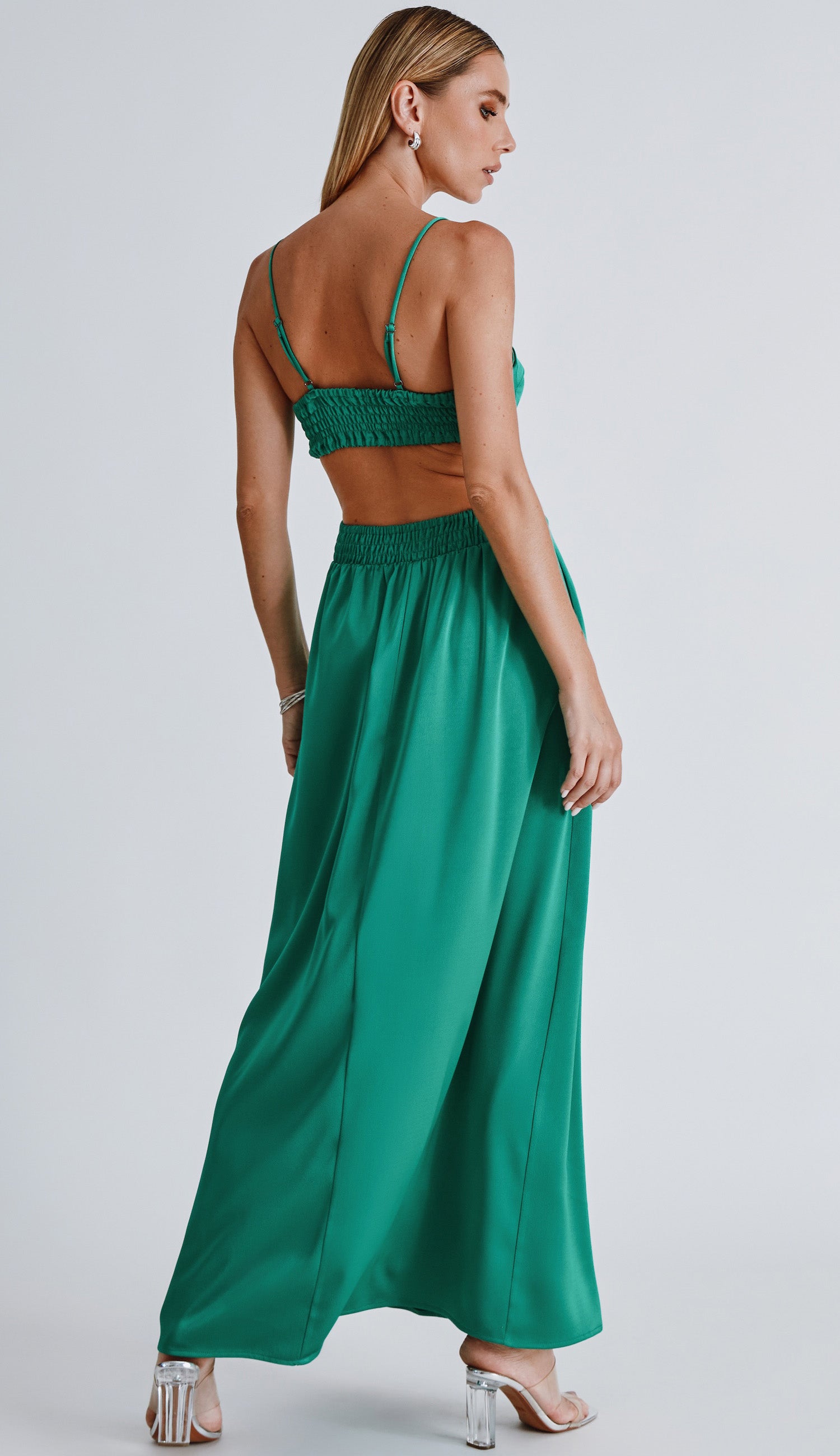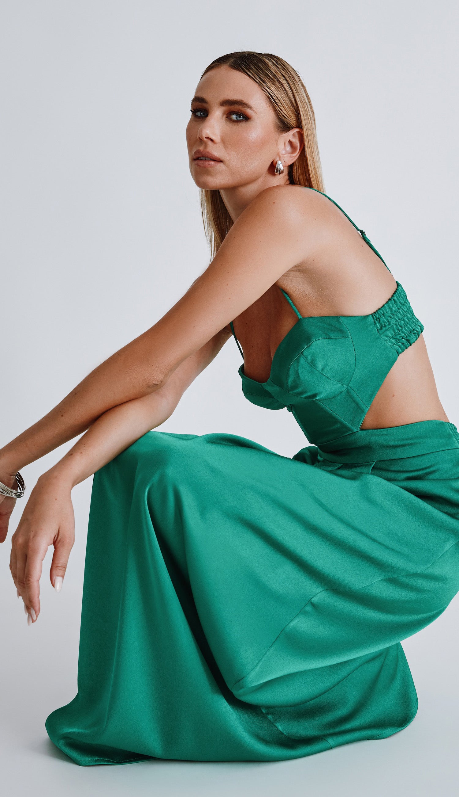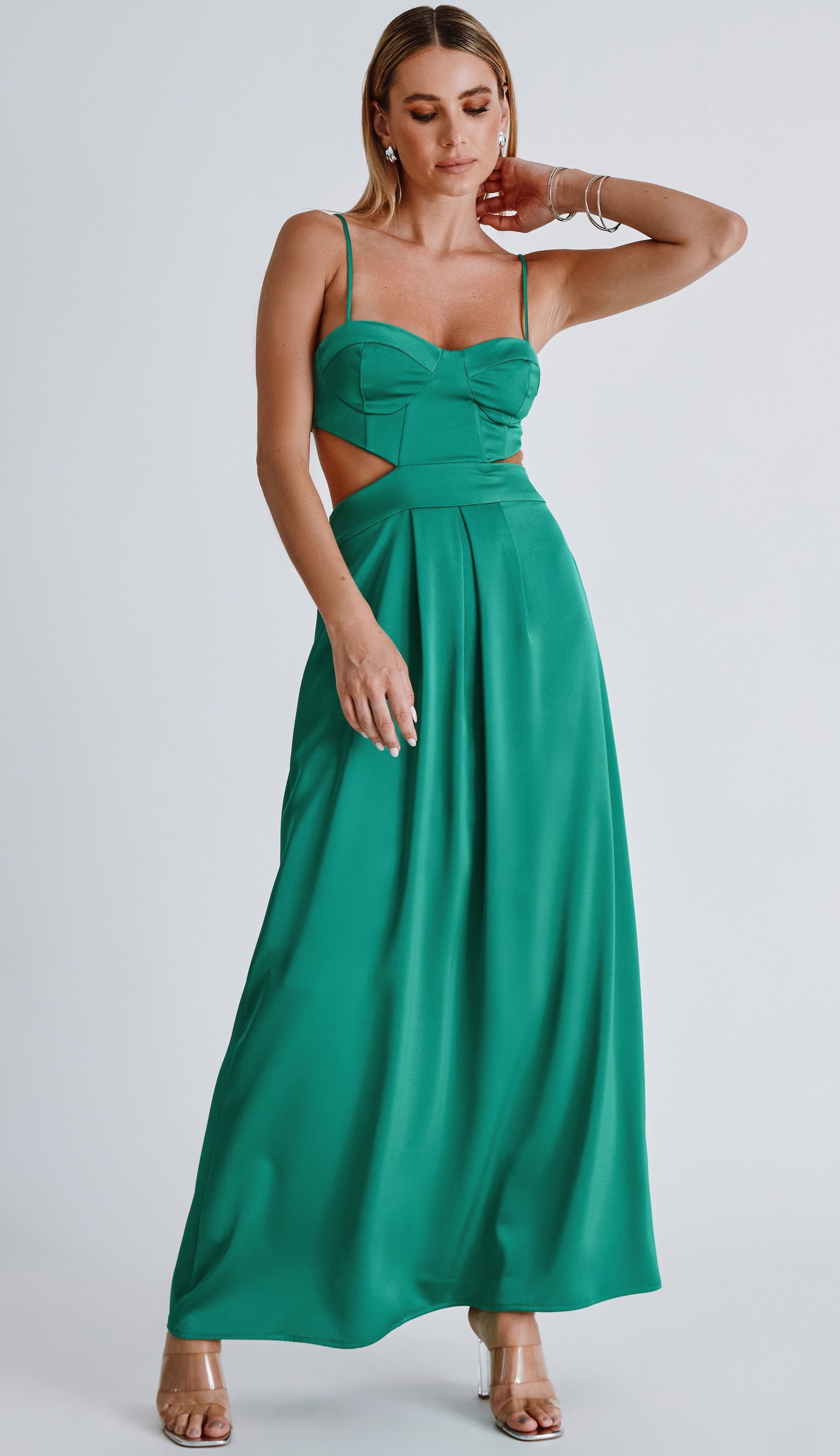 Vestido longo confeccionado em alfaiataria acetinada com forro. Possui decote coração com pala e recortes que modelam o busto; barbatanas logo abaixo para maior sustentação; alcinhas reguláveis; busto fixo à saia apenas por recorte frontal, deixando toda a região da cintura à mostra; lastex franzido nas costas do busto e da saia, para melhor ajuste ao corpo; pala na cintura e preguinhas frontais na saia.