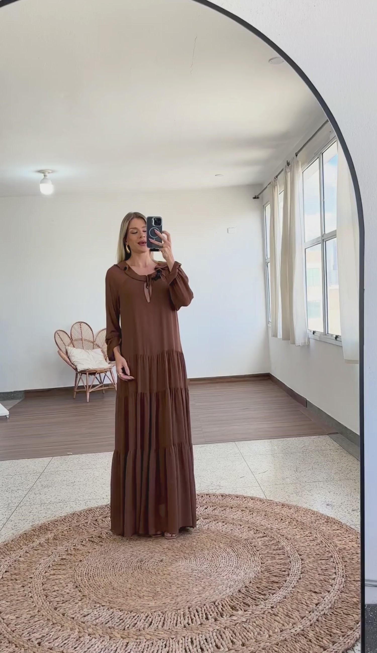 Vestido longo amplo confeccionado em crepe leve com forro longo. Possui decote redondo com aberturinha em V central e tirinha fixa no decote com ponteiras de metal em formato de conchinha para amarração; pala em babadinho dobrada na gola, mangas longas com elástico no punho criando um babadinho também e conta ainda com recortes e franzidos em camadas na saia, estilo três marias.
