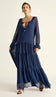 Vestido longo amplo confeccionado em crepe leve com forro longo. Possui decote redondo com aberturinha em V central e tirinha fixa no decote com ponteiras de metal em formato de conchinha para amarração; pala em babadinho dobrada na gola, mangas longas com elástico no punho criando um babadinho também e conta ainda com recortes e franzidos em camadas na saia, estilo três marias.