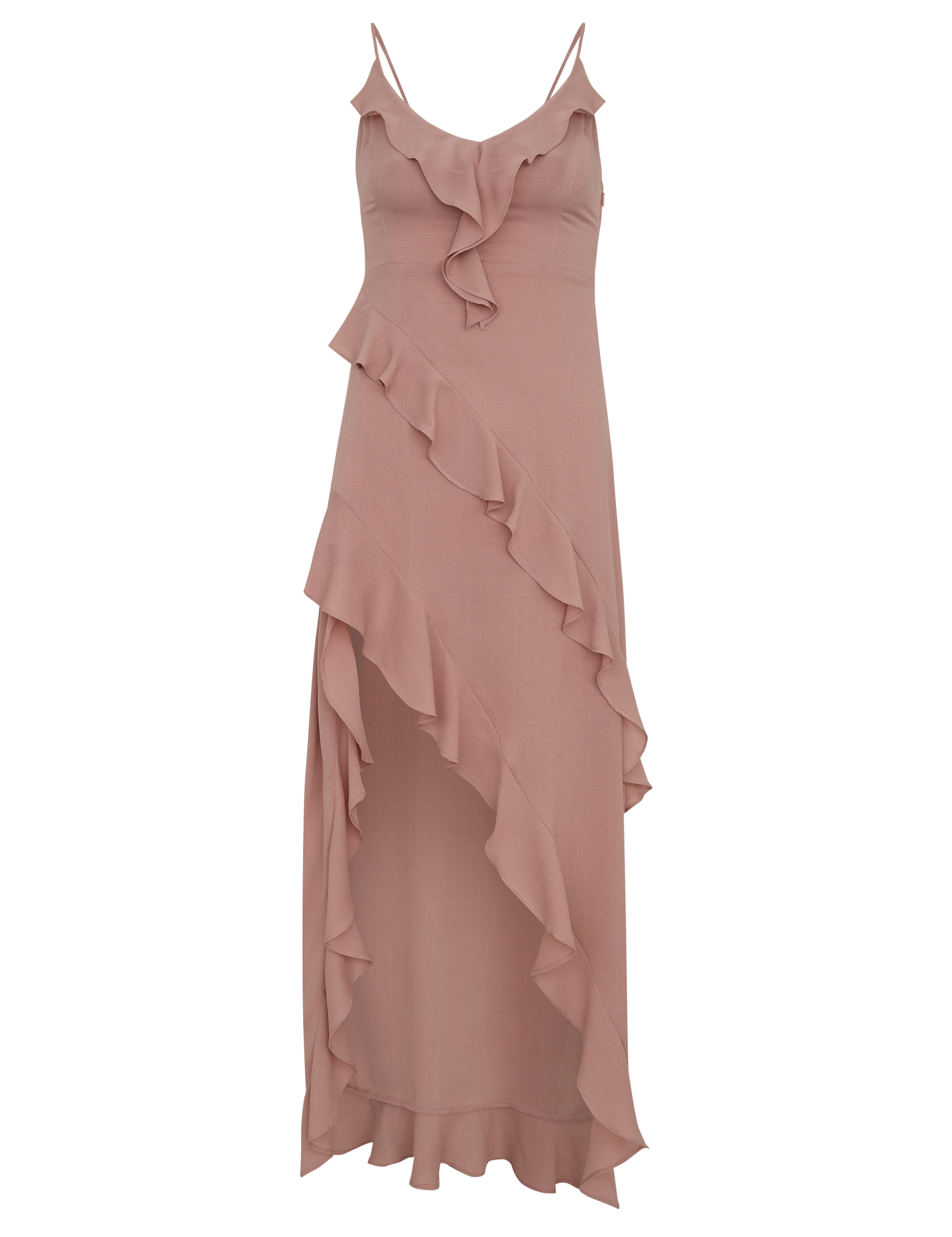 Vestido mullet com forro, confeccionado em crepe texturizado mais encorpadinho com aspecto de linho. Possui decote em V com babados na frente, alcinhas reguláveis, fechamento lateral por zíper invisível, modelagem ajustada e babados diagonais na saia.