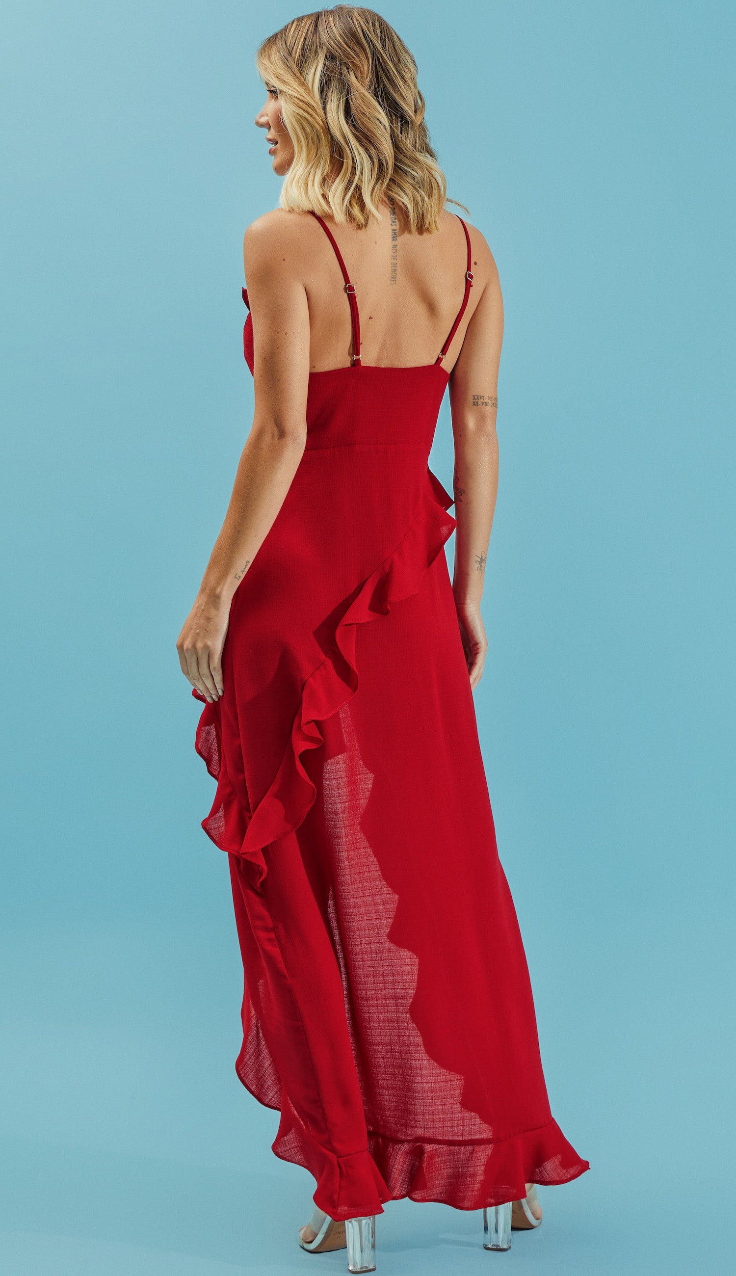 Vestido mullet com forro, confeccionado em crepe texturizado mais encorpadinho com aspecto de linho. Possui decote em V com babados na frente, alcinhas reguláveis, fechamento lateral por zíper invisível, modelagem ajustada e babados diagonais na saia.