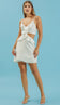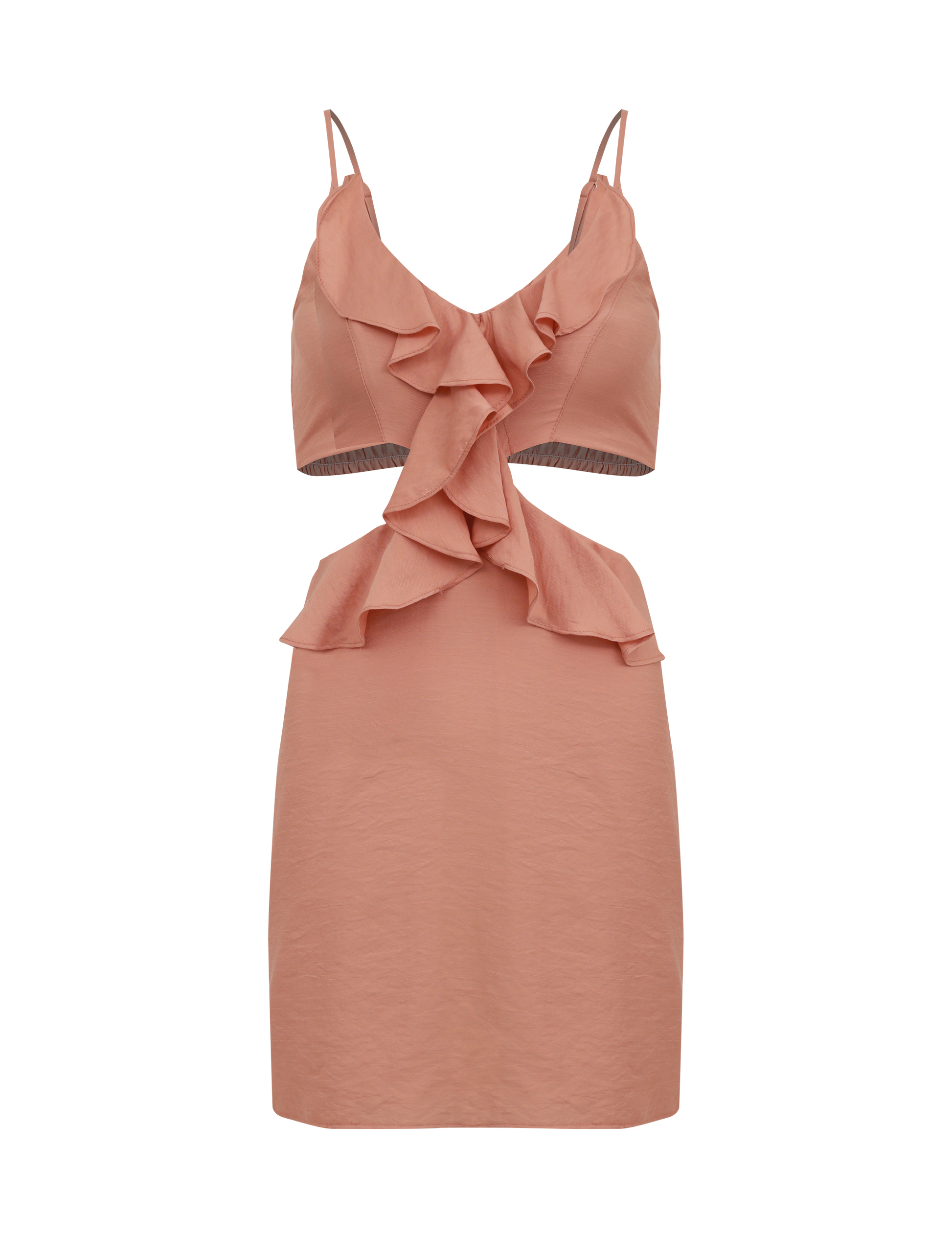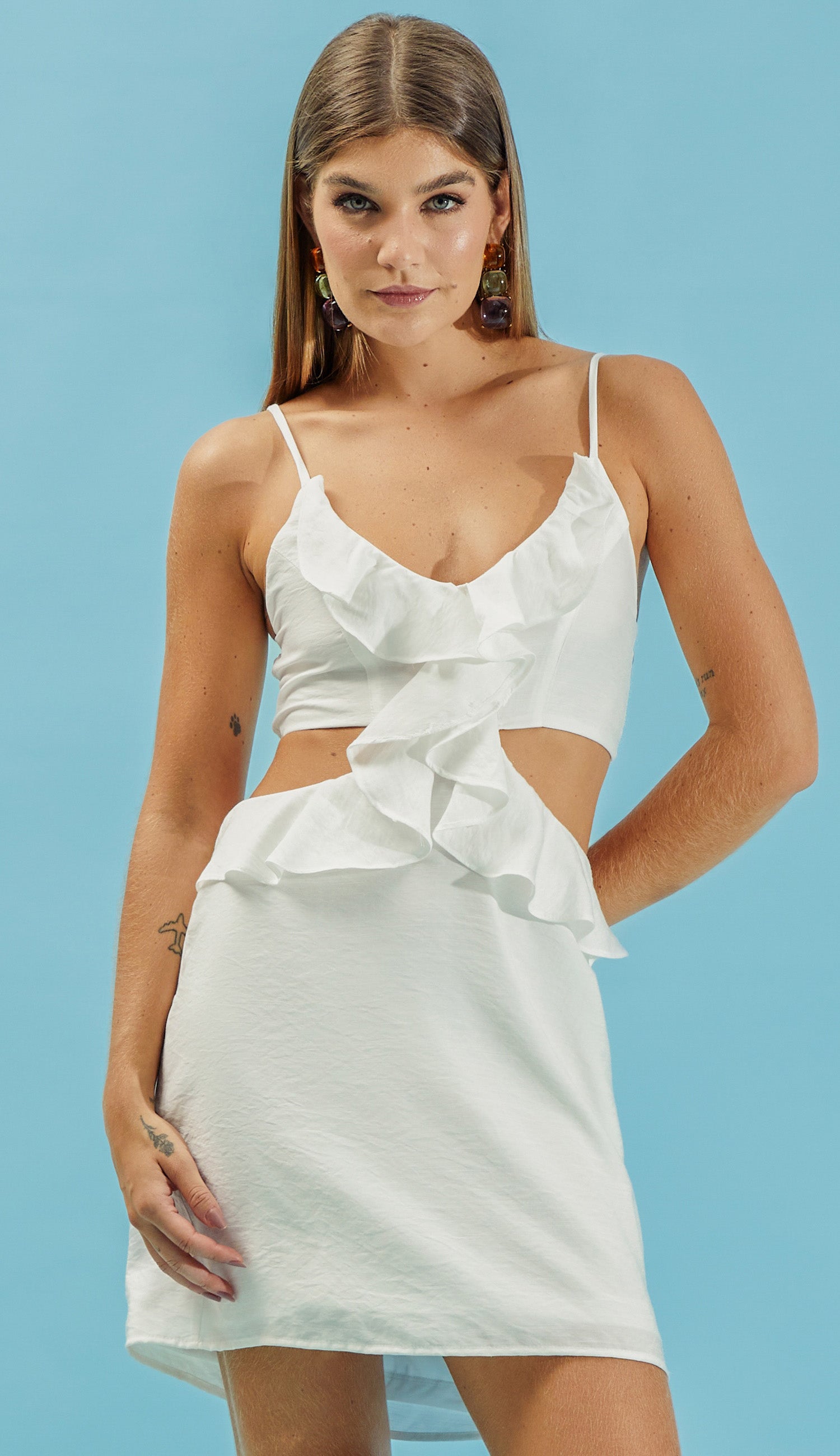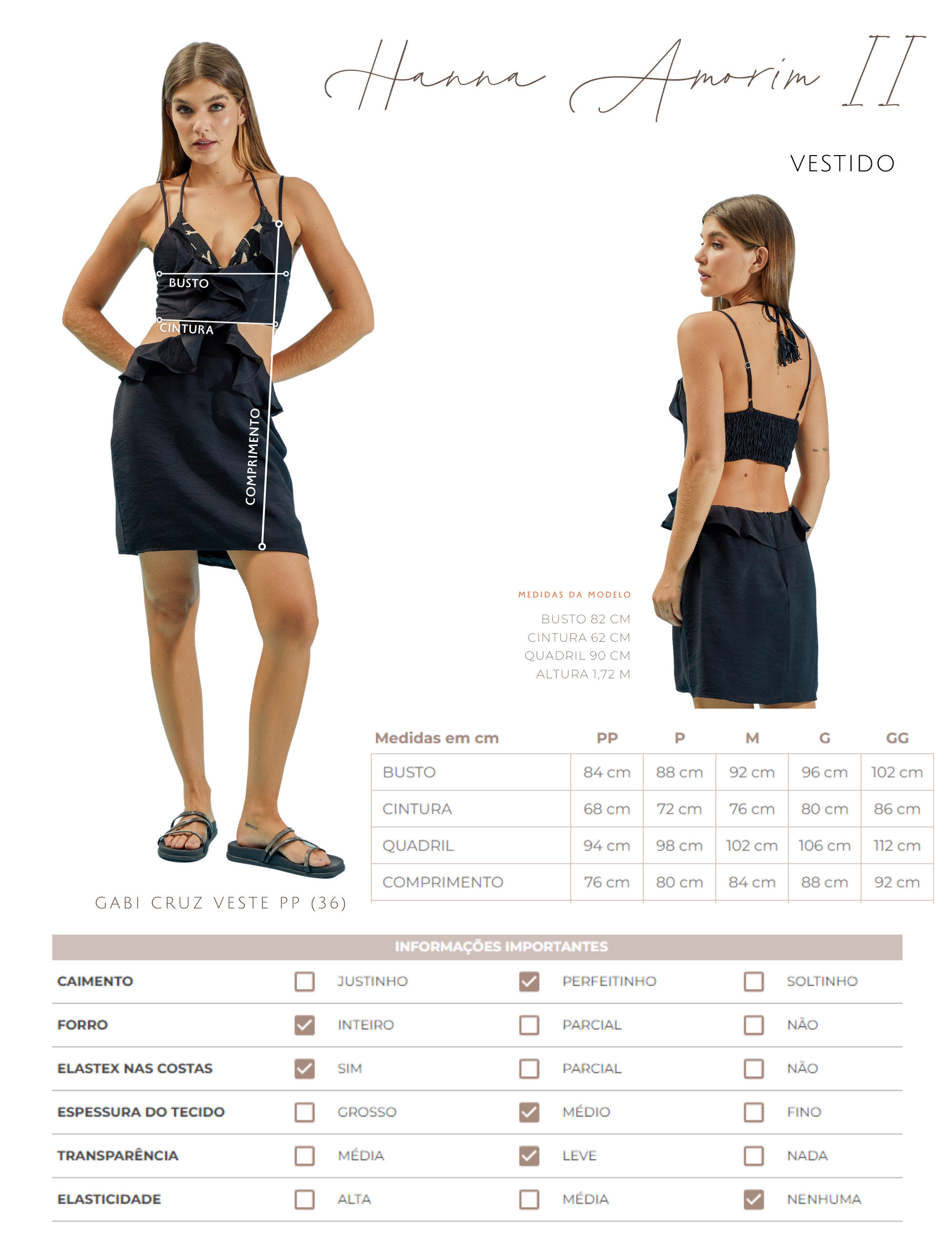 Vestido curto com forro; confeccionado em poliviscose com aspecto de liocel, aparência amassadinha e efeito levemente cintilante no tecido. Possui decote em U, alcinhas reguláveis, busto fixo à saia apenas por recorte frontal, deixando toda a região da cintura à mostra; aplicação de babado no decote e em todo o recorte da cintura; lastex franzido nas costas do busto para melhor ajuste ao corpo e elástico franzido nas costas da saia, junto com fechamento traseiro por zíper invisível. O aspecto de 'tecido nobre' dá um ar sofisticado ao look.