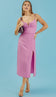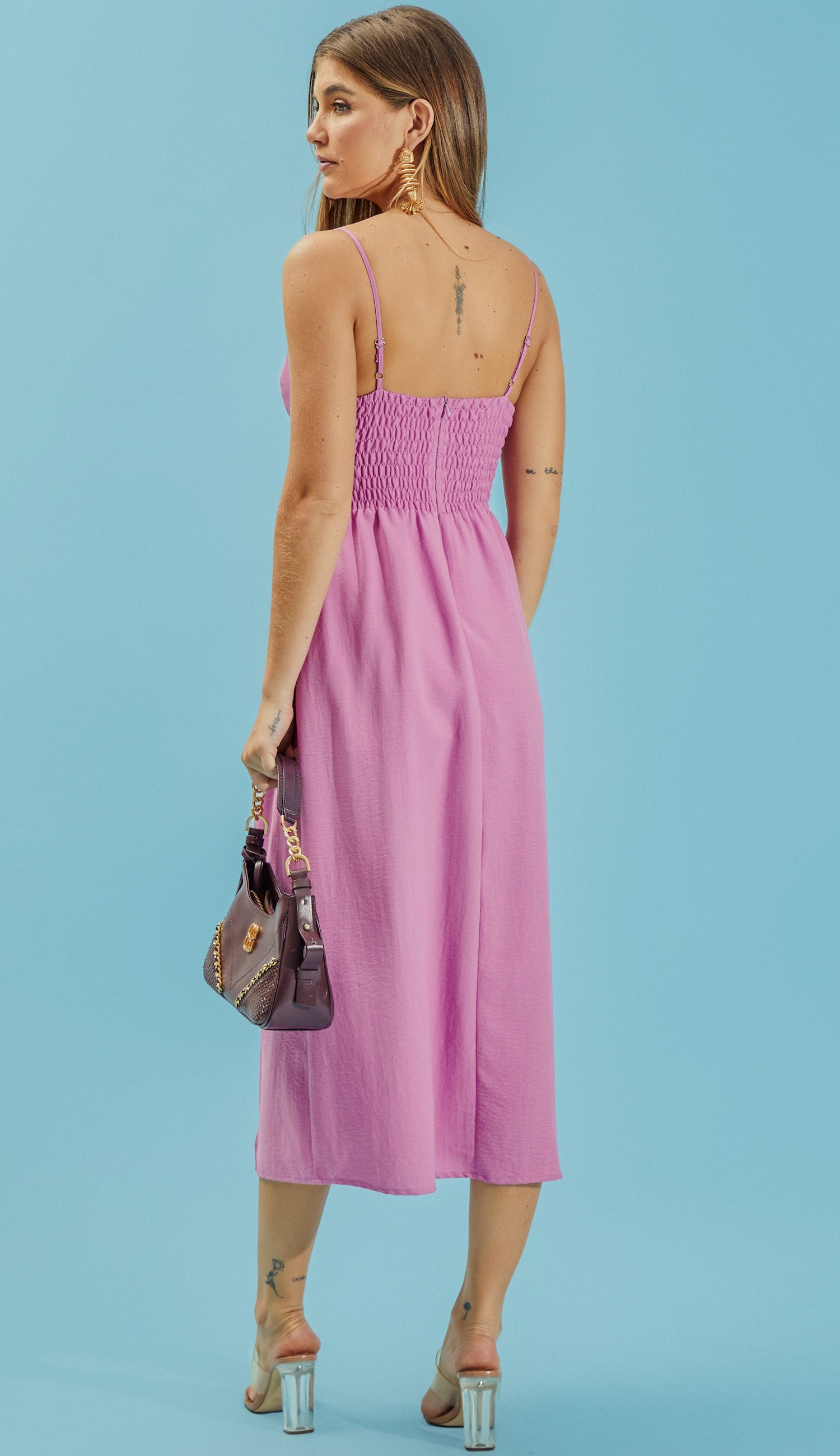 Vestido midi com forro, confeccionado em poliéster com aspecto de liocel e efeito amassadinho. Possui decote princesa com mini abertura em V estruturada no meio, alcinhas reguláveis, recortes e franzidinhos que modelam o busto, pala na cintura, fechamento traseiro por zíper invisível, detalhe de lastex nas costas para maior conforto e recorte com fenda lateral. O tecido garante praticidade e elegância, pois, devido à sua composição, não amassa facilmente e o aspecto de 'tecido nobre' dá um ar sofisticado ao look.