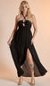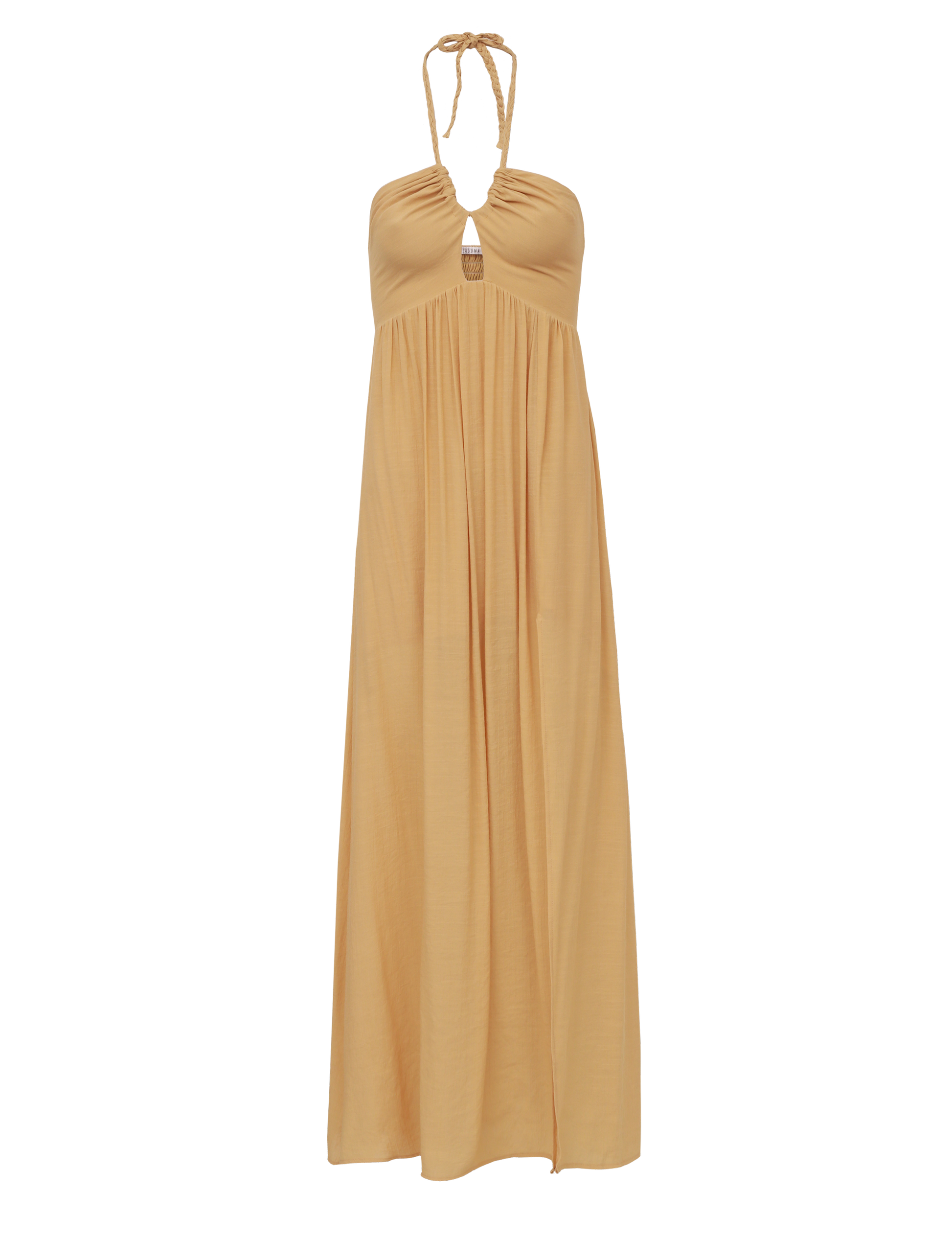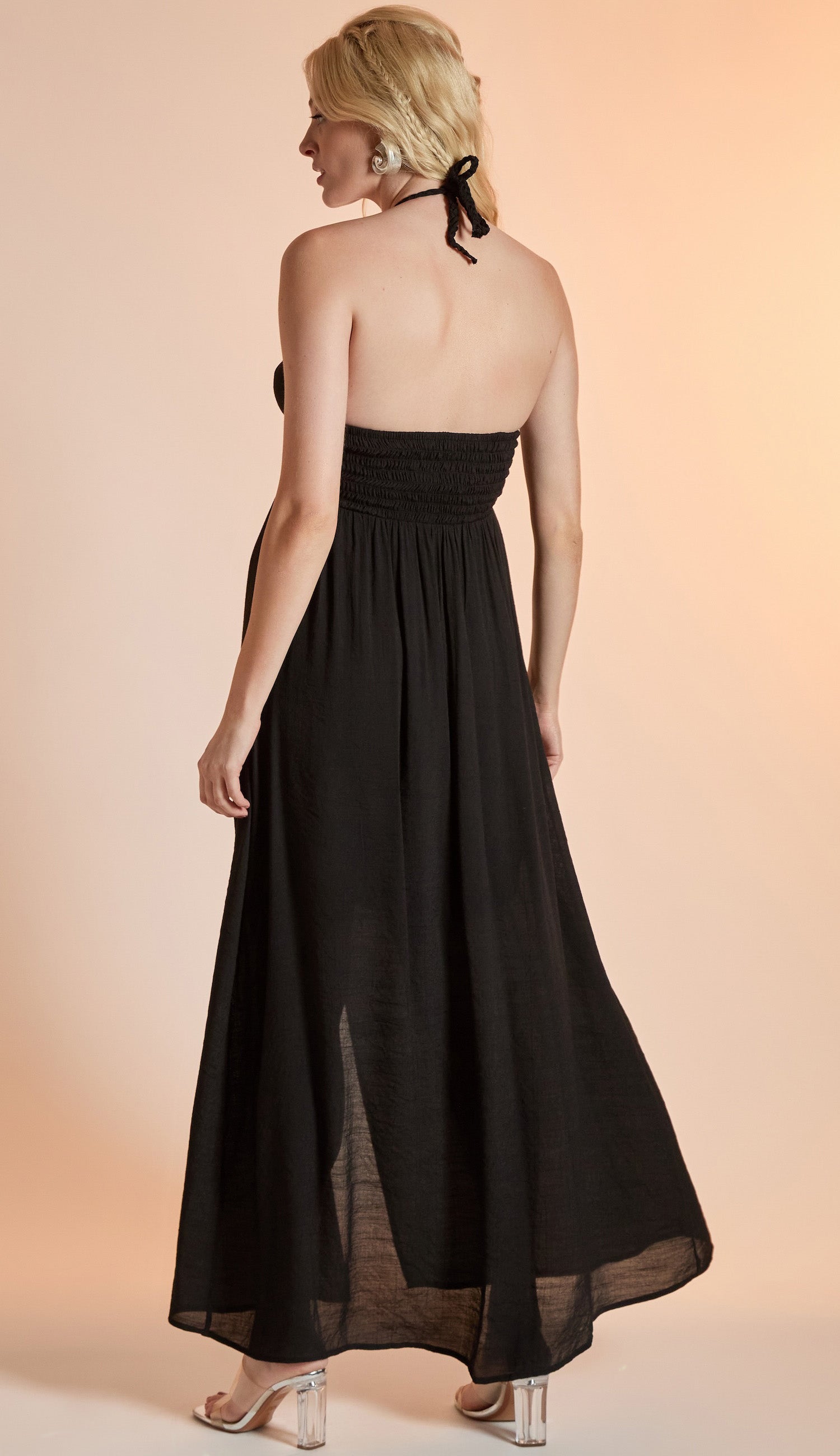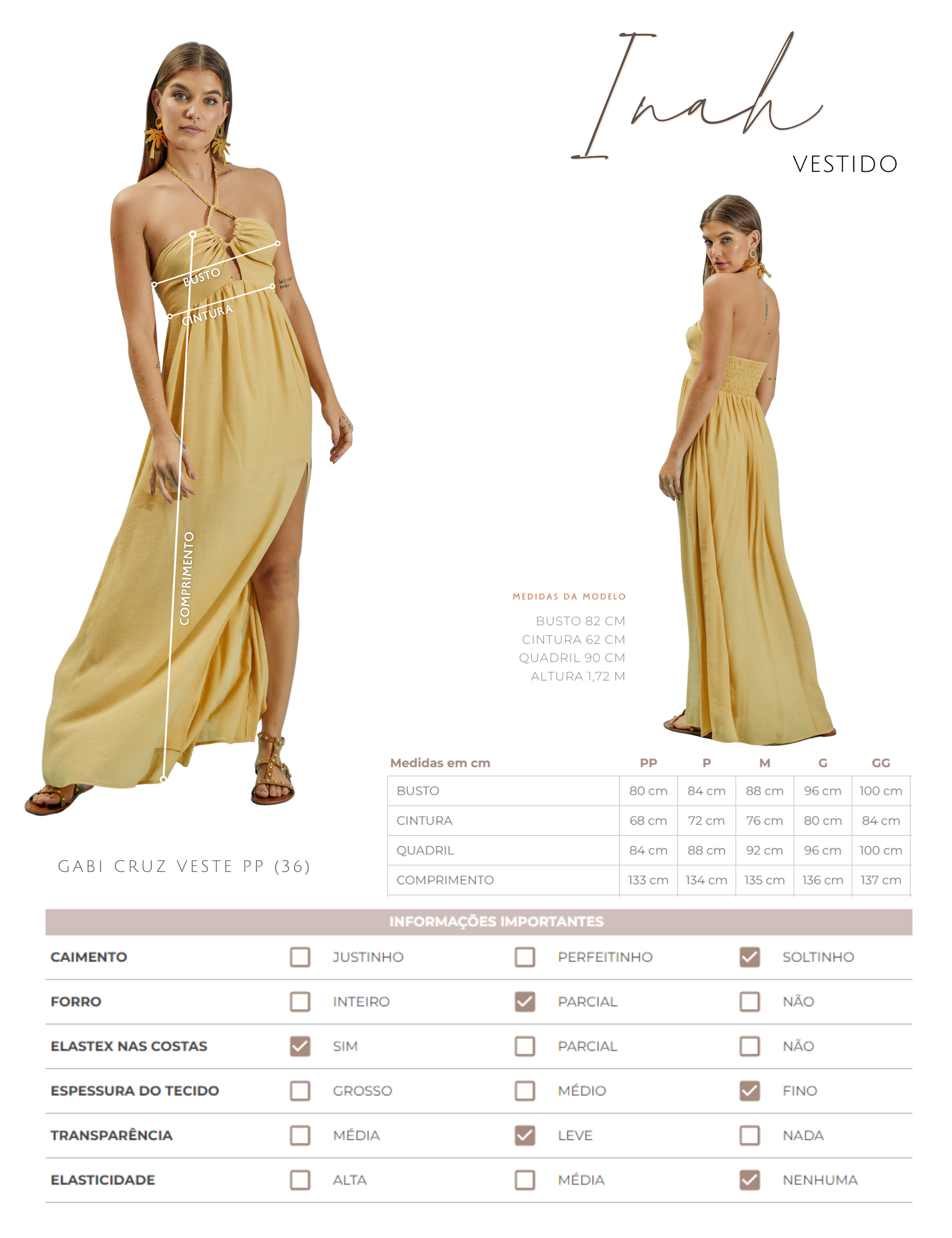 Vestido longo com forro, confeccionado em poliviscose texturizada com aspecto de linho e efeito amassadinho. Possui decote aberto com alças trançadas reguláveis que são embutidas no busto, deixando um detalhe franzido super charmoso. Conta ainda com lastex nas costas para maior conforto e fenda frontal na saia.